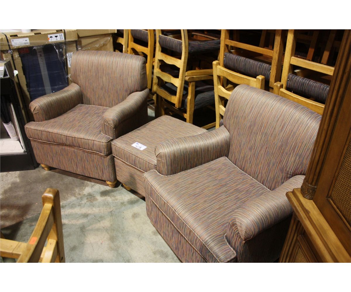 2 FABRIC PADDED ARM CHAIRS & OTTOMAN
