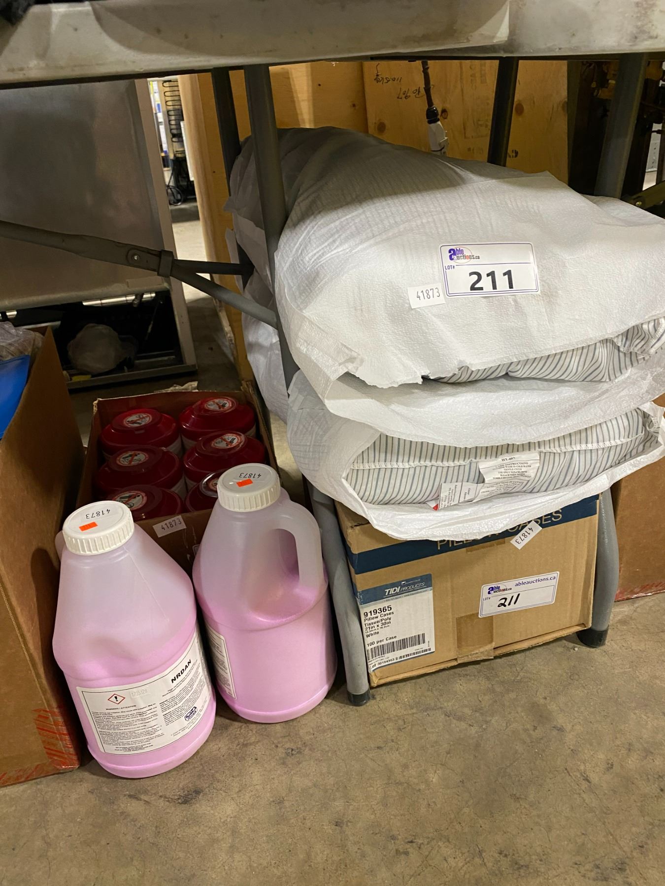 2 FIRST AID ROOM PILLOWS, BOX OF DISPOSABLE PILLOW CASES, 6 ANTI BACTERIAL ALCOHOL WIPES CONTAINERS AND 2 BOTTLES OF NRDAN HIGH PERFORMANCE ACID NEUTRALIZER