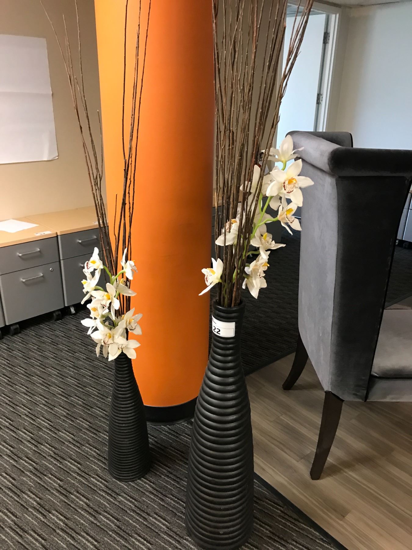 2 FLOOR VASES WITH FAUX ORCHIDS AND WILLOW BRANCHES