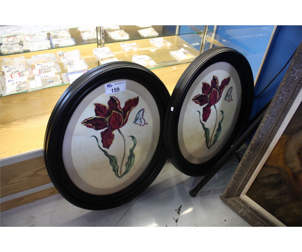 2 FRAMED OVAL FLORAL AND BUTTERFLY PICTURES