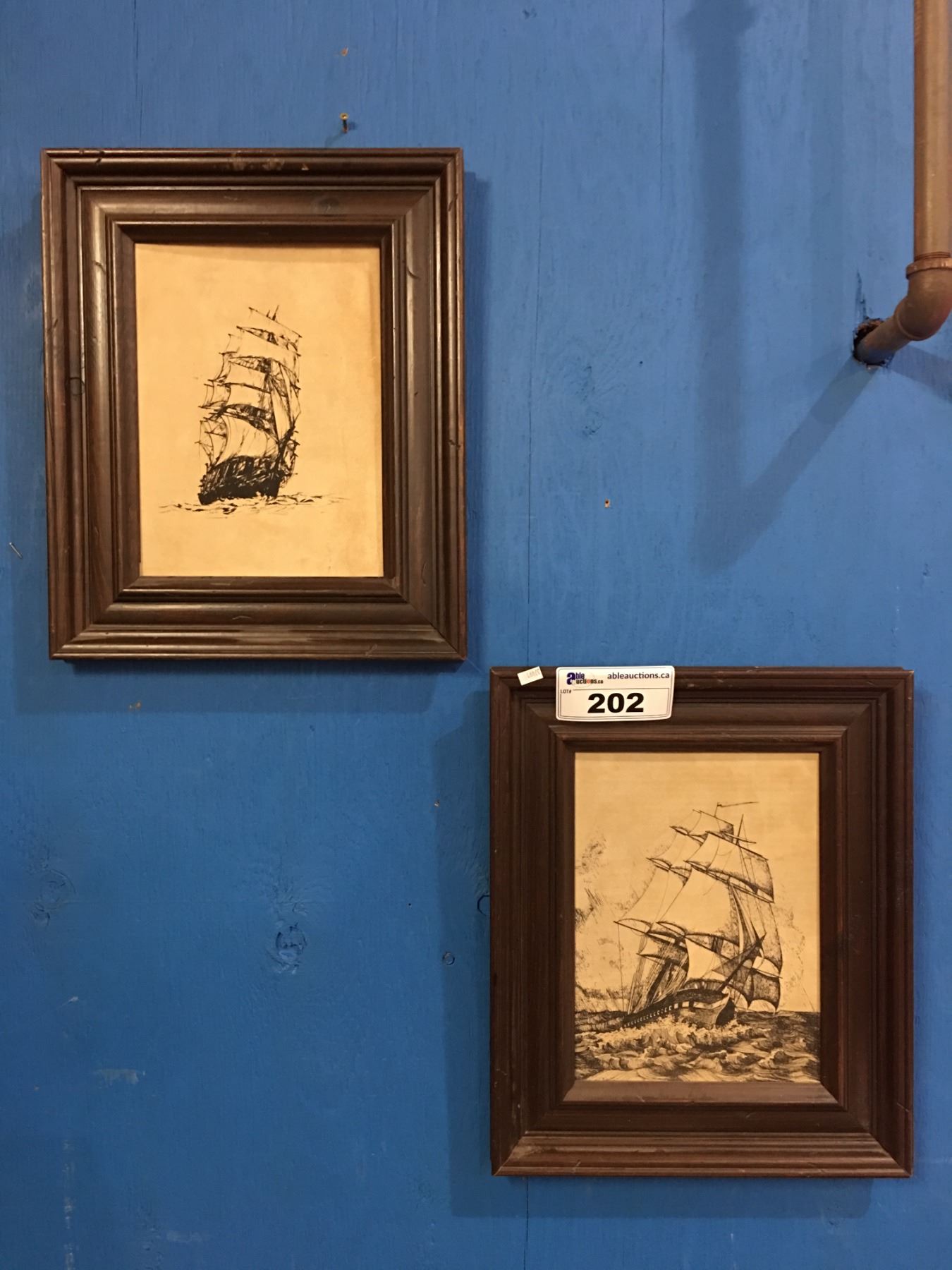 2 FRAMED SAILING SHIP PRINTS ON LEATHER