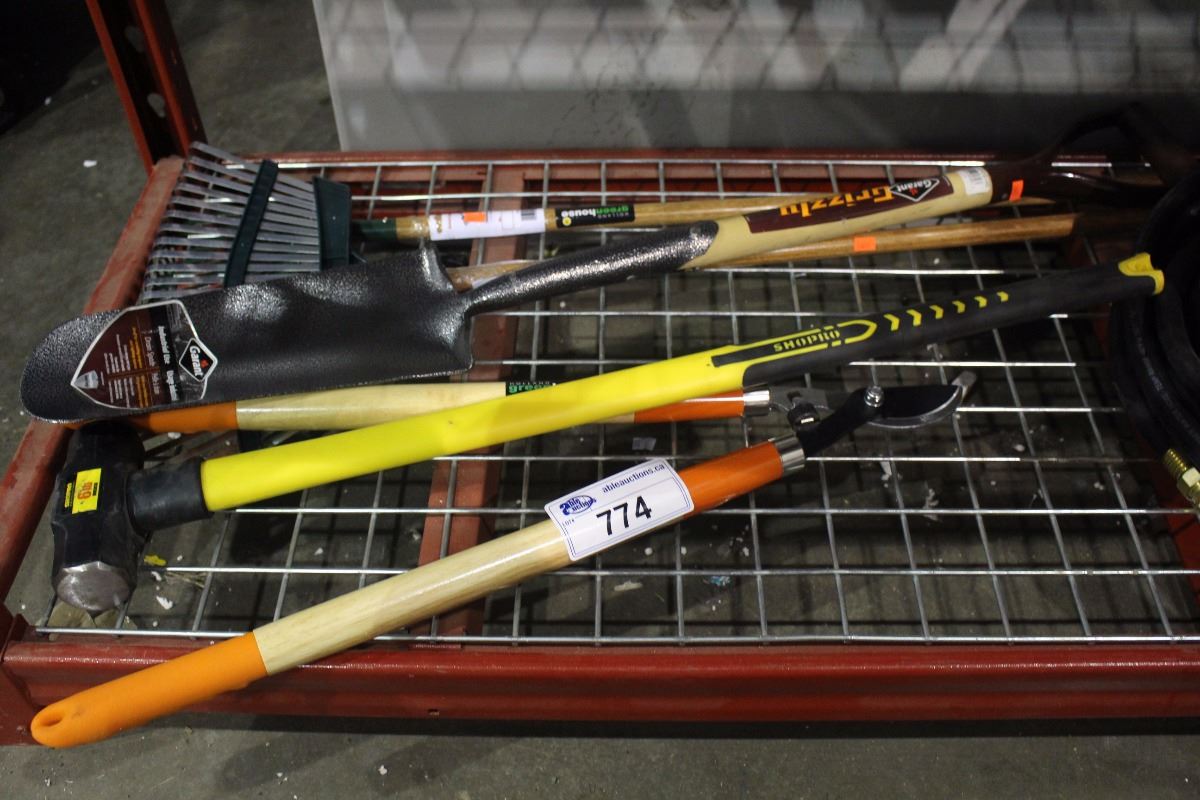 2 GARDEN RAKES, A SHOVEL, SLEDGEHAMMER AND PRUNER