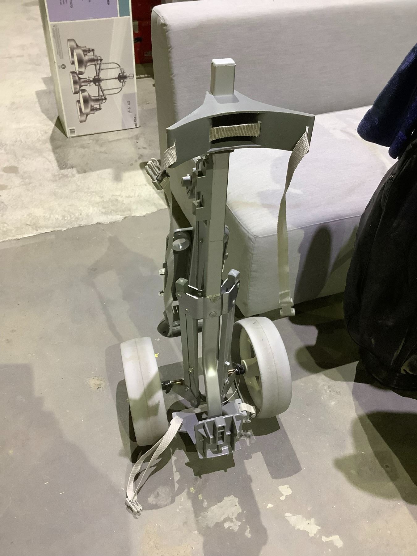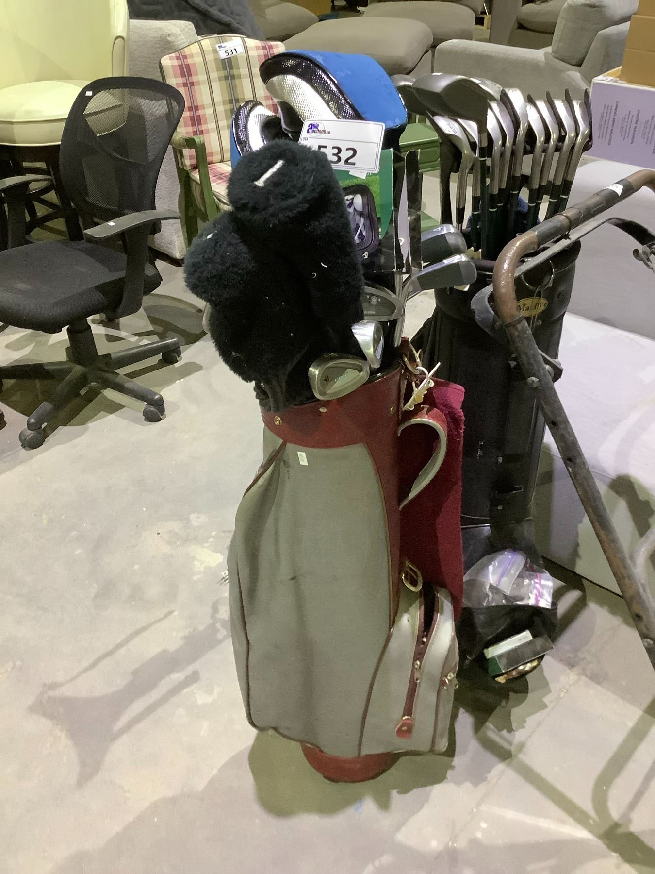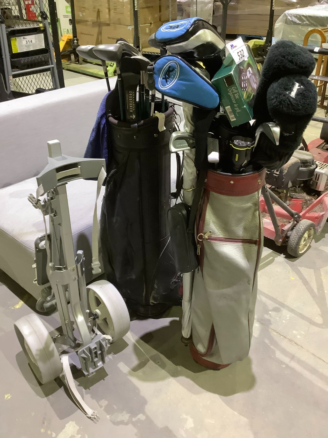 2 GOLF BAGS WITH CLUBS AND ROLLING GOLF CADDY
