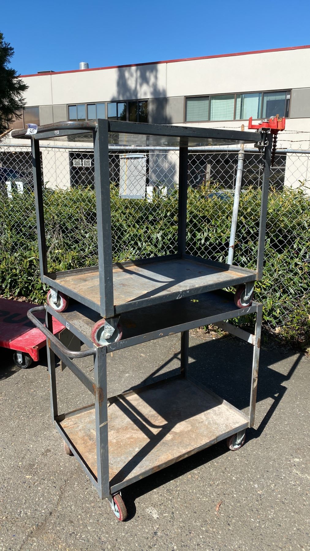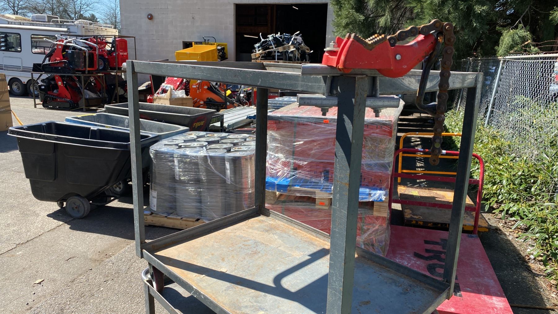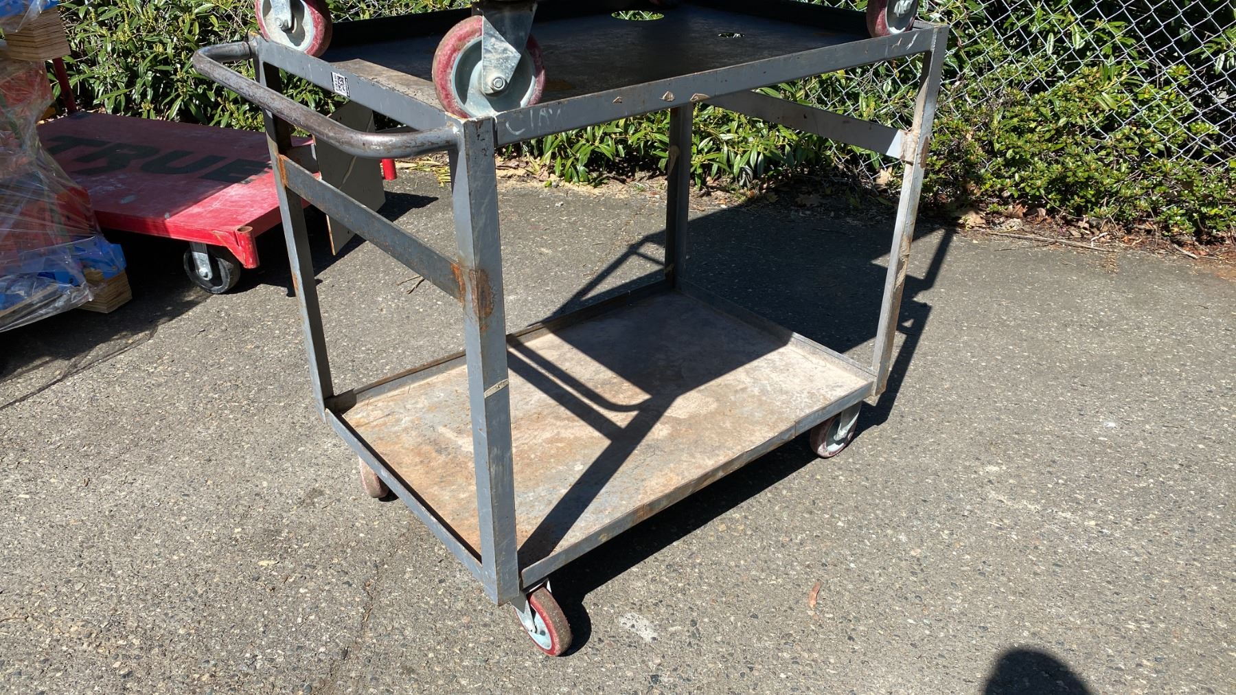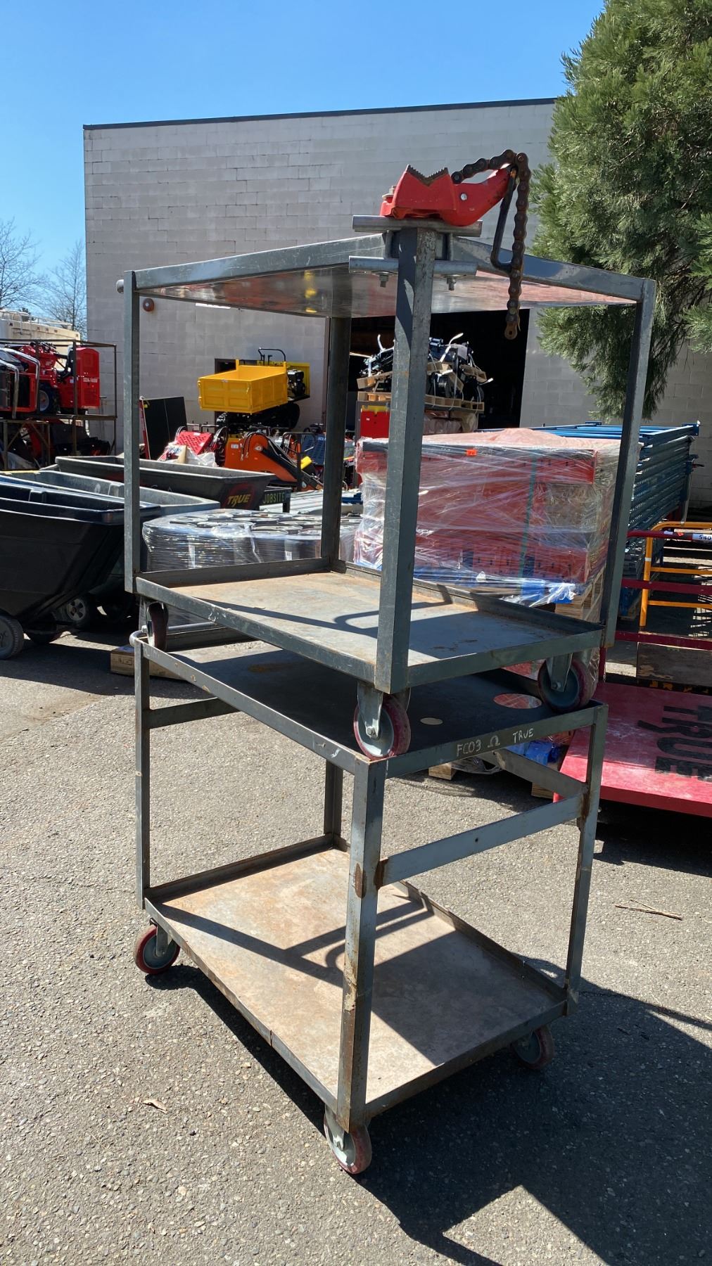 2 GREY METAL 2 TIER UTILITY CARTS WITH 1 BENCH CHAIN VICE