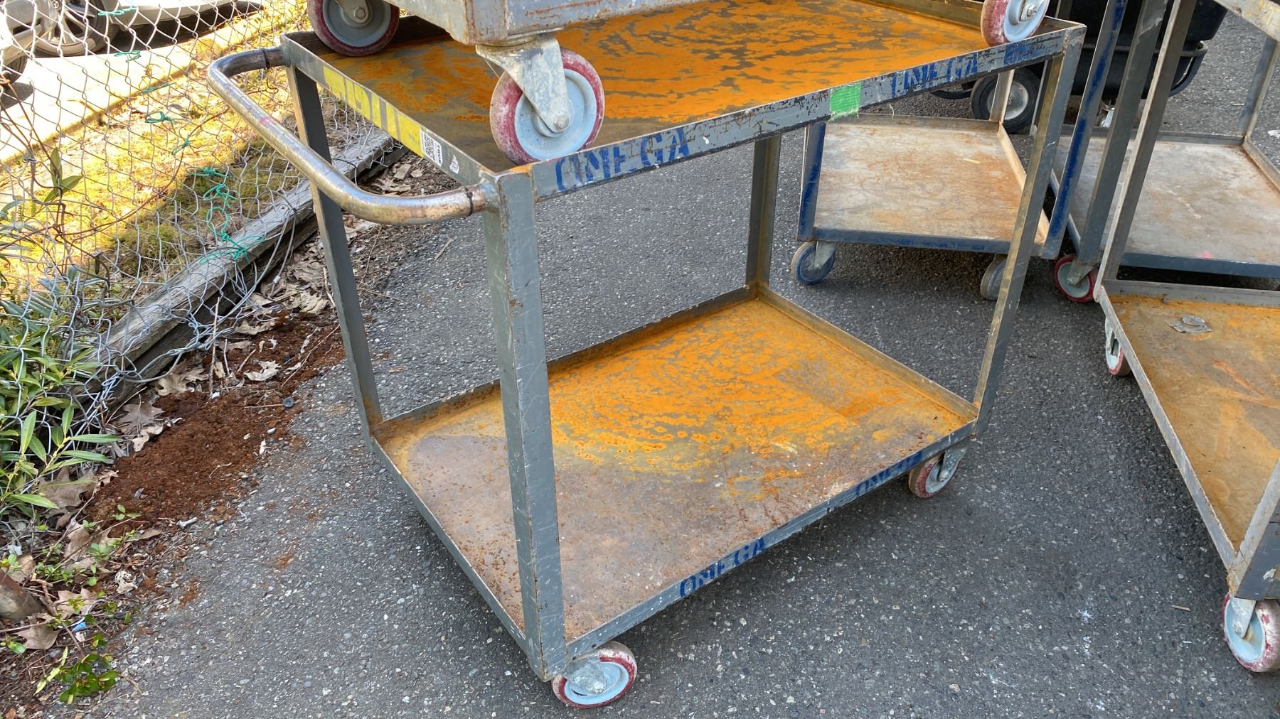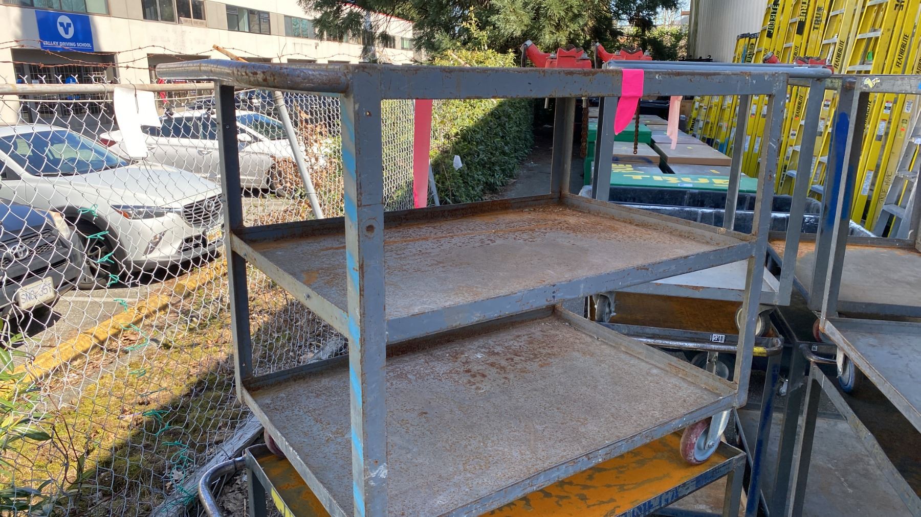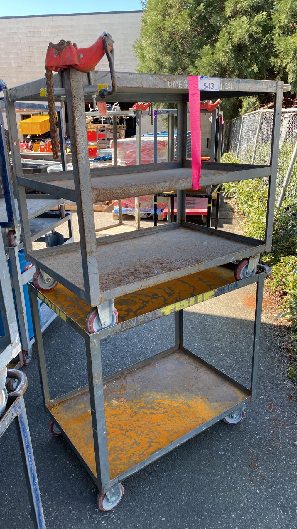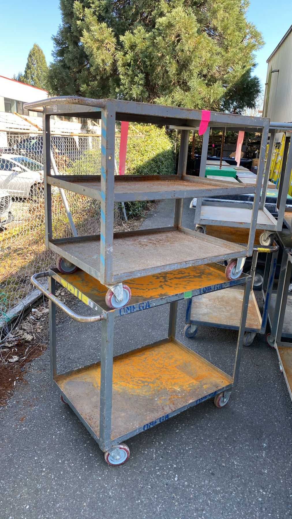 2 GREY METAL 2 TIER UTILITY CARTS WITH 1 BENCH CHAIN VICE