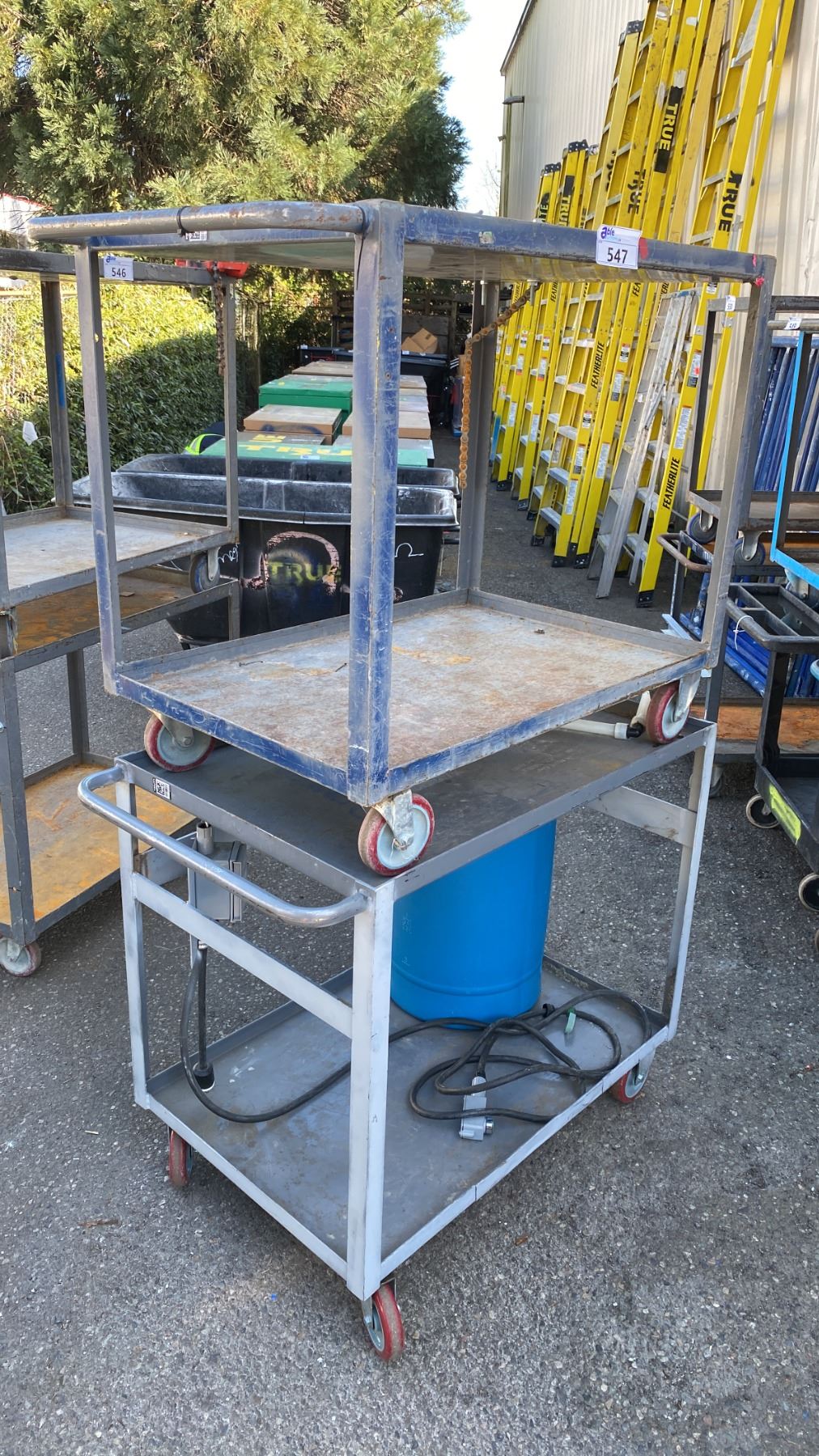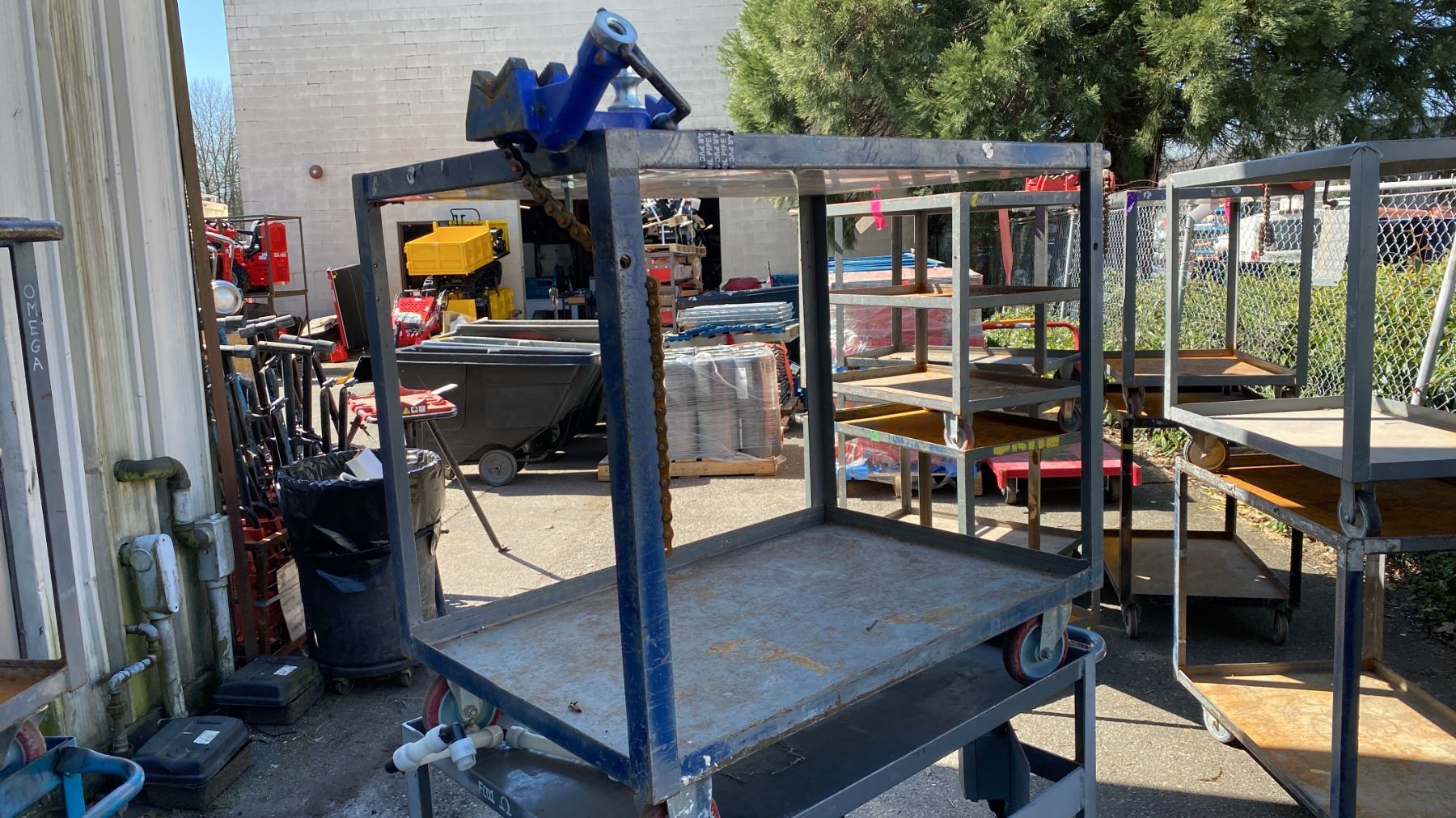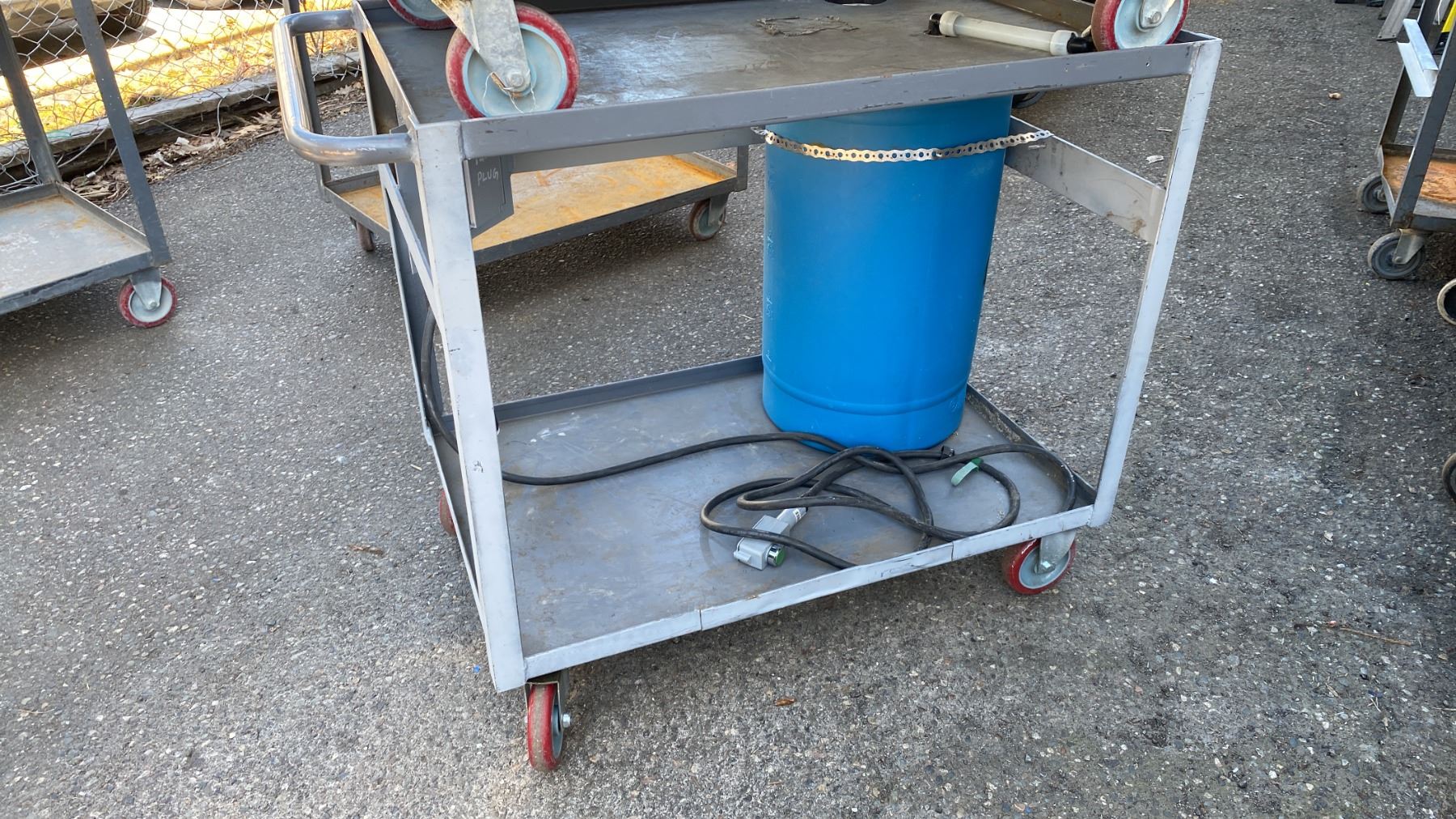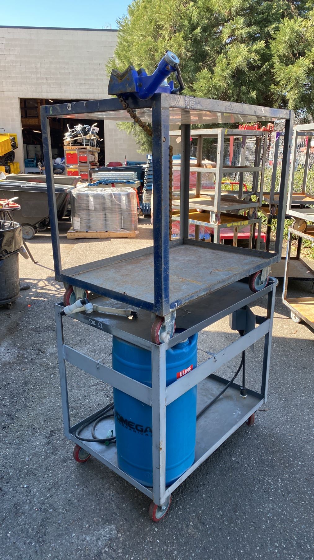 2 GREY METAL 2 TIER UTILITY CARTS WITH 120V POWER UNIT, SWITCH, BENCH CHAIN VISE & PLASTIC LIQUID STORAGE BARREL