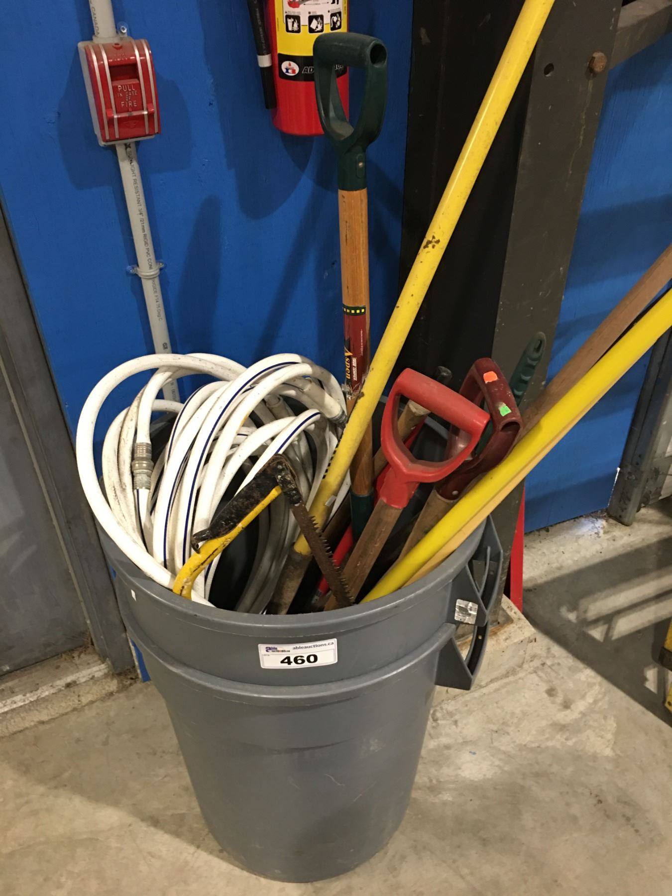 2 GREY RUBBERMAID GARBAGE CANS & ASSTD GARDEN TOOLS, GARDEN HOSE, AXE, SAW, MACHETE ECT.