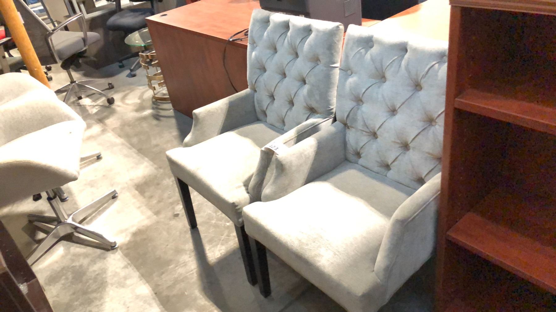 2 GREY WOODEN TUFTED ARM SIDE CHAIRS