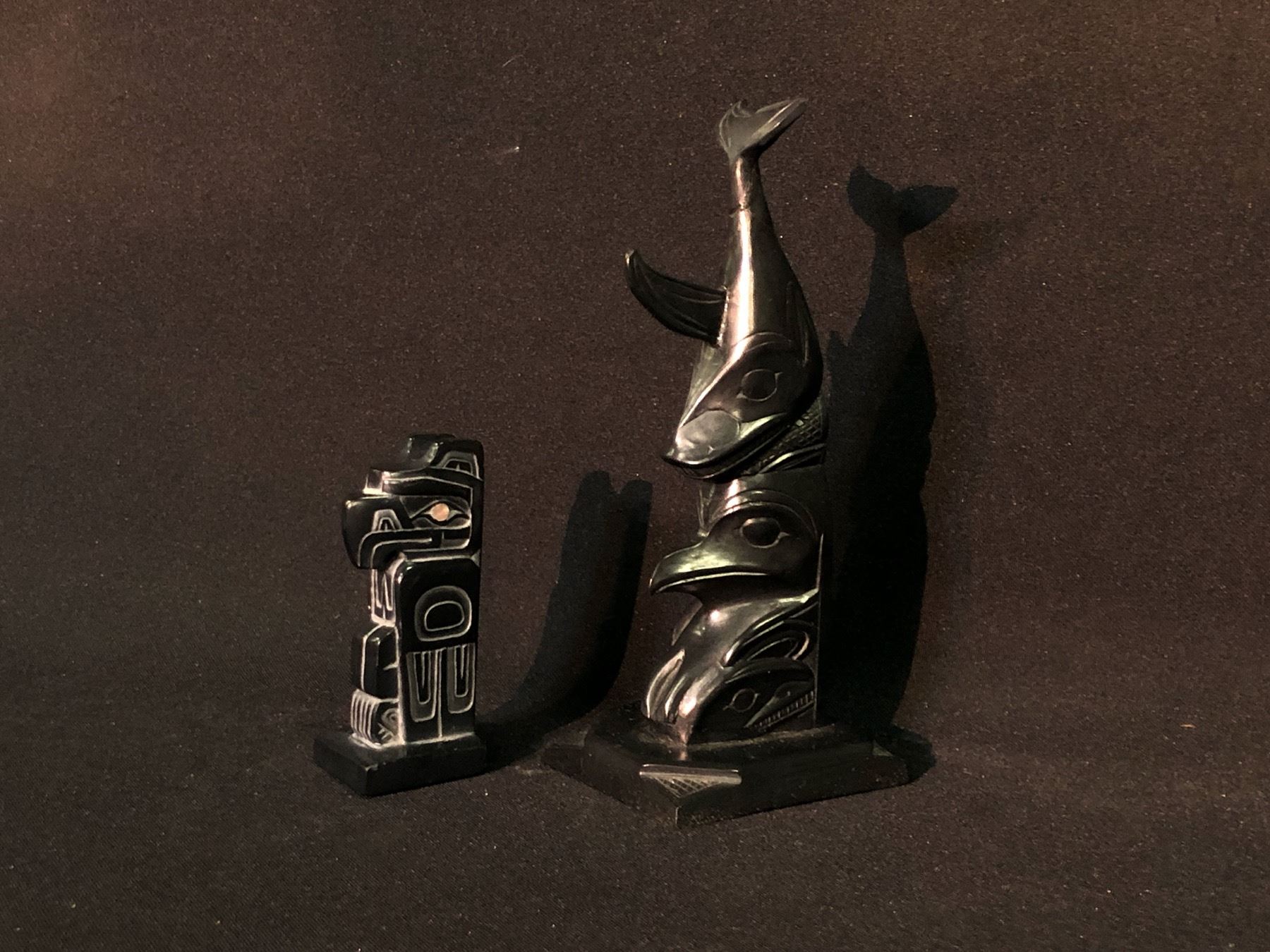 2 HAIDA ARGILITE CARVINGS: RUFUS MOODY SIGNED TOTEM FROM SKIDEGATE, BC., NOV. 1965, SIGNED BY
