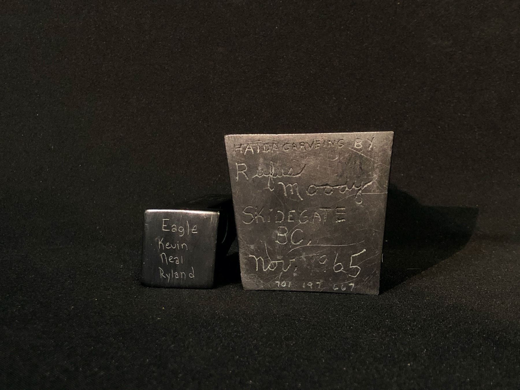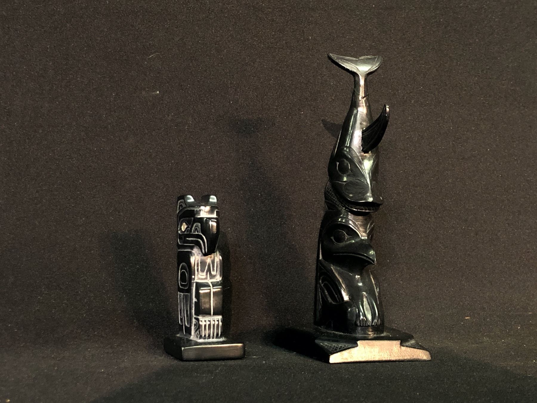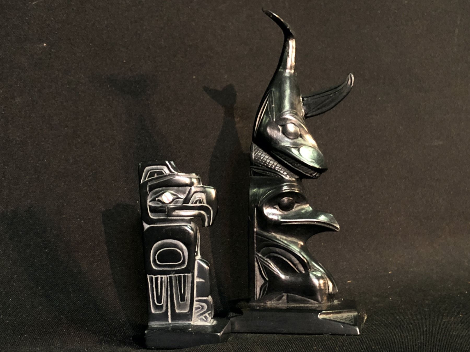 2 HAIDA ARGILITE CARVINGS: RUFUS MOODY SIGNED TOTEM FROM SKIDEGATE, BC., NOV. 1965, SIGNED BY ARTIST ON BOTTOM, 6" TALL, AND KEVIN NEAL RYLAND EAGLE TOTEM WITH ABALONE INLAID EYES, SIGNED BY ARTIST, 3.5" TALL