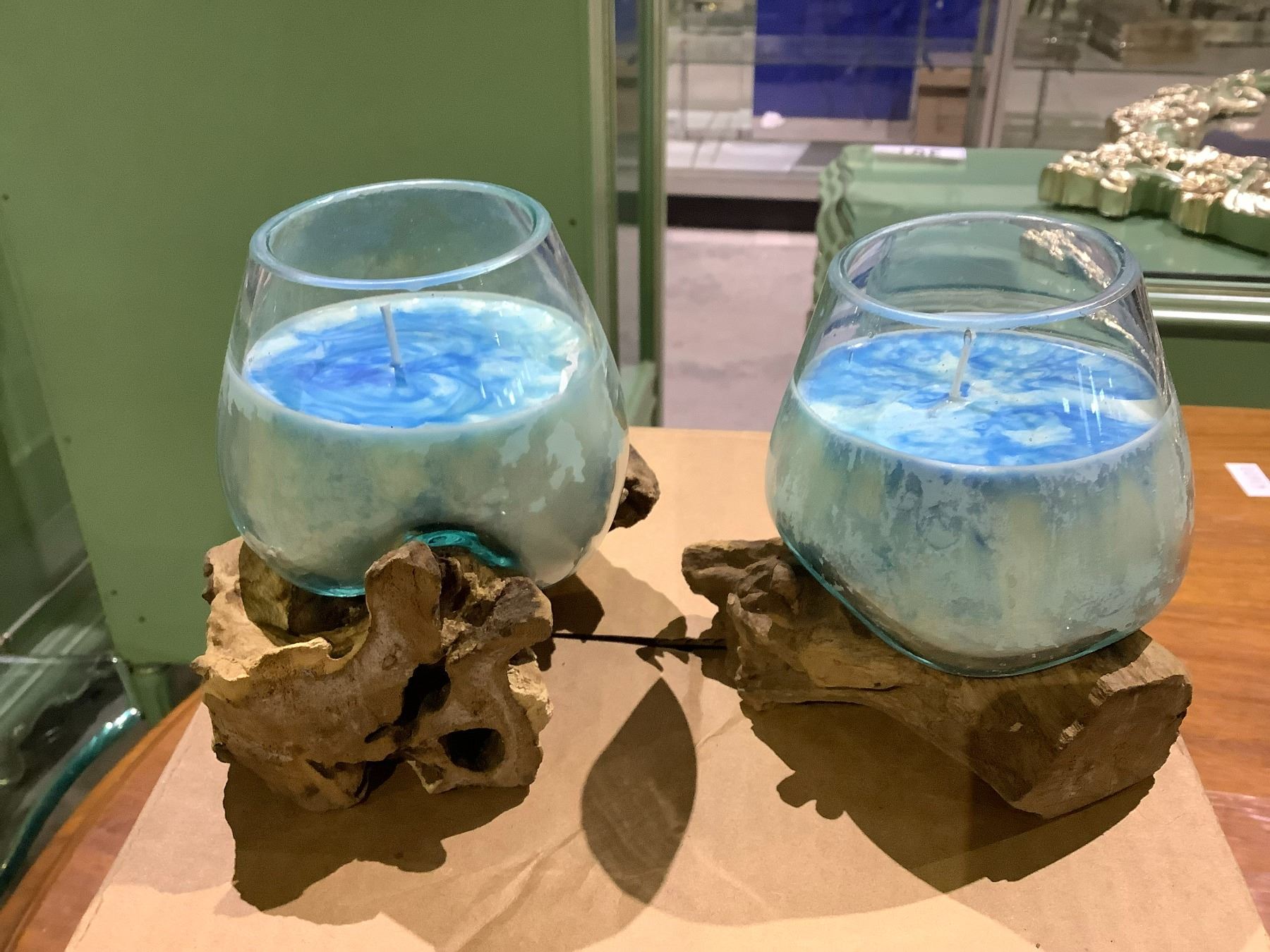 2 HANDMADE MOLTEN GLASS BOWLS ON TEAK WOOD BASES WITH CANDLES