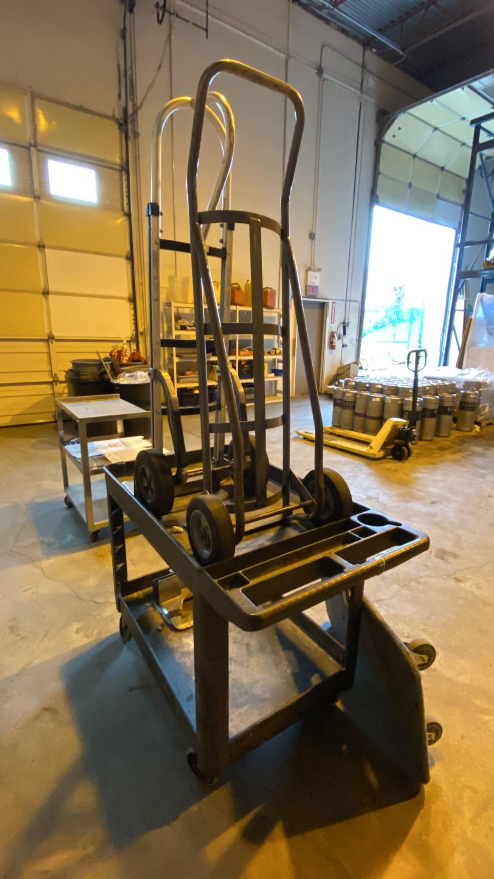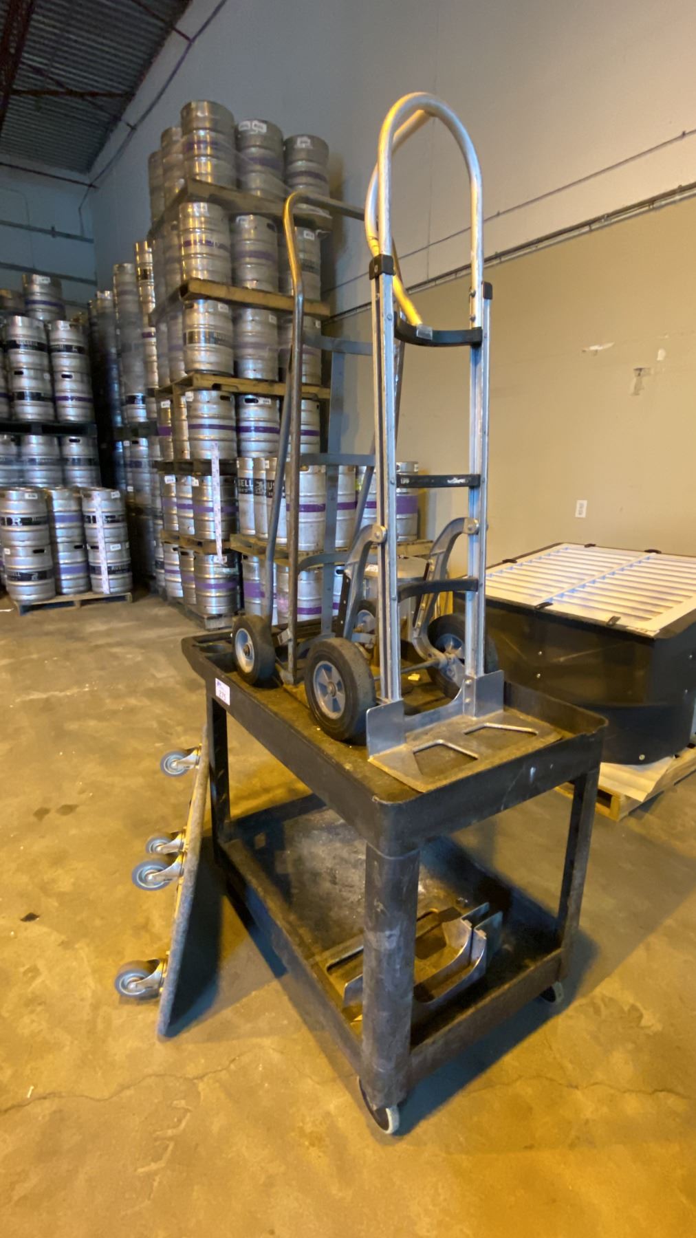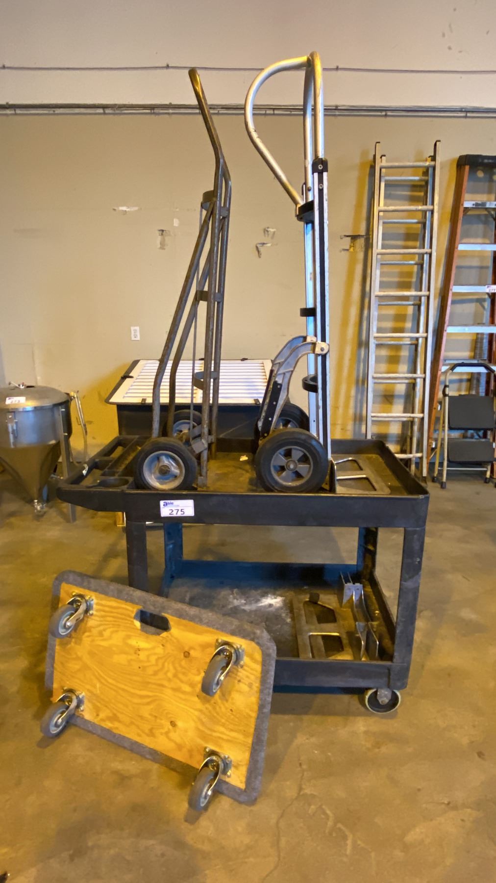 (2) HARD WHEEL HAND CART DOLLIES, (1) 4 WHEEL FLAT DOLLY AND (1) RUBBERMAID MOBILE WORK
