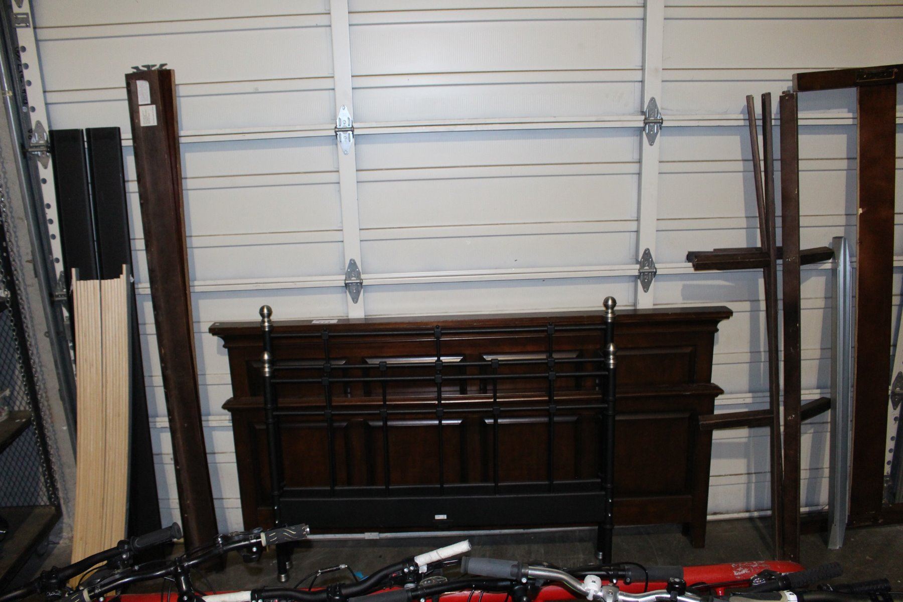 2 HEADBOARD, FOOTBOARD, AND RAILS - KING SIZE DARK WALNUT AND DOUBLE SIZE BLACK METAL