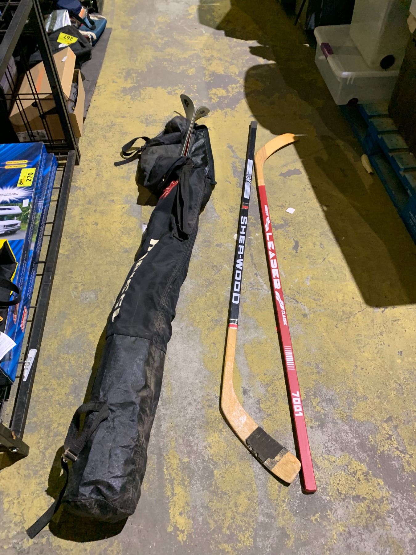 2 HOCKEY STICKS AND PAIR OF SKIS IN BAG