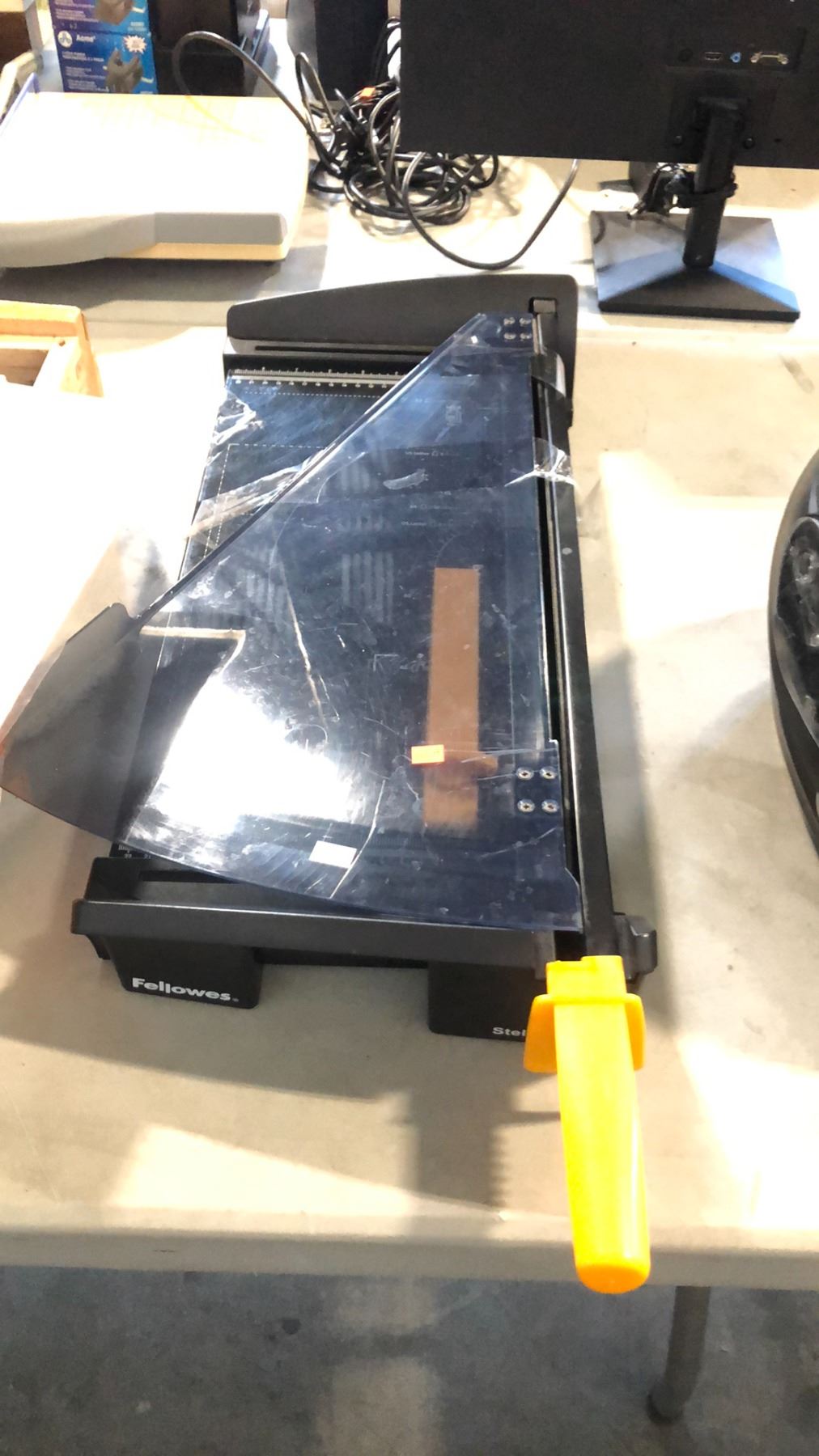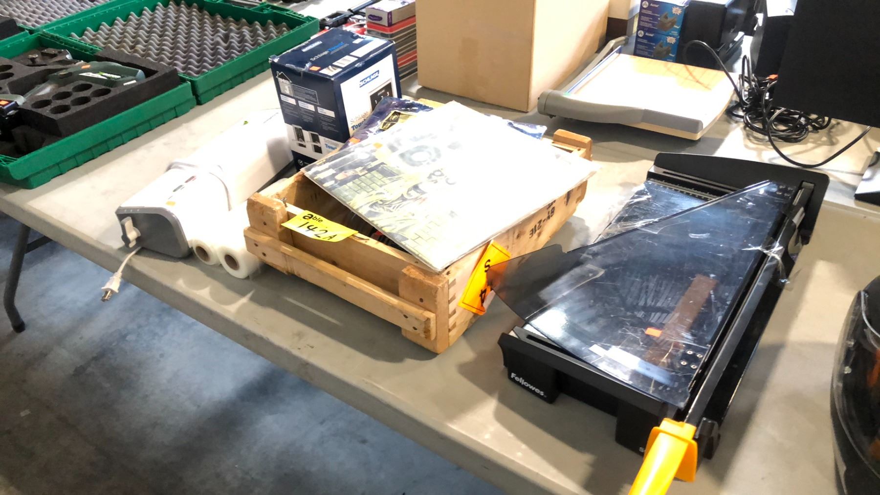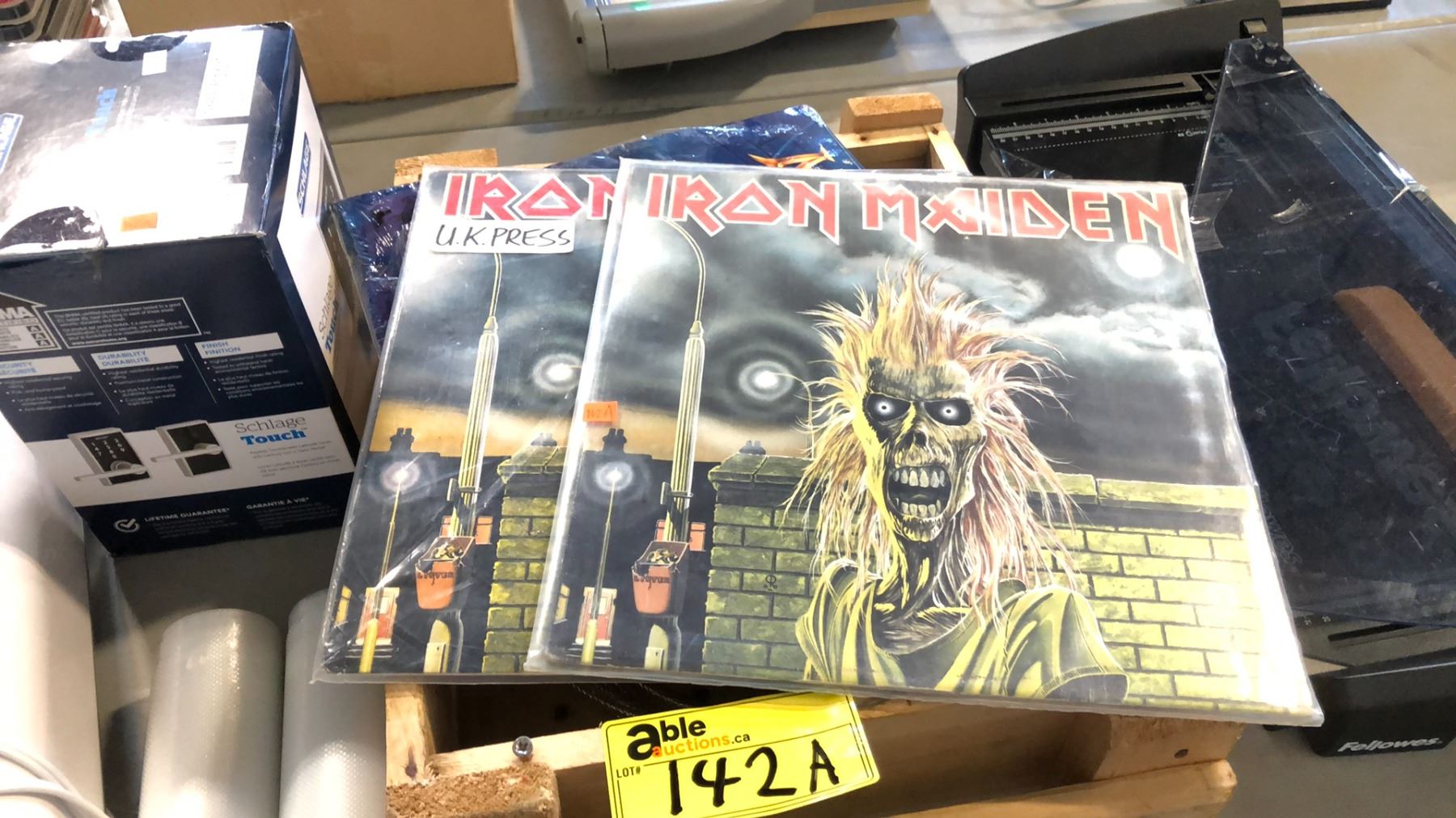 2 IRON MAIDEN, MEGADETH VINYL RECORDS, SCHLAGE TOUCH KEYLESS DEADBOLT, FOODSAVER SEALER, WOODEN CRATE W/ SNAP HOOK SET, INSULATED CABLE AND FELLOWES PAPER CUTTER