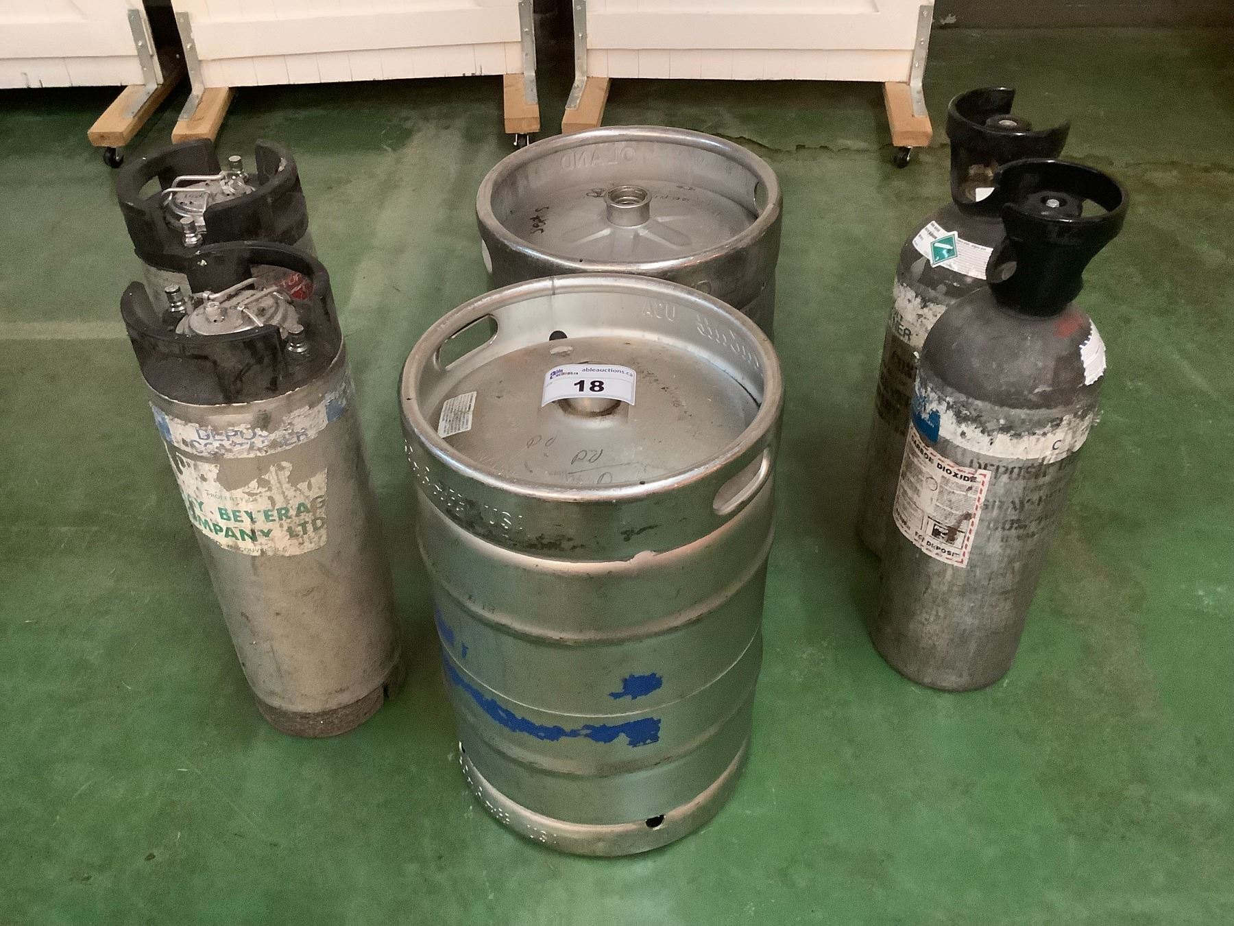 2 KEGS, 2 BEVERAGE CONTAINERS, & 2 CANISTERS FOR CARBON DIOXIDE