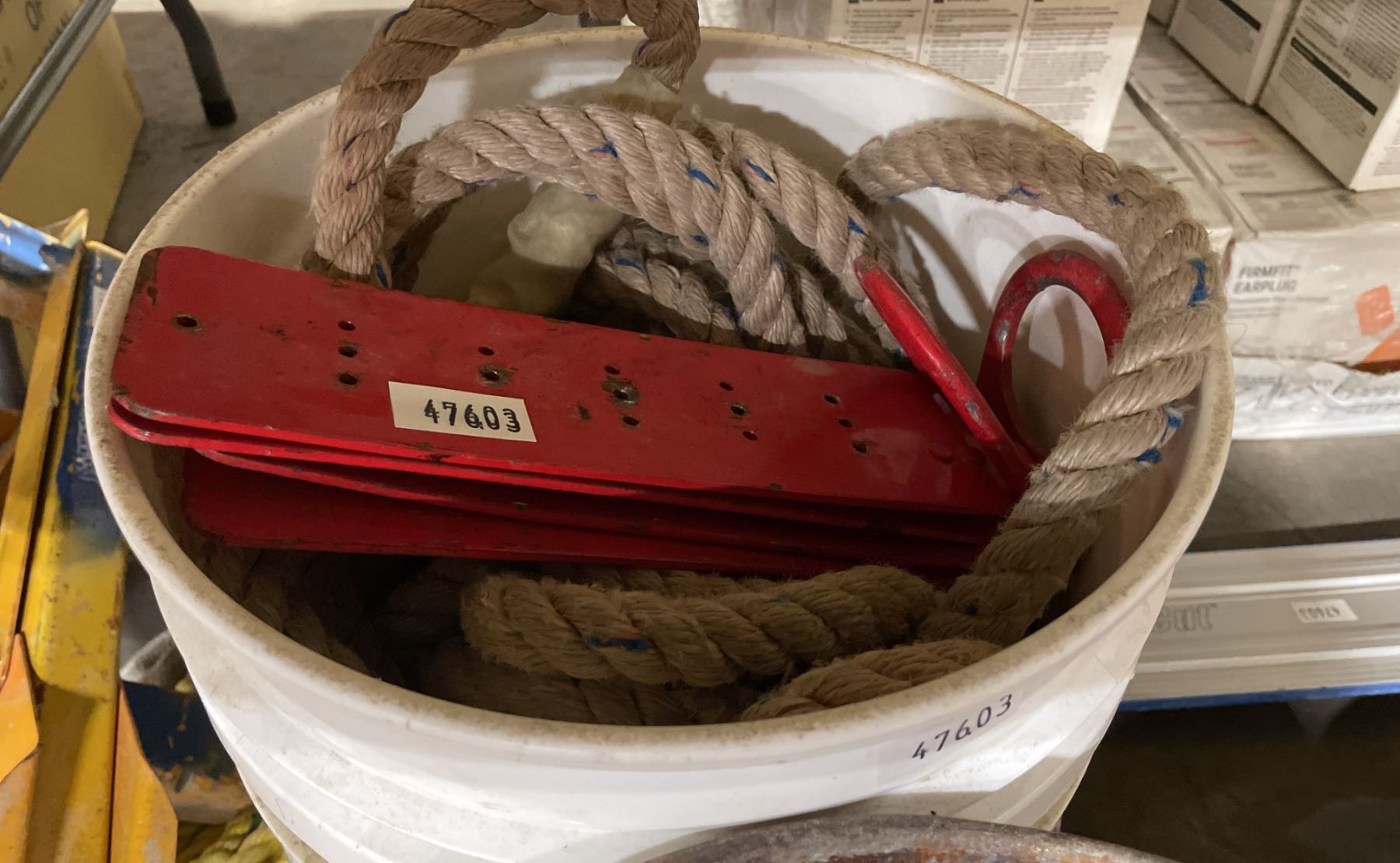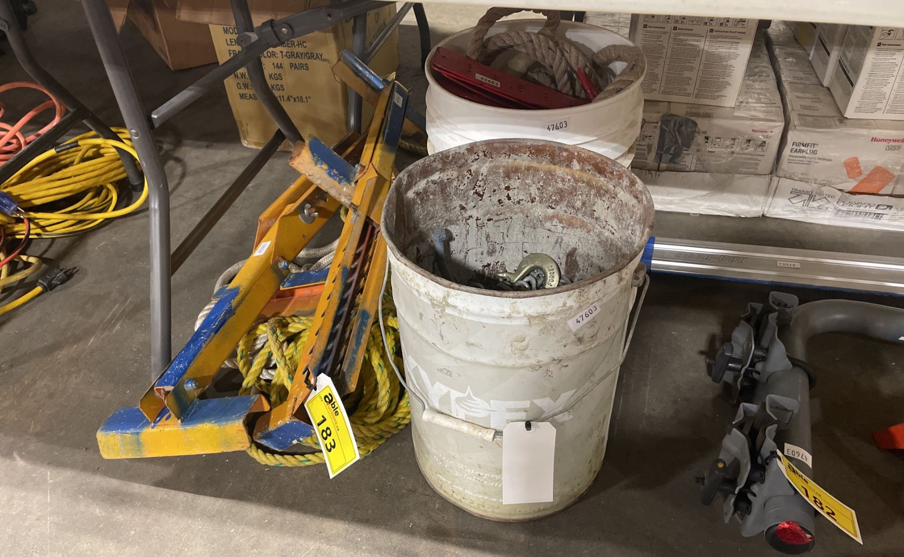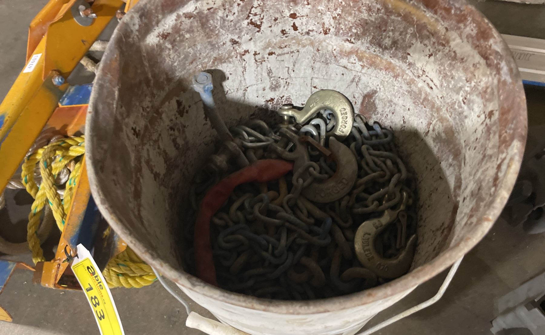 2 LADDER RACKS, BIN OF INDUSTRIAL CHAINS, RIGGING ROPE, & BUCKET OF ROPES / HOOKS