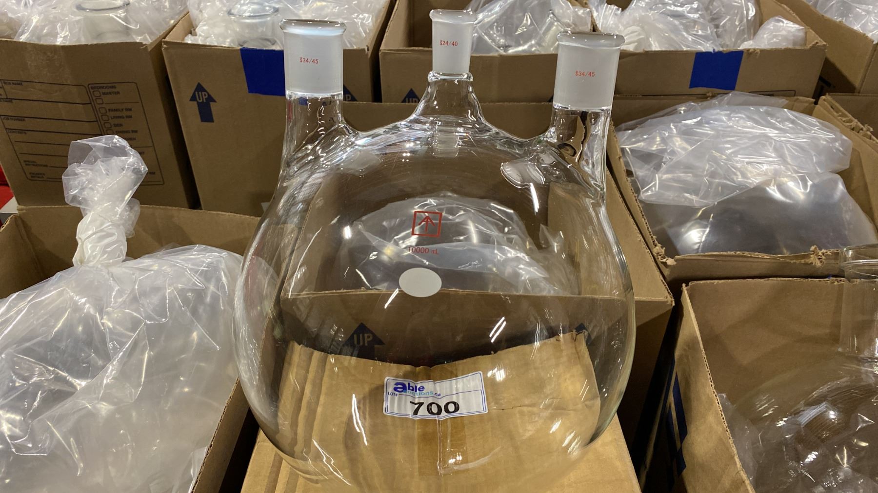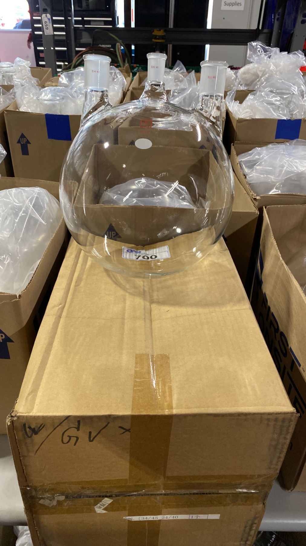 2 LARGE LABORATORY ROUND BOTTOM GLASS FLASKS
