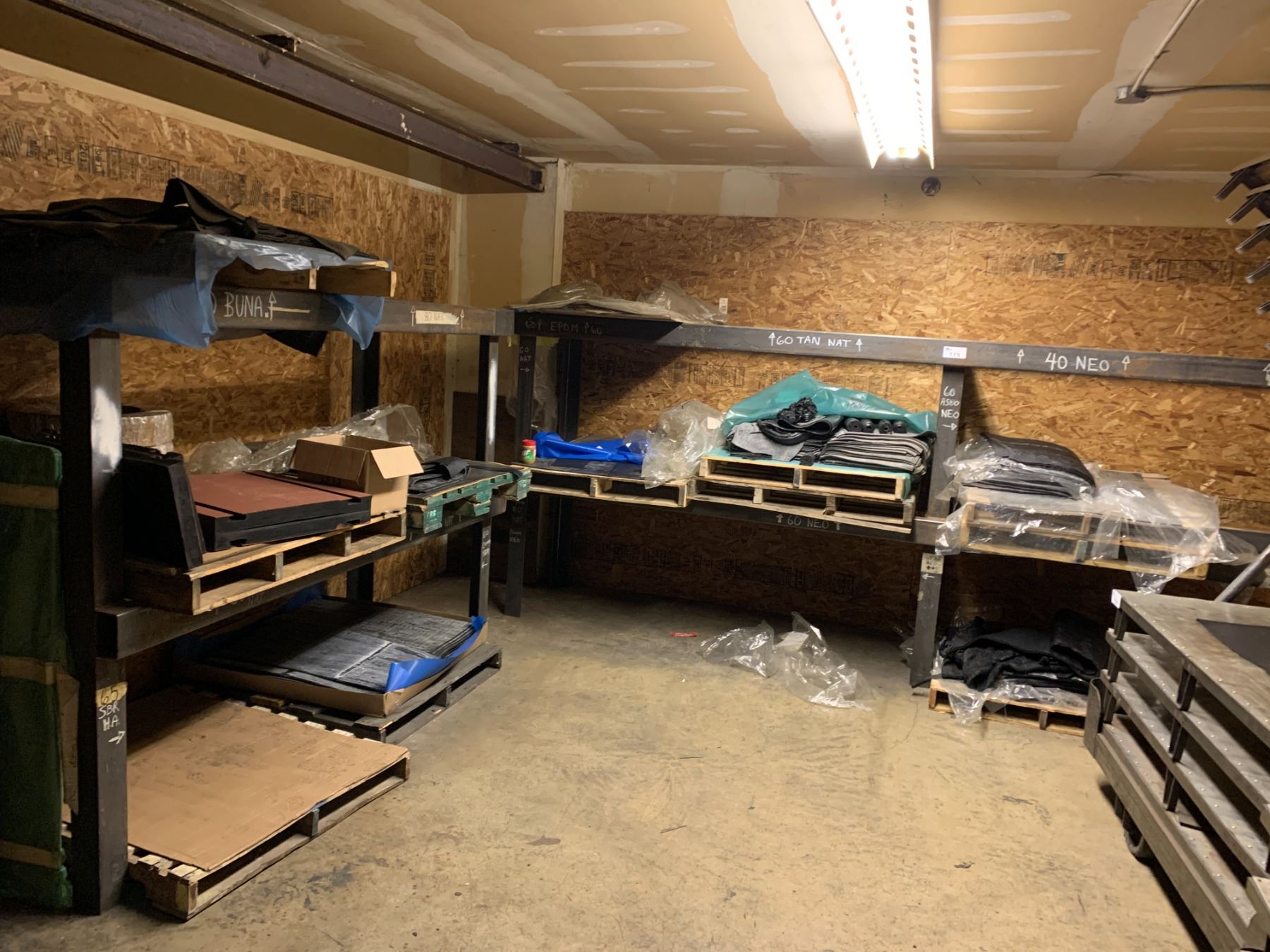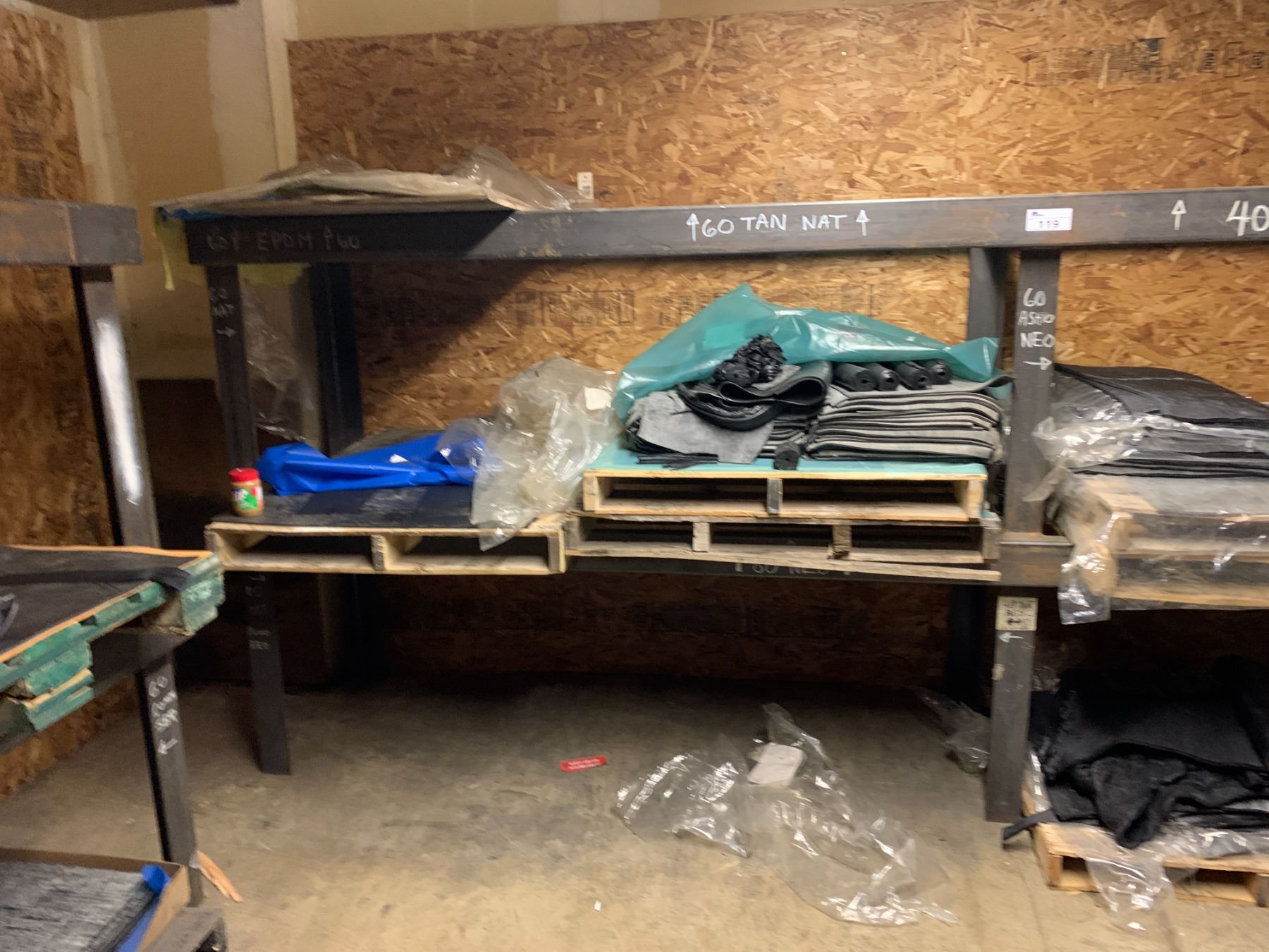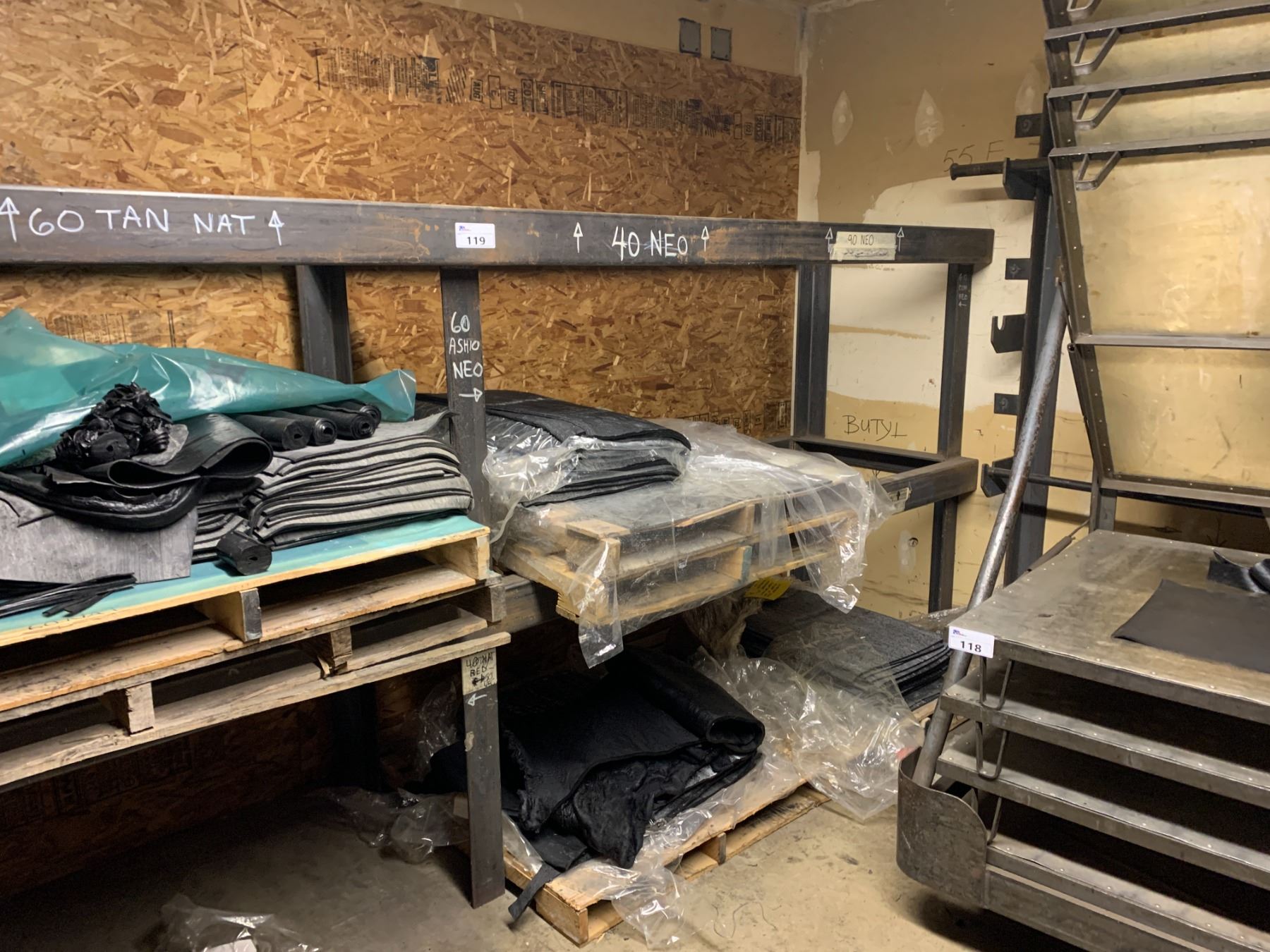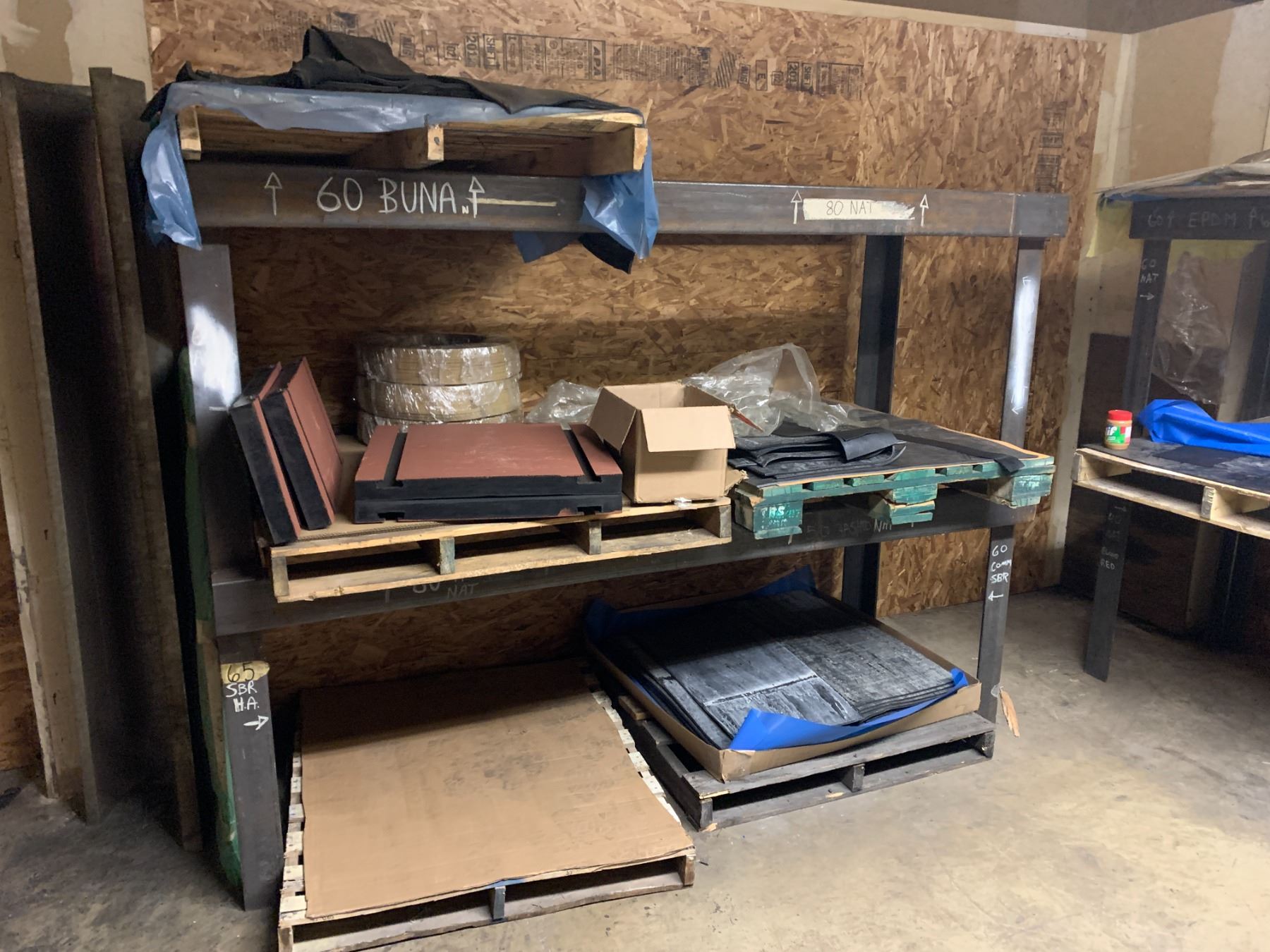 2 LARGE METAL 2 TIER STORAGE RACKS WITH PALLETS OF ASSORTED RUBBER STOCK
