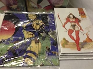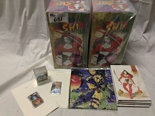 2 LARGE SHI CERAMIC STATUES BY CLAYBURN MOORE 4 COPIES SHI SENRYAKU COLLECTIONS HARD COPY, T-SHIRT, SET OF 1995 CHROMIUM CARDS & 2 PHONE CARD SETS