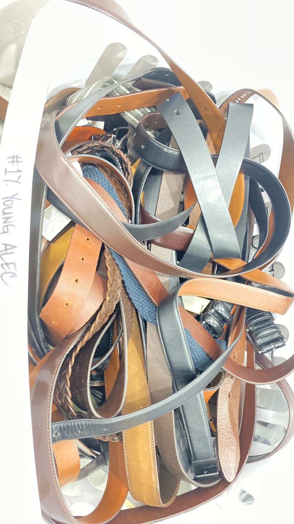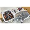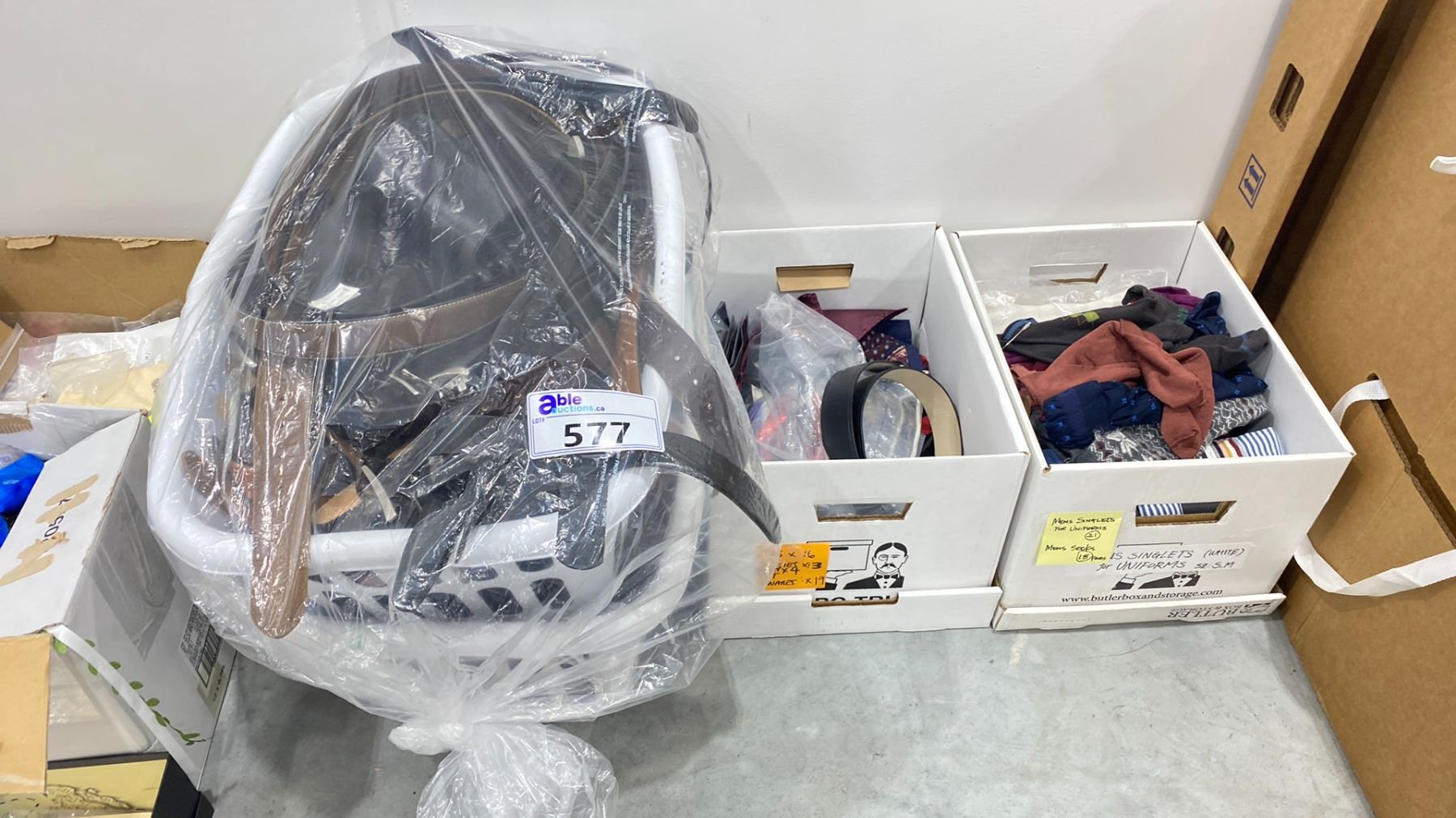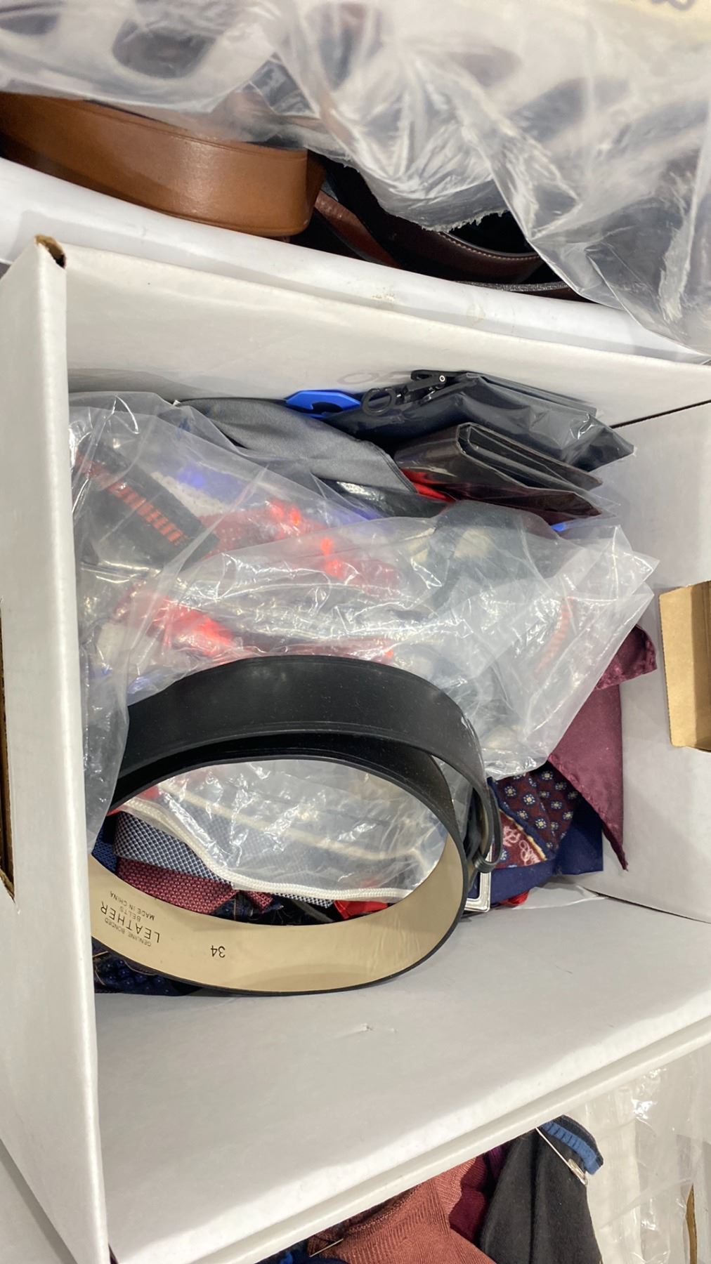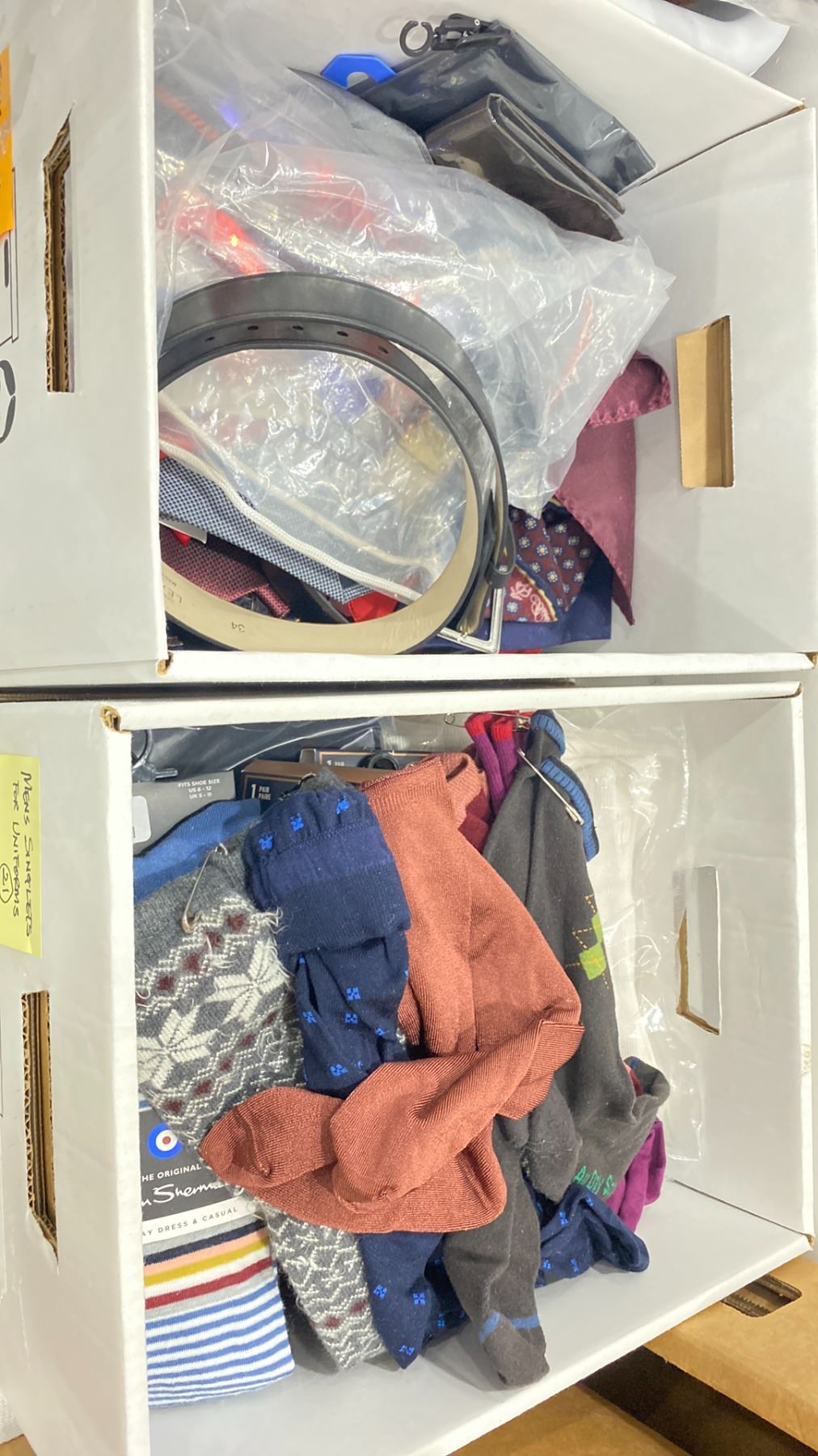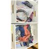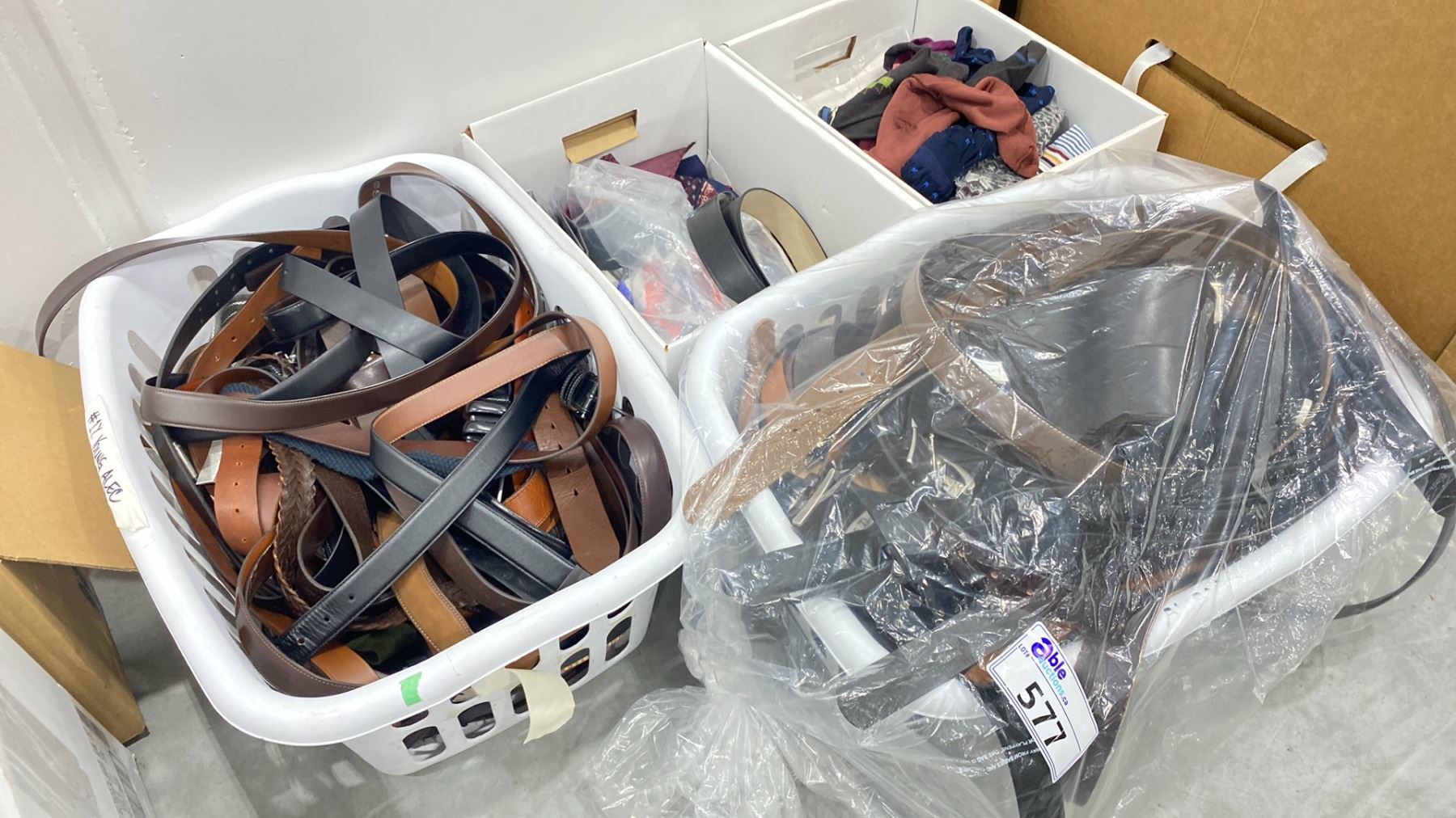 2 LAUNDRY BASKETS OF ASSORTED BELTS & 2 BOXES OF ASSORTED TIES & DRESS SOCKS