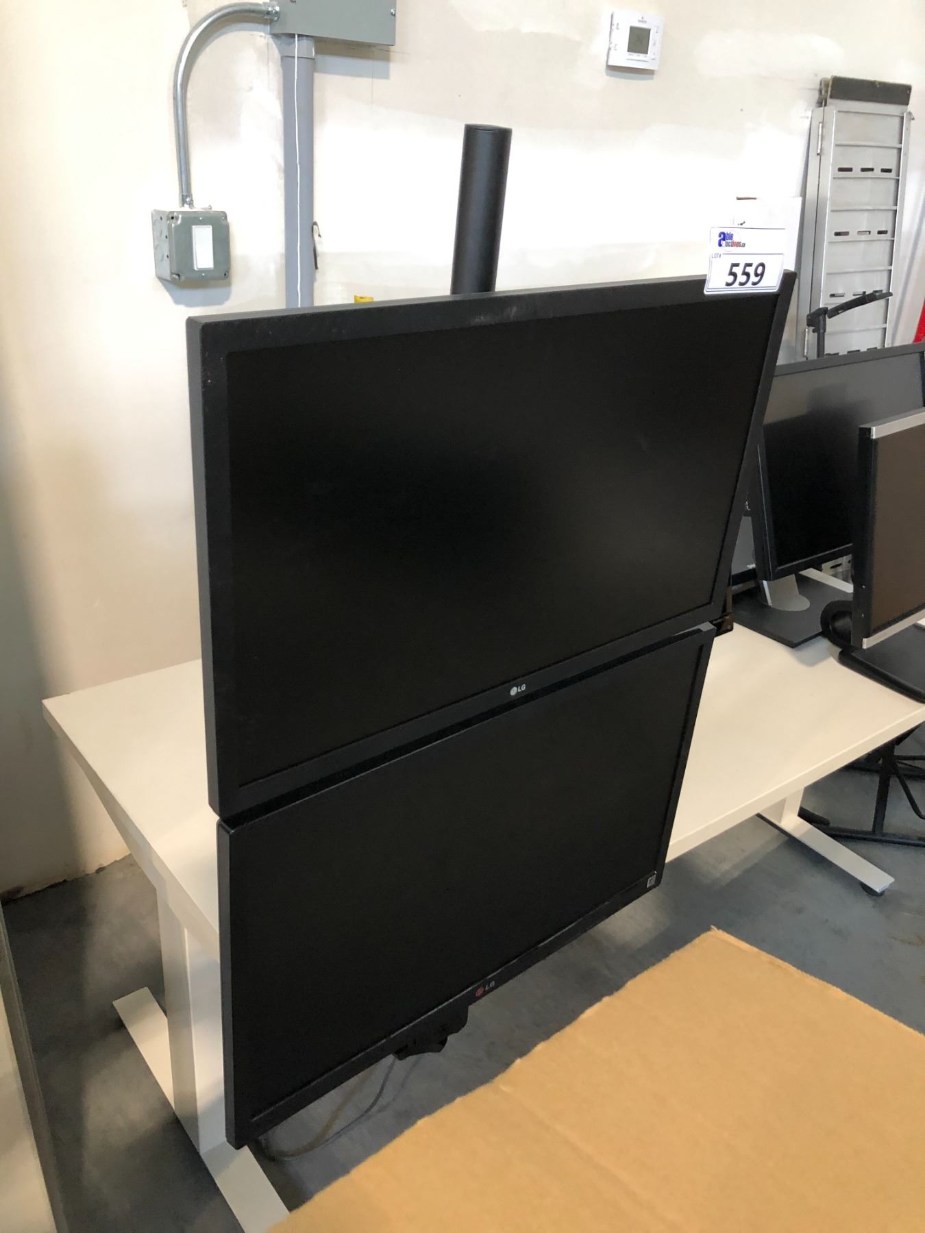 2 LG 23" LCD MONITORS ON DESK MOUNTED MONITOR STAND