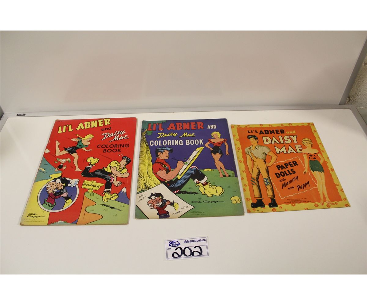 2 LI'L ABNER AND DAISY MAE COLORING BOOKS IN EXCELLENT CONDITION, PLUS PAPER DOLLS WITH MAMMY AND PAPPY.