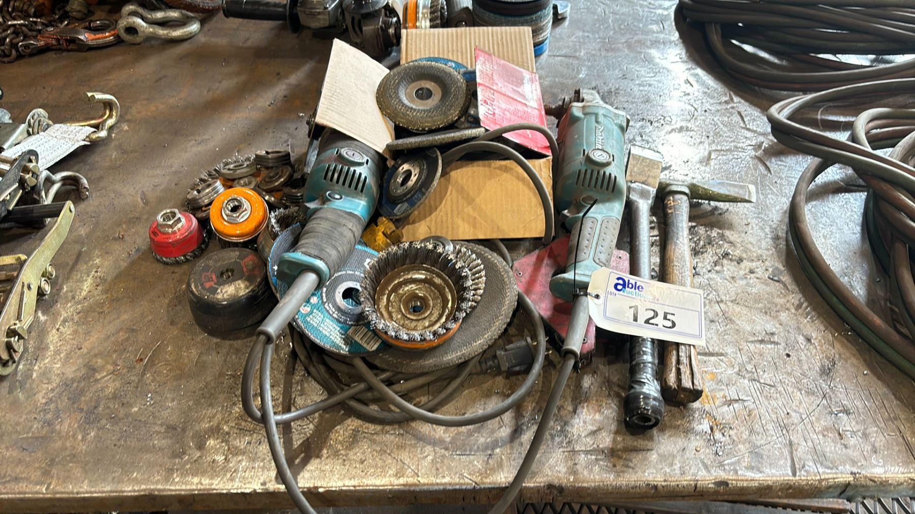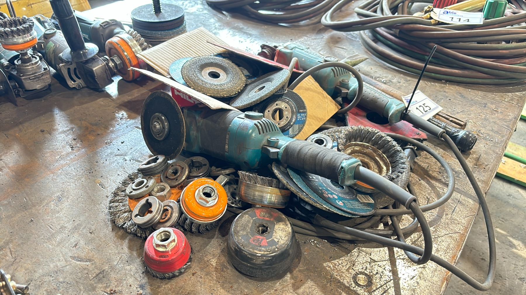 2 MAKITA GRINDERS WITH ASSORTED GRINDING DISCS AND BRUSHES