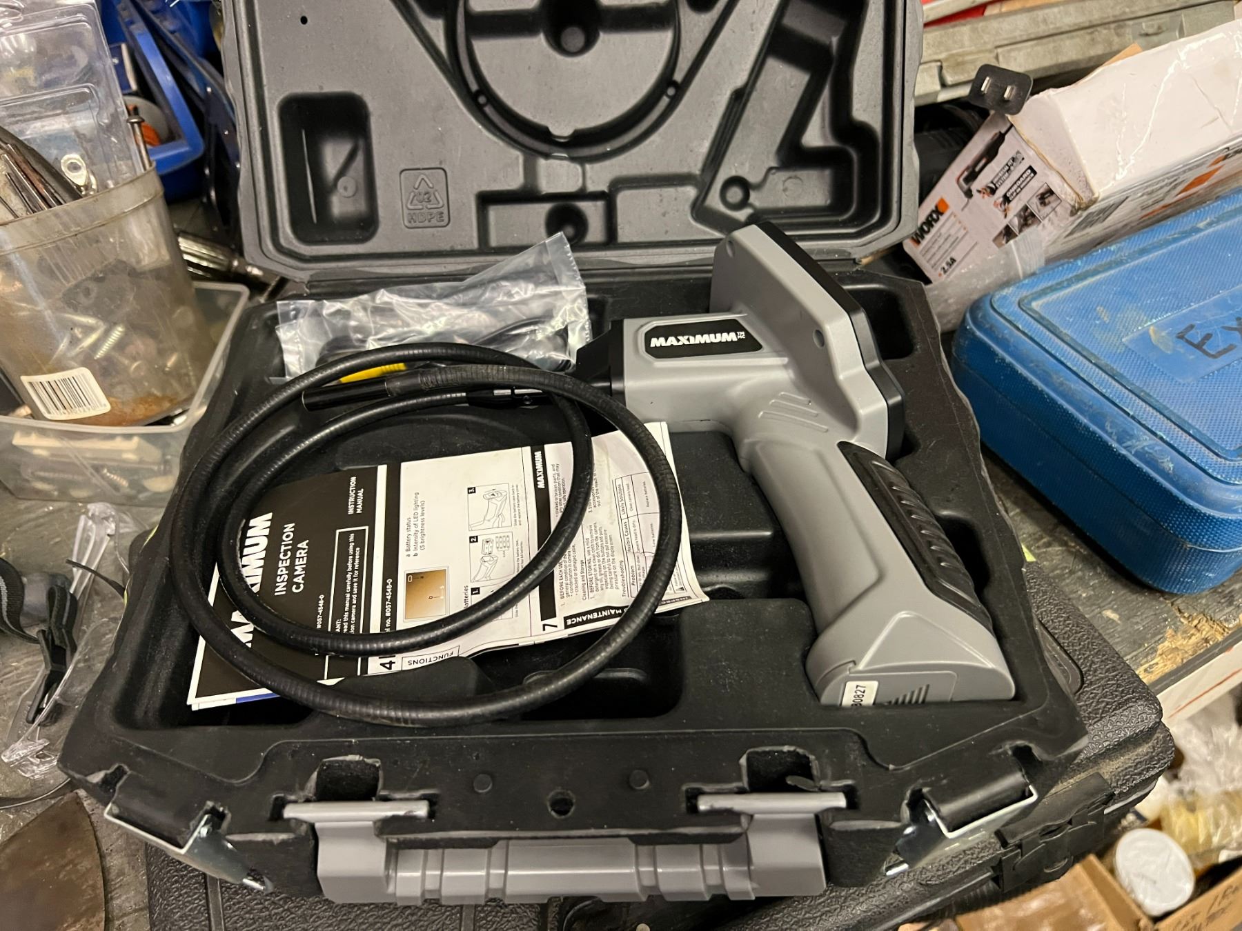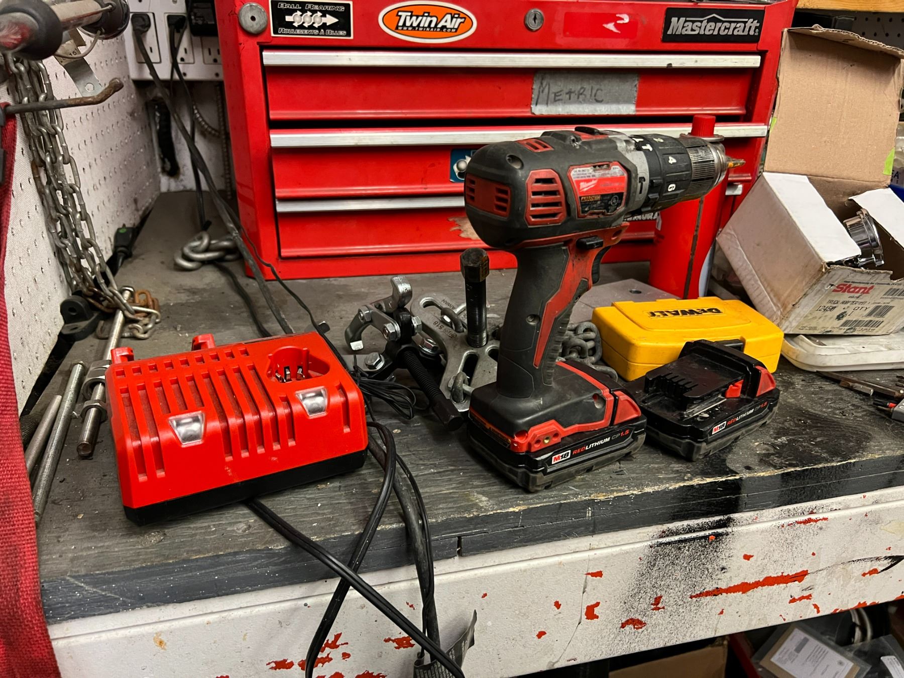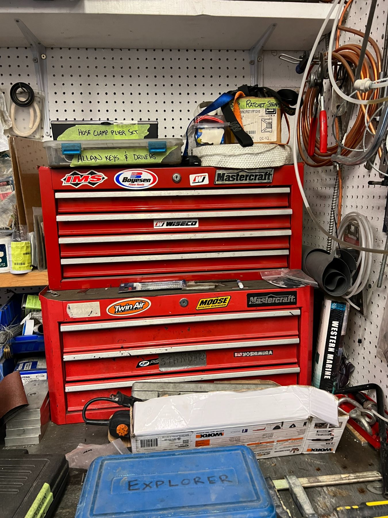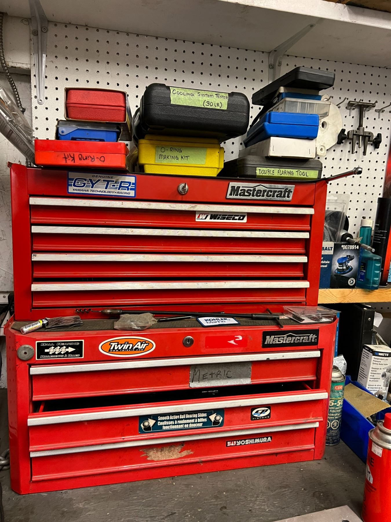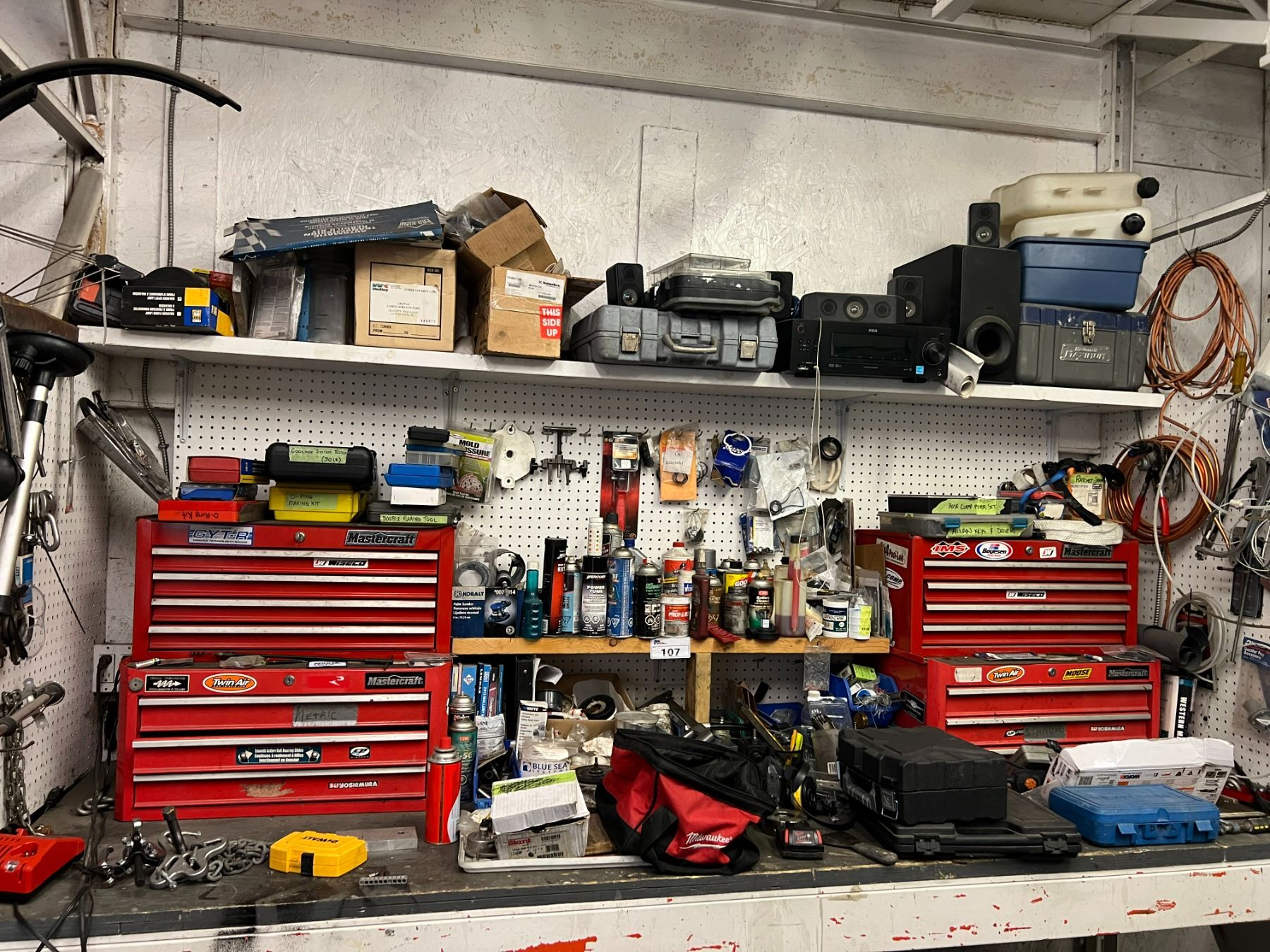 2 MASTERCRAFT TOOL BOXES AND LARGE TABLE TOP & UPPER SHELF FULL OF TOOLS, HARDWARE AMD MISCELLANEOUS