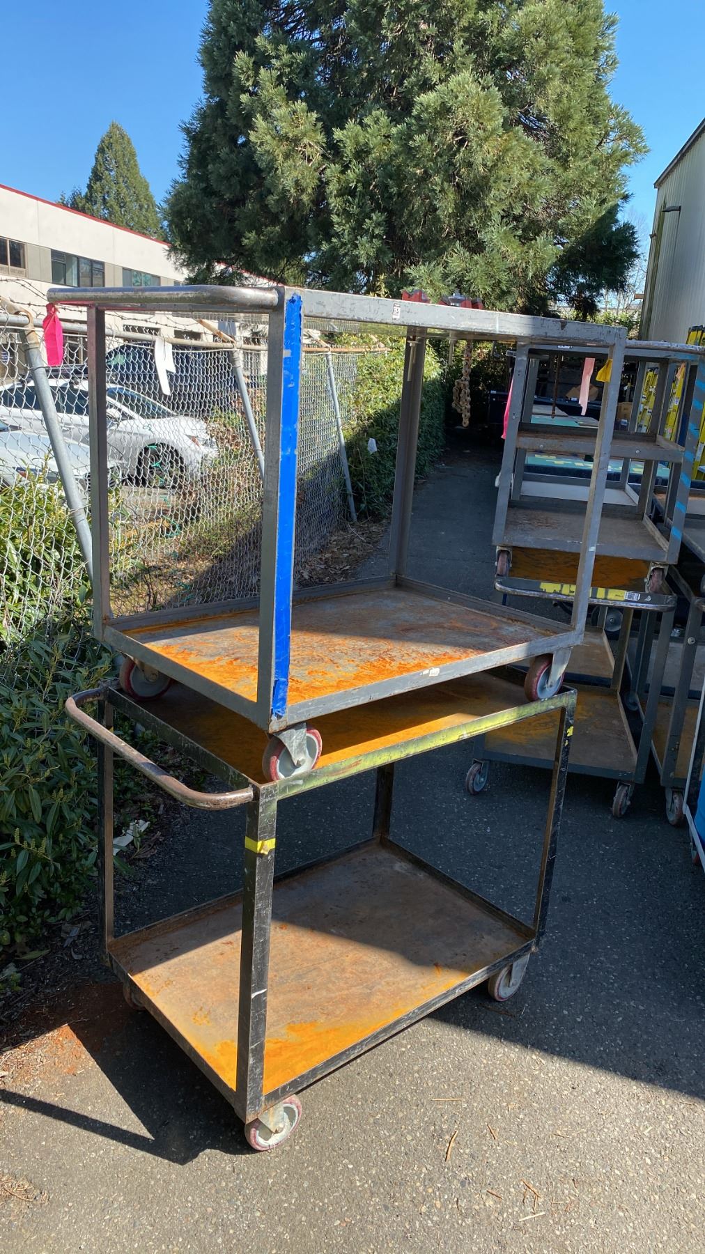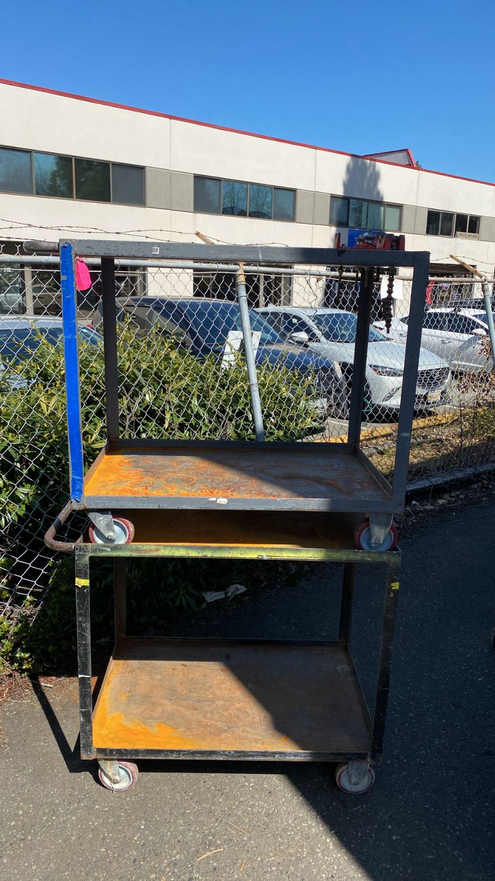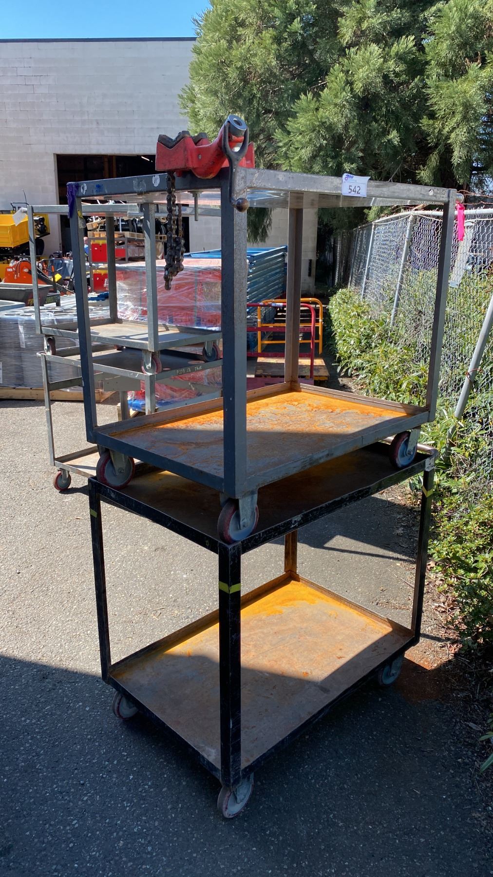 2 METAL 2 TIER UTILITY CARTS WITH 1 BENCH CHAIN VICE