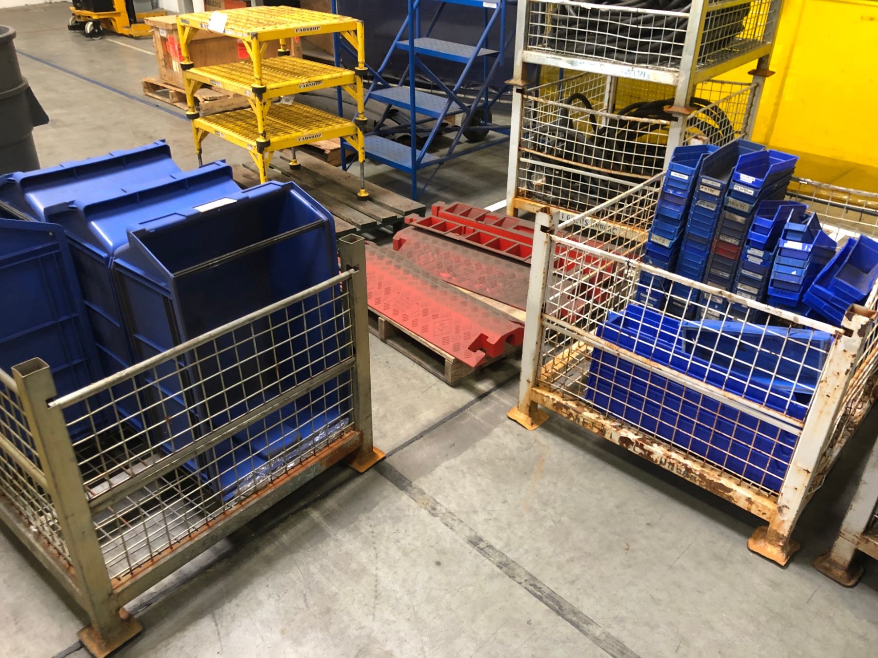 2 METAL CRATES WITH ASSORTED SIZE PARTS RACK BINS
