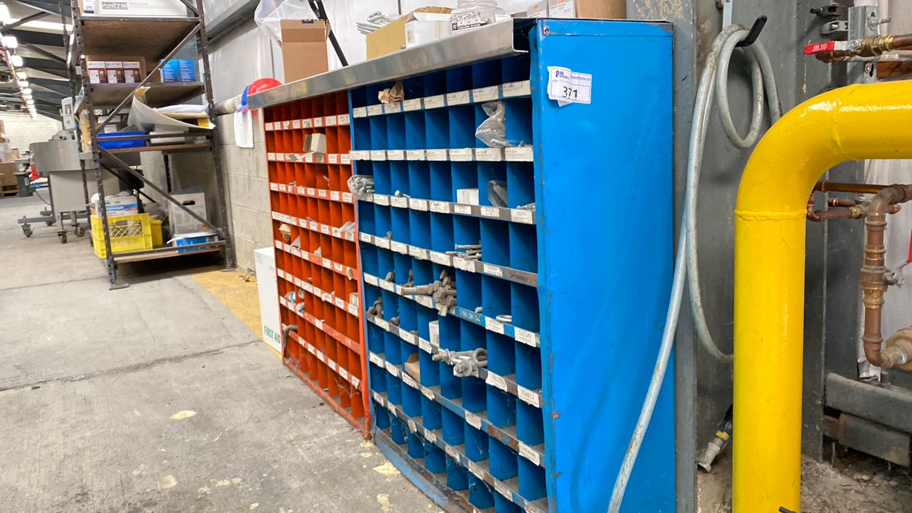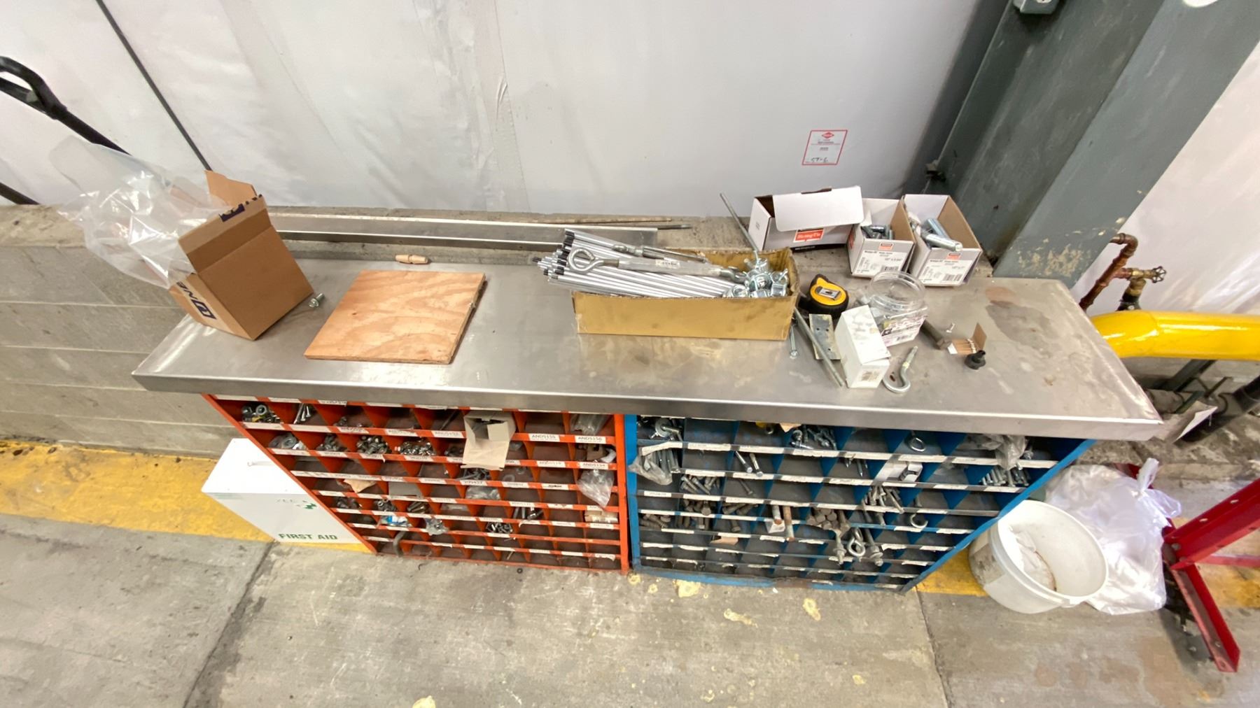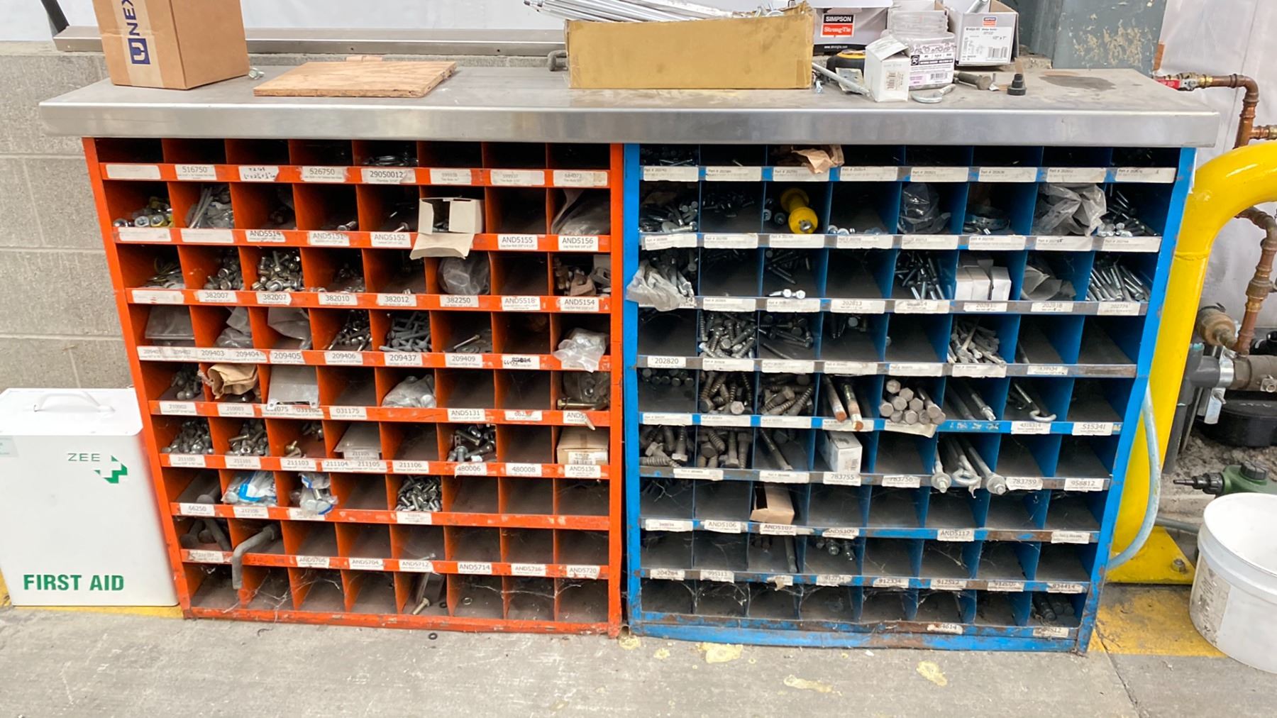 2 METAL NUTS AND BOLTS BINS WITH CONTENTS. OVERALL 6'WX42"H WITH STAINLESS STEEL TOP