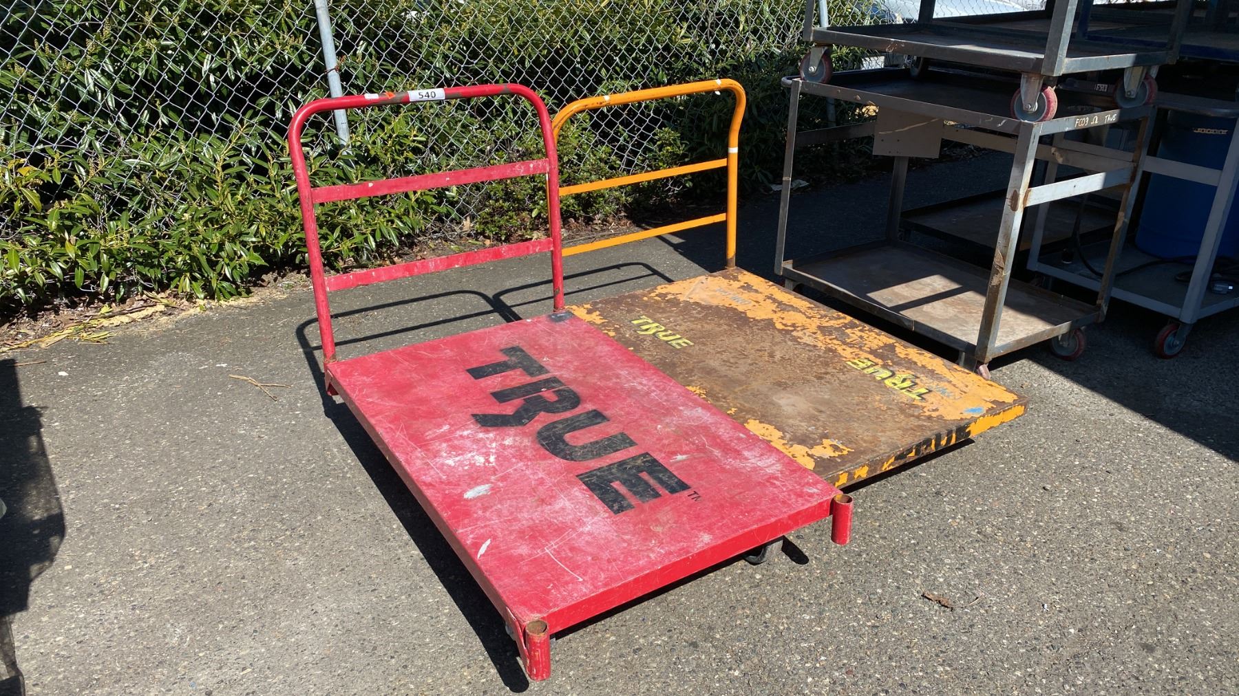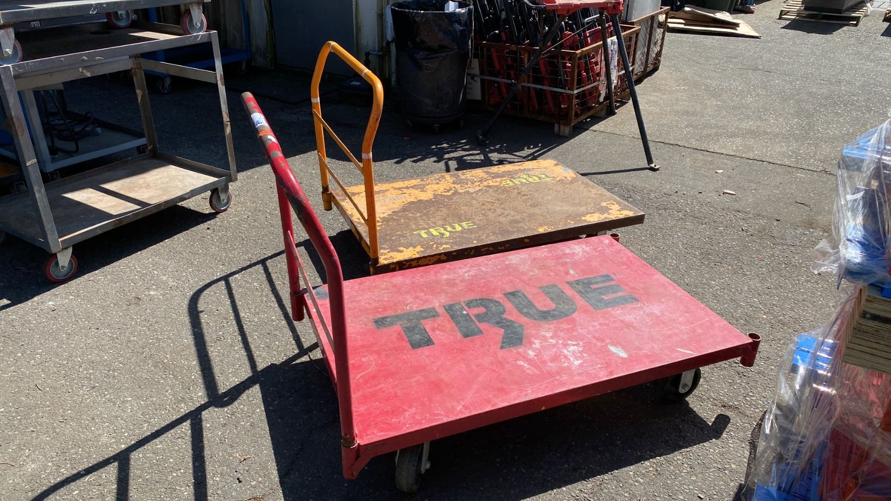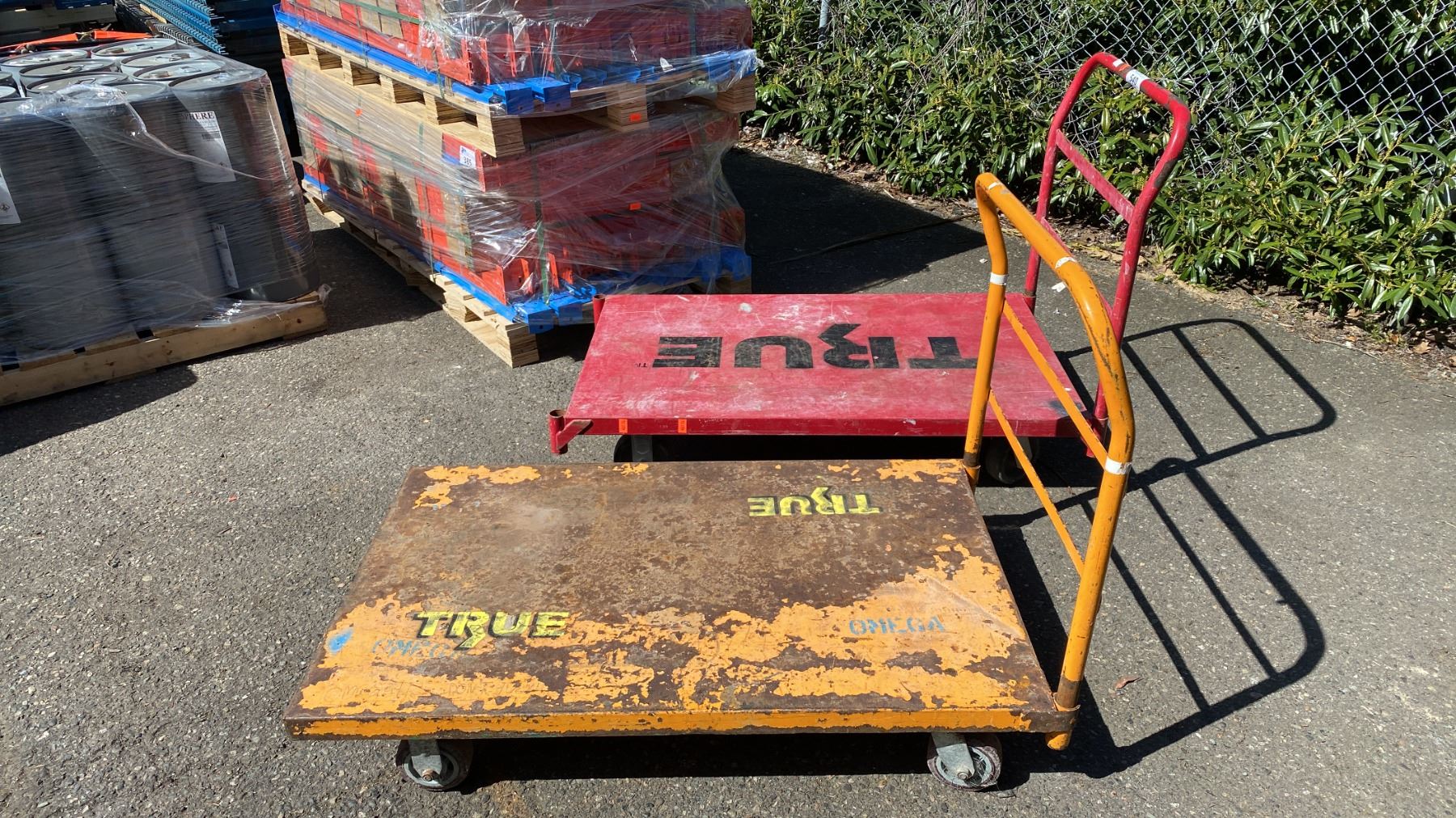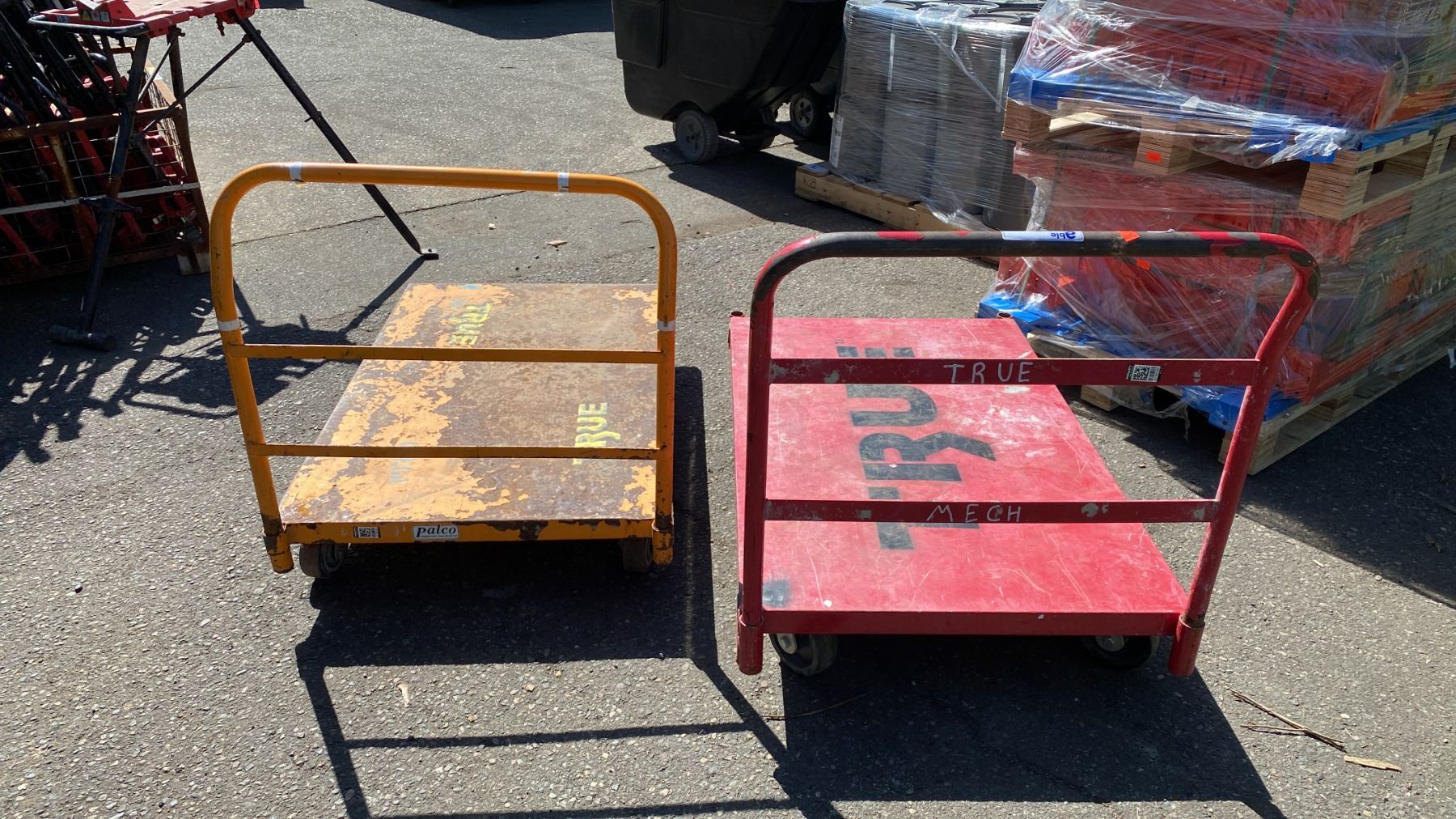 2 METAL PLATFORM TRUCKS- RED & YELLOW