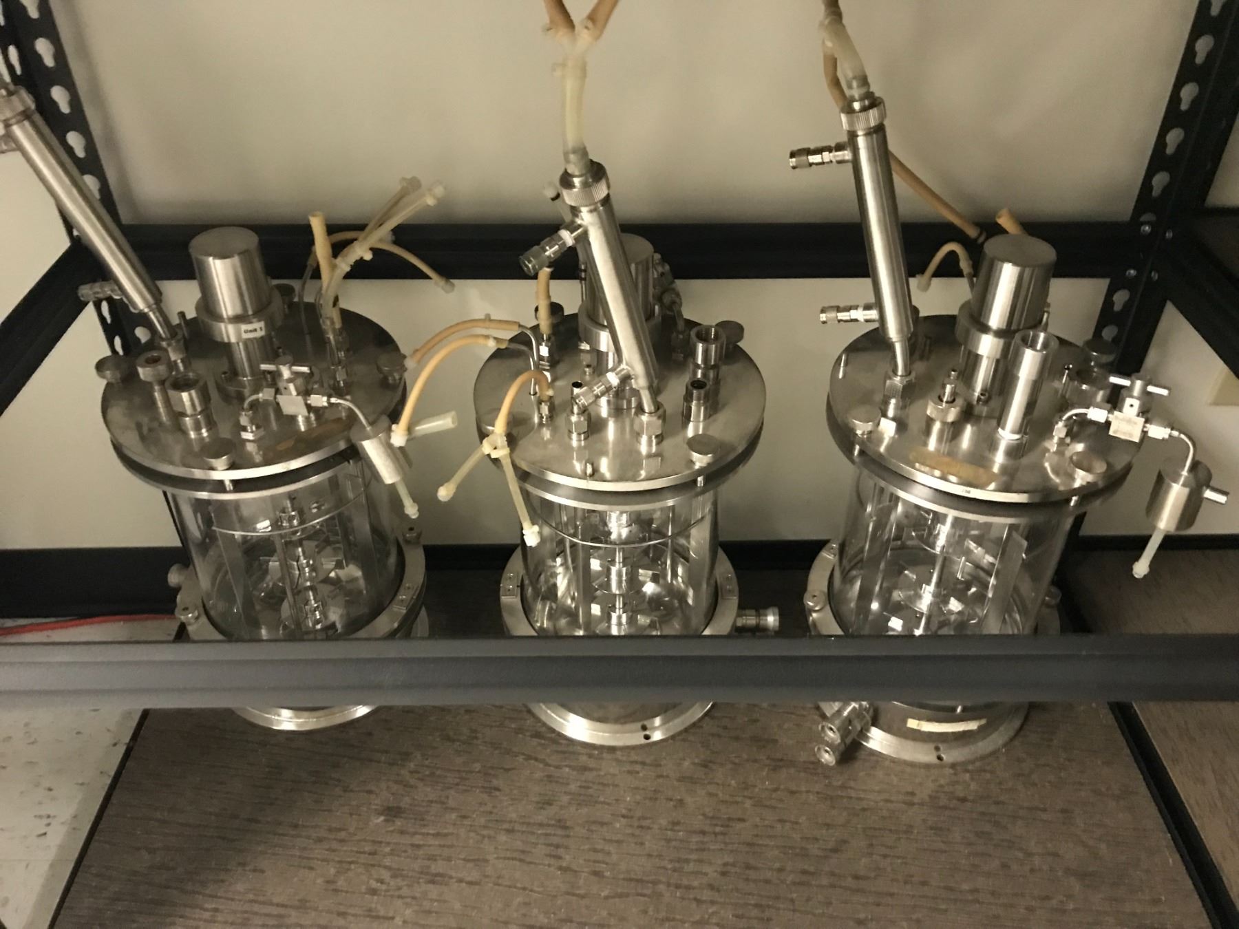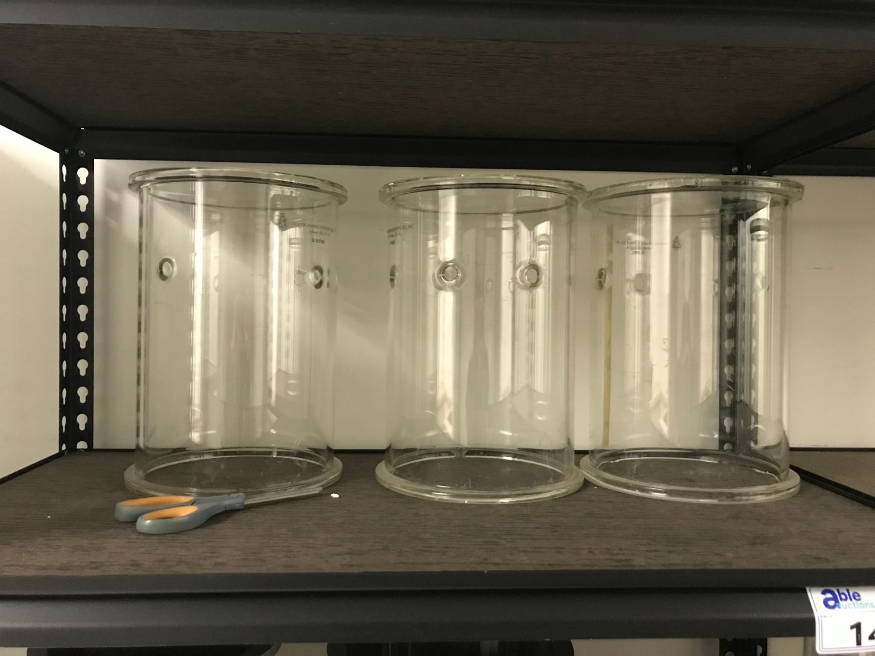 2 METAL SHELF UNITS W/NEW BRUNSWICK SCIENTIFIC FERMENTER/BIOREACTOR CONTAINMENT UNITS