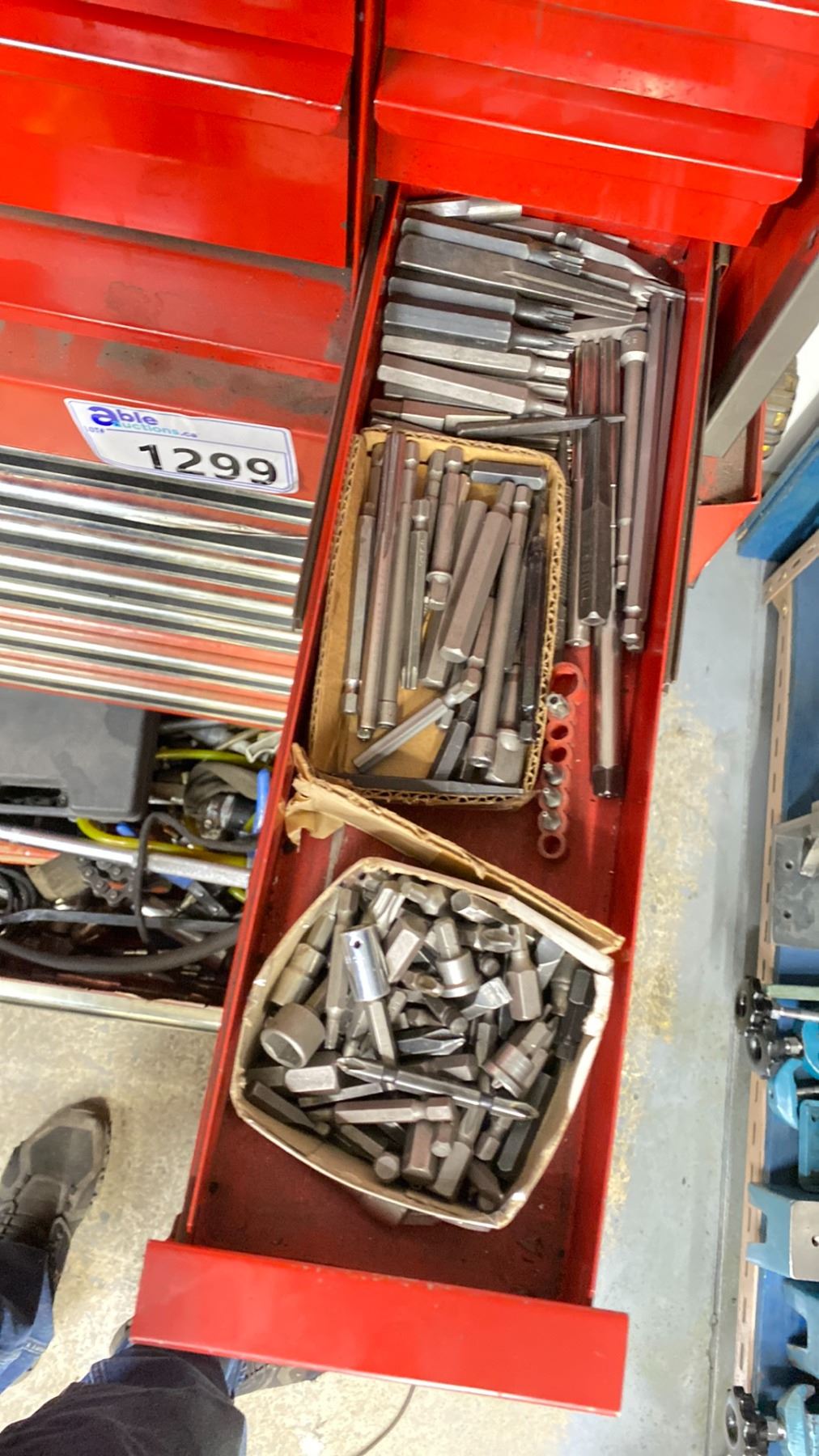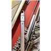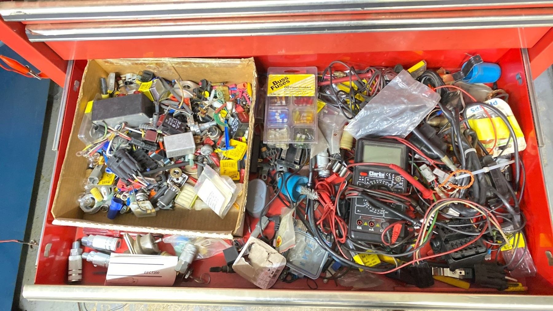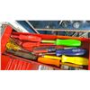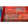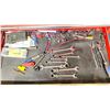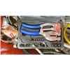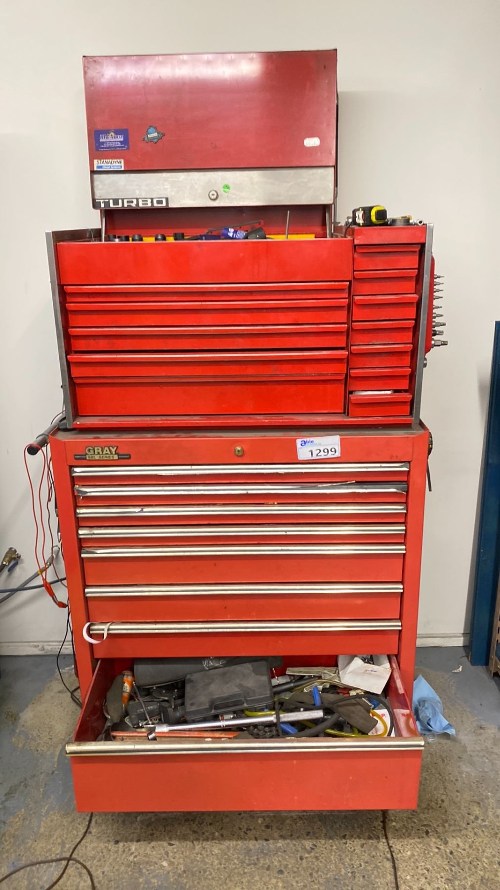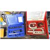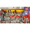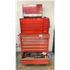 2 METAL TOOL BOXES. BOTTOM ON CASTORS. INC LARGE QUANTITY OF TOOLS. SOME SNAP-ON, GOOD VARIETY, HAMMERS, SCREWDRIVERS, COMB WRENCHES, MULTI-METERS AND MORE