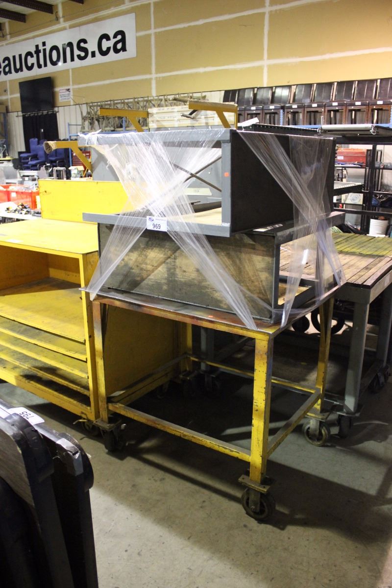 2 METAL WORK TABLES AND YELLOW METAL MOBILE WORK TABLE