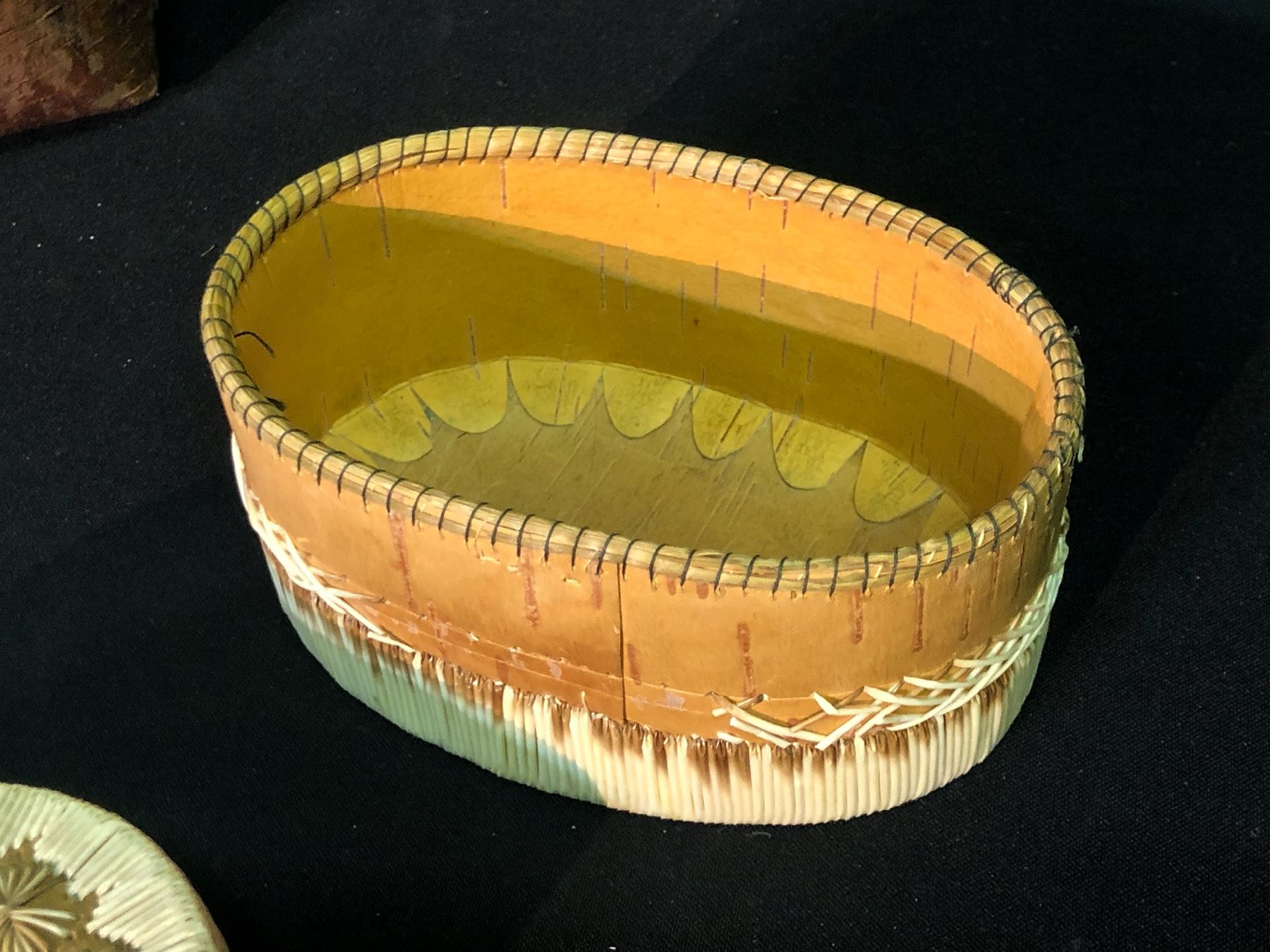 2 MI'KMAQ EAST COAST NATIVE BASKETS: LARGE OPEN BIRCH BARK WOVEN BASKET, 8" TALL, AND PORCUPINE QUILL MAPLE LEAF DESIGN LIDDED BASKET, 5.5" LONG