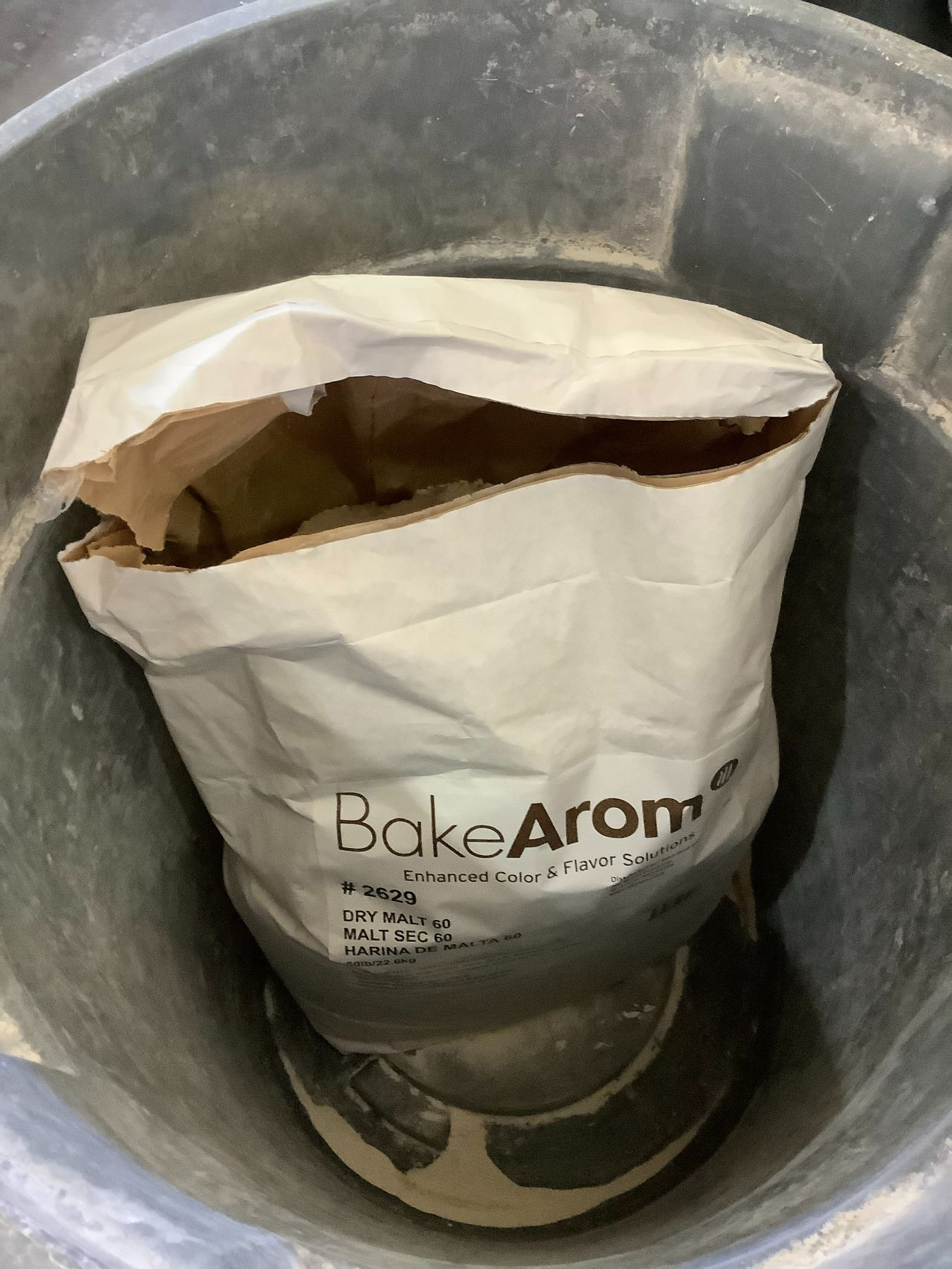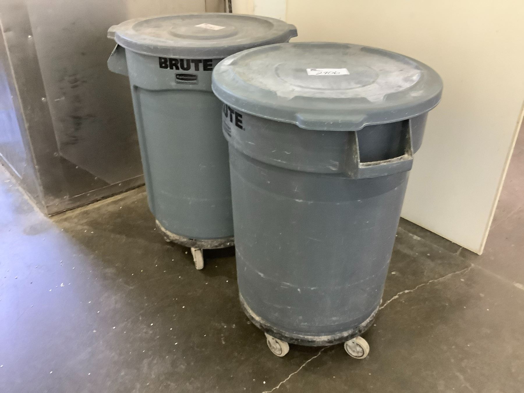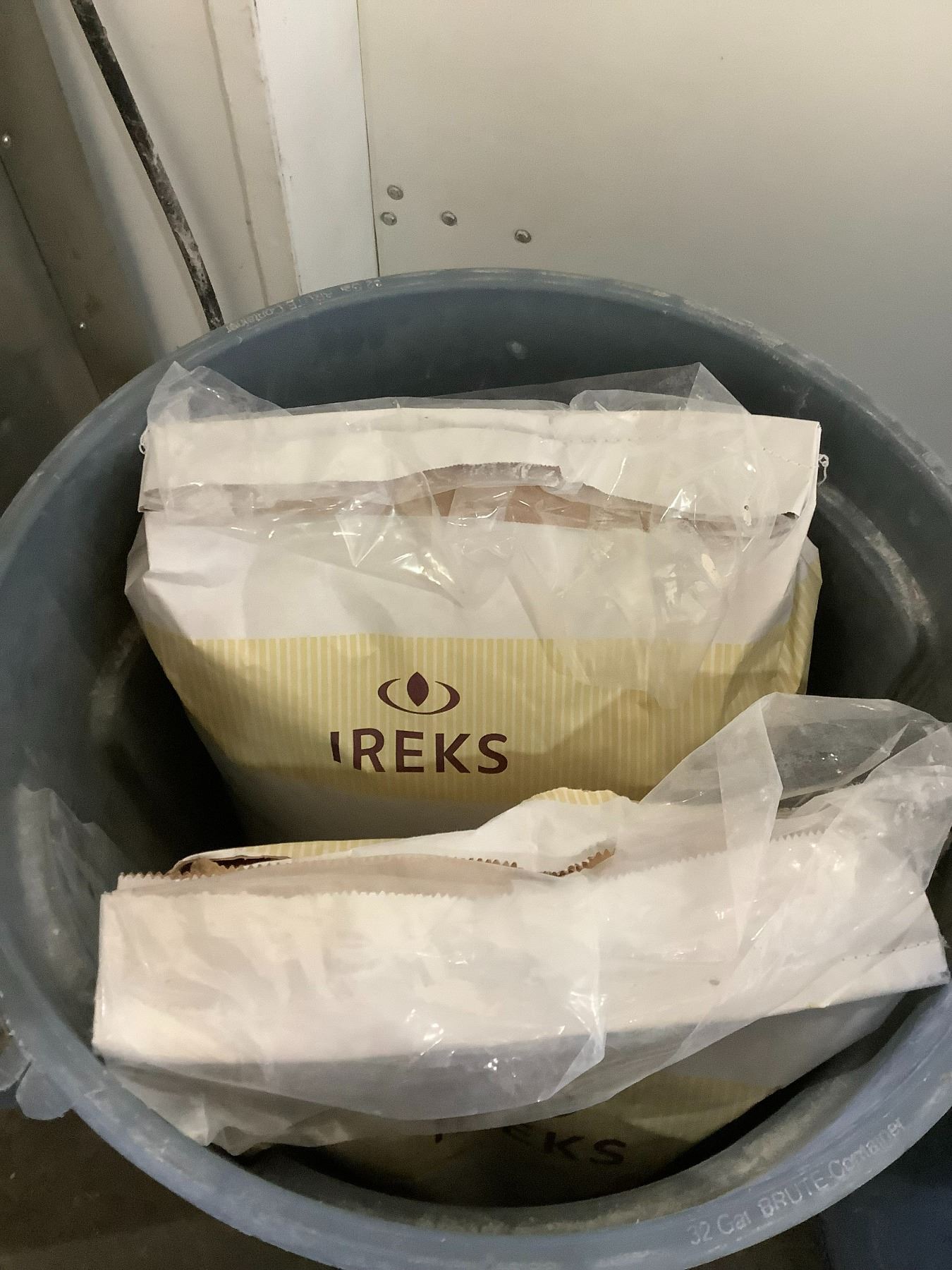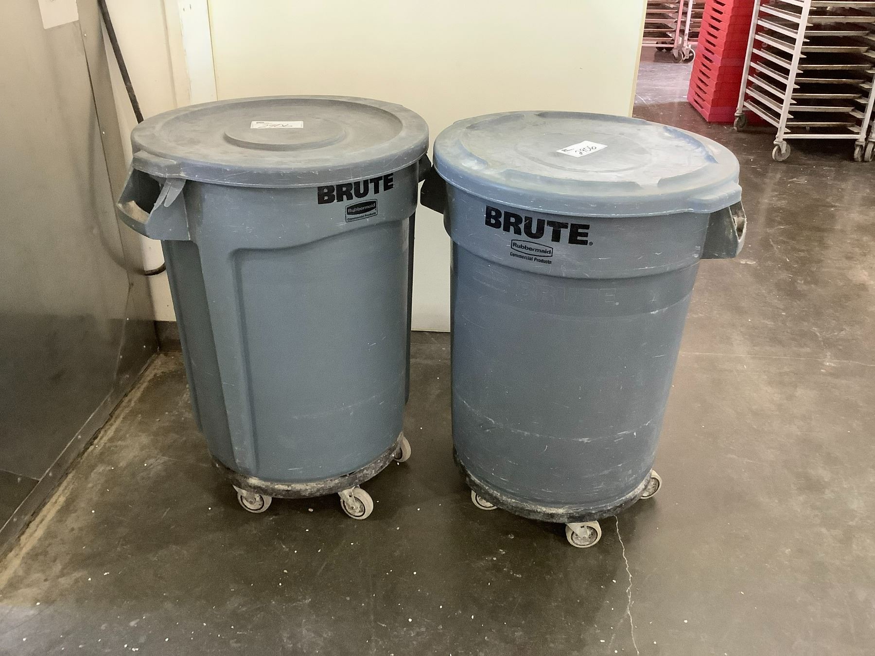 2 MOBILE RUBBERMAID BRUTE GARBAGE BINS WITH IREKS MULBERRY BREAD IMPROVER