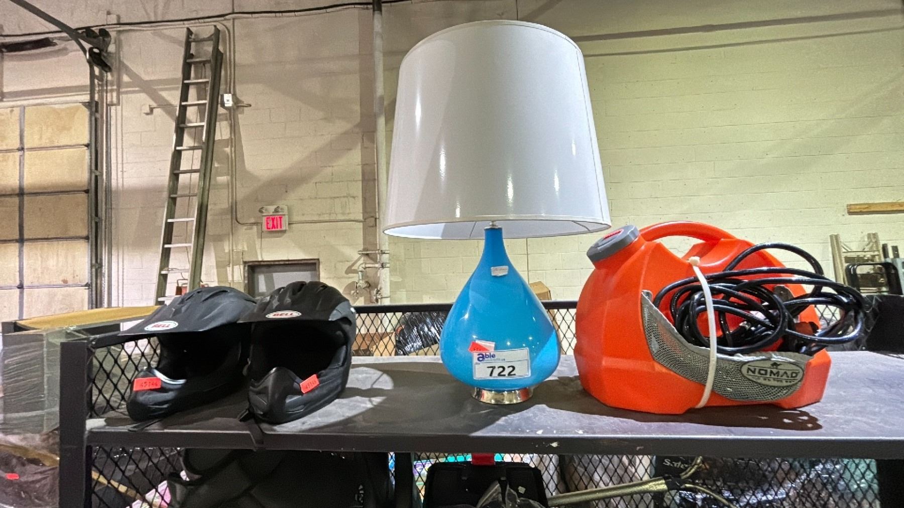 2 MOTORCYCLE HELMETS, TABLE LAMP AND NOMAD PORTABLE WASHER