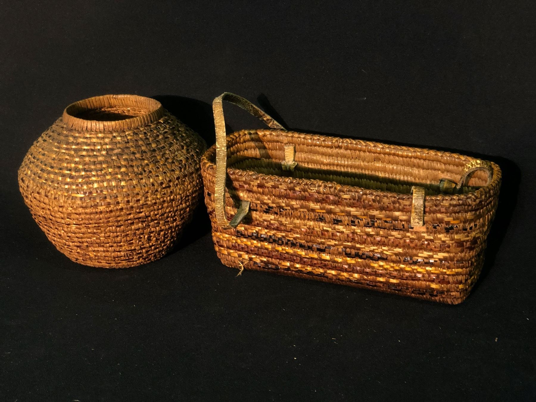 2 MT. CURRIE NATIVE WOVEN BASKETS: OPEN RECTANGLE WOVEN BASKETS WITH LEATHER STRAPS, 10.5" LONG, AND WOVEN OPEN BASKETRY JAR, 6" TALL