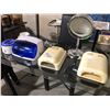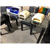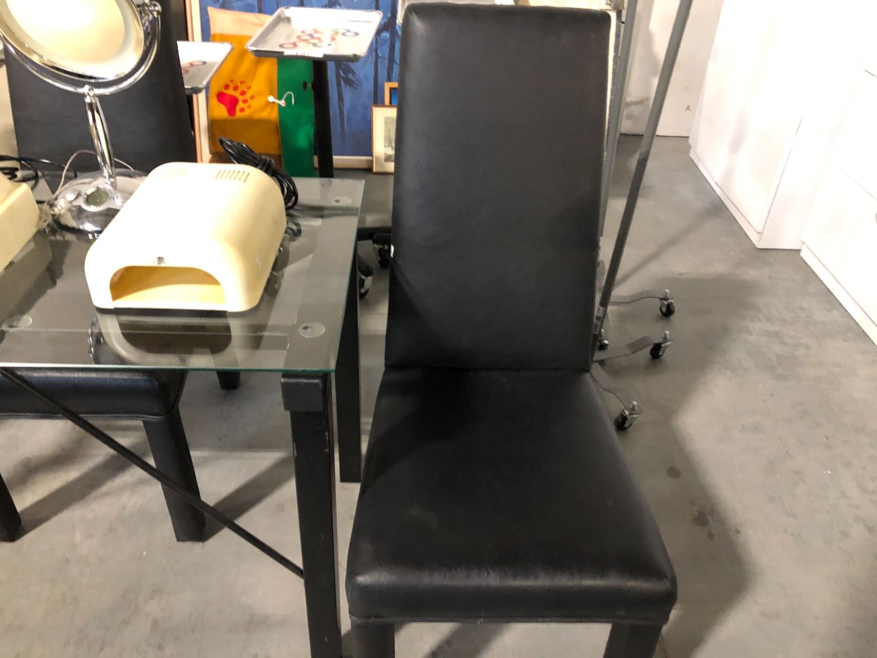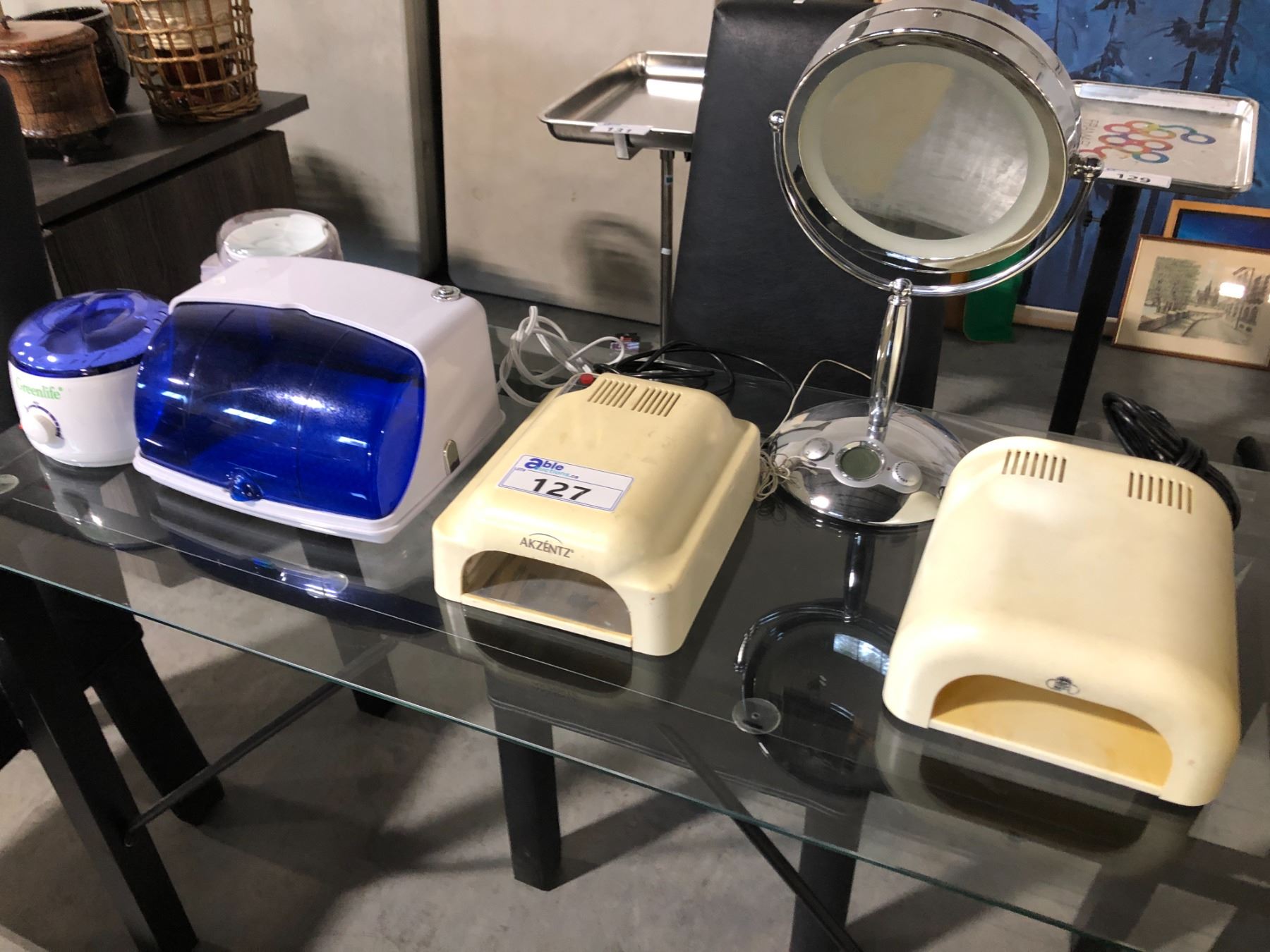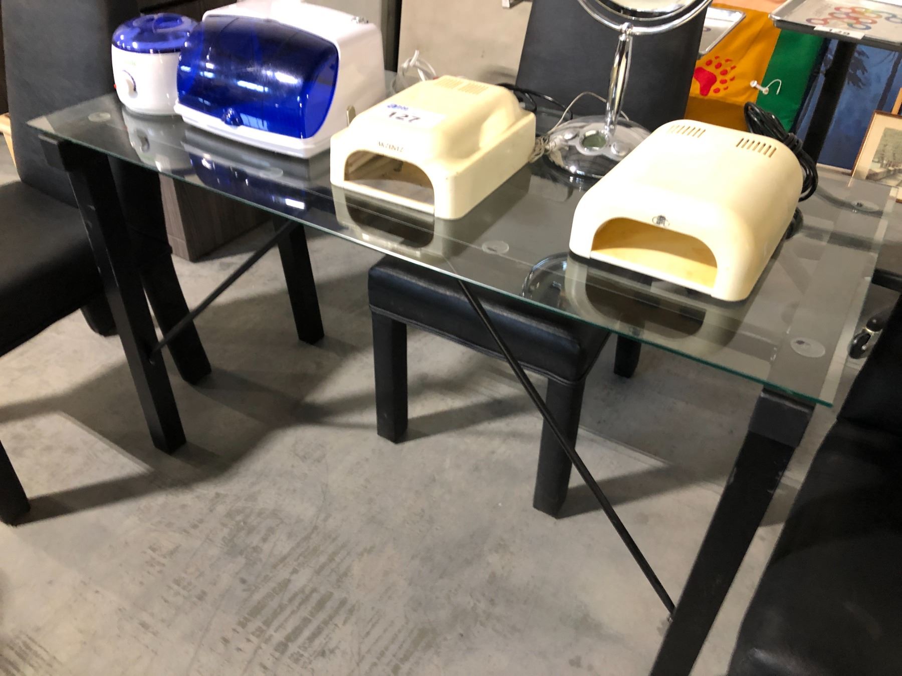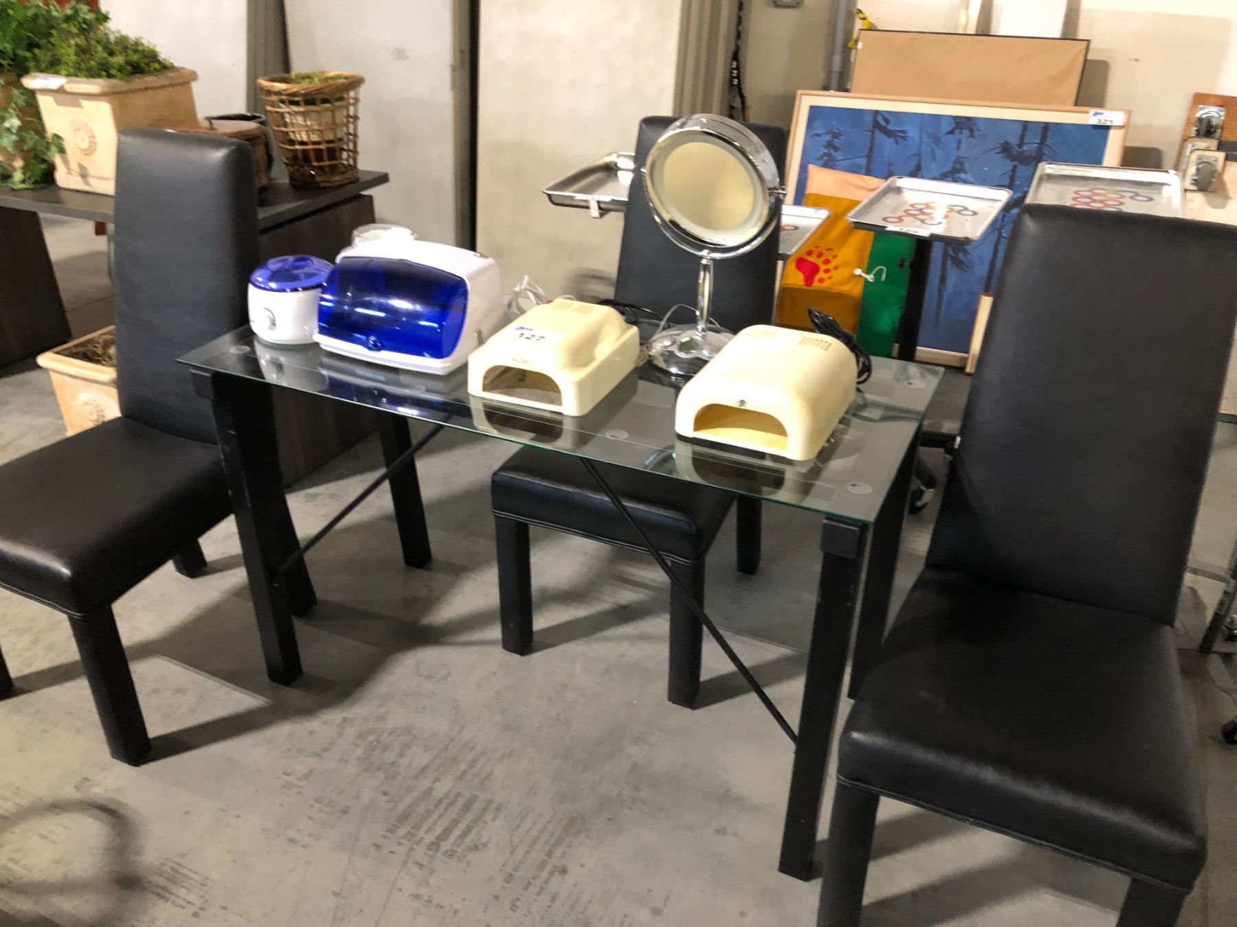 2 NAIL CURING DRYERS, SANITATION UNITS, WAX WARMER, 3 SIDE CHAIRS AND GLASS 48" WIDE TABLE
