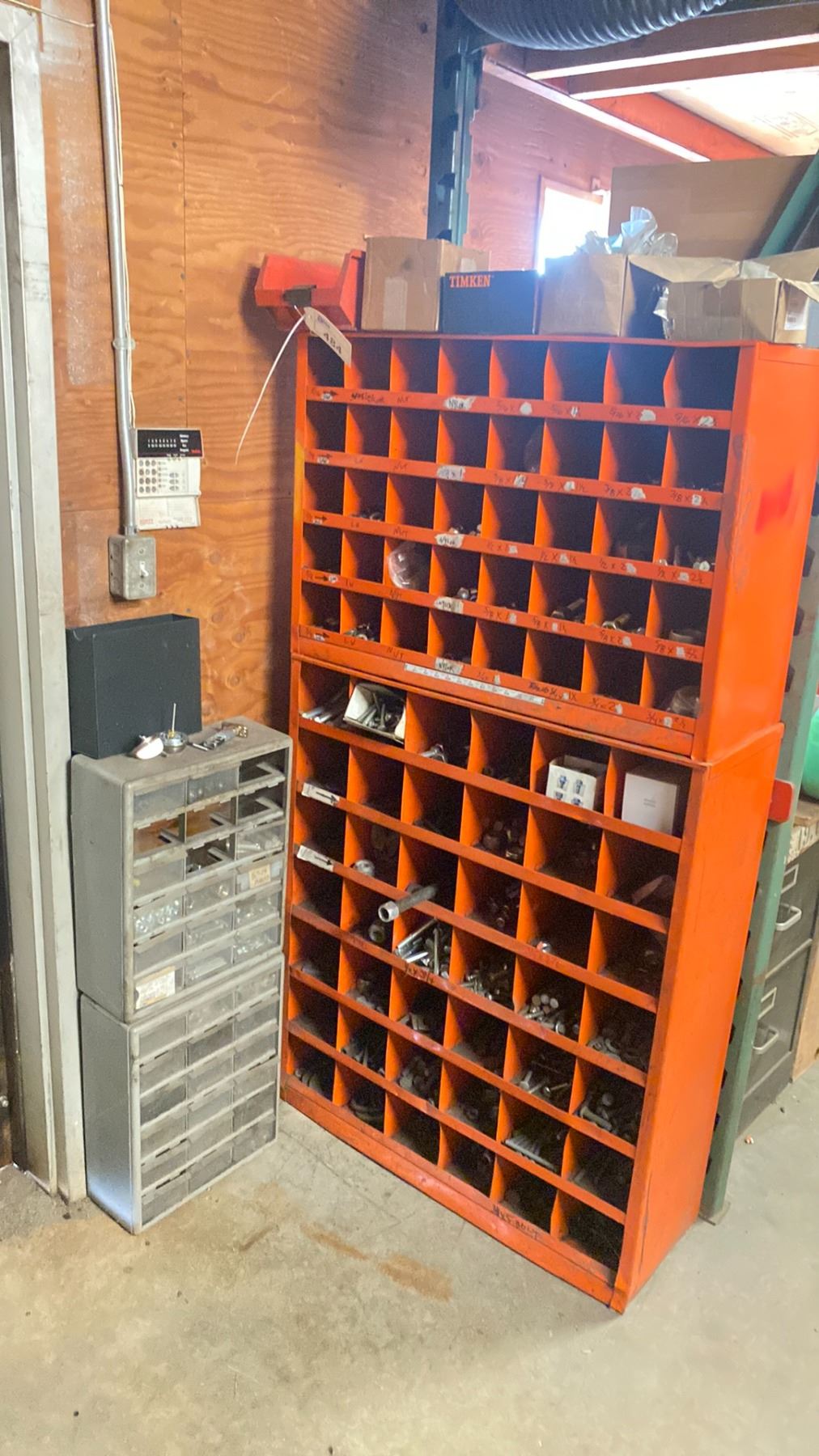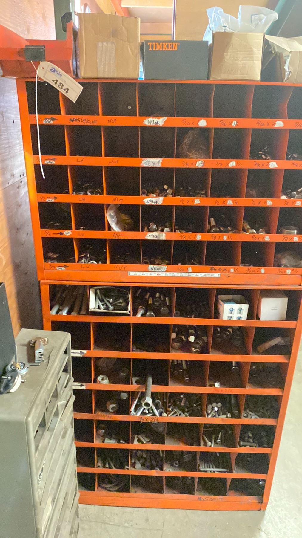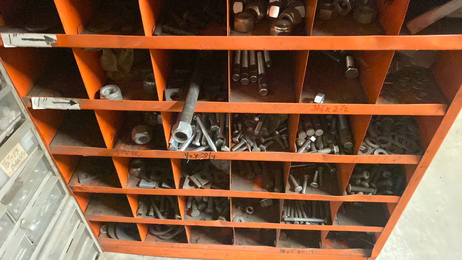 2 ORANGE PIGEON HOLE PARTS ORGANIZERS WITH CONTENTS - NUTS, BOLTS, WASHERS & 2 SMALL PLASTIC PARTS ORGANIZERS WITH CONTENTS
