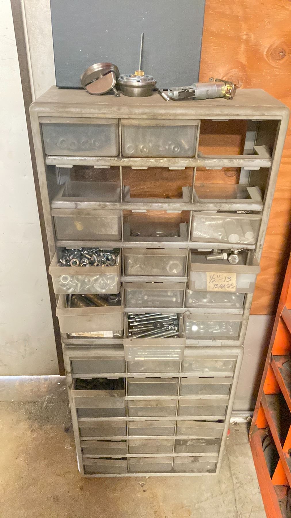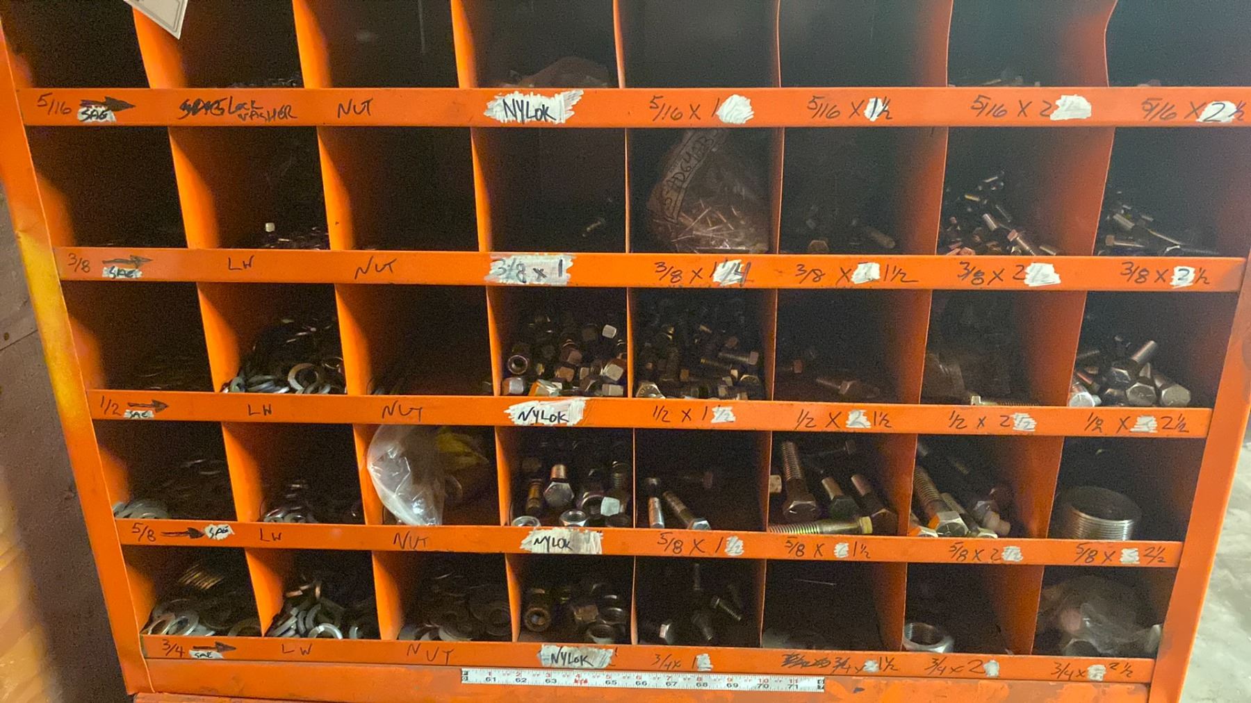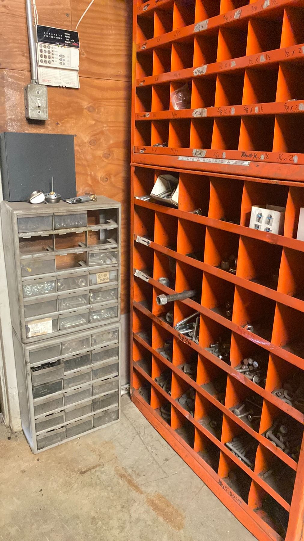 2 ORANGE PIGEON HOLE PARTS ORGANIZERS WITH CONTENTS - NUTS, BOLTS, WASHERS & 2 SMALL PLASTIC PARTS ORGANIZERS WITH CONTENTS