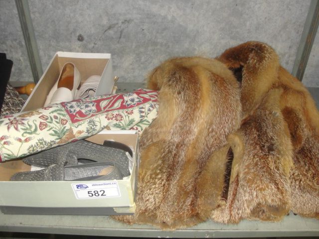 2 PAIRS OF EXPENSIVE MENS DESIGNER SHOES, LADIES FUR COAT AND A WALL HANGING HAND STITCHED TAPESTRY