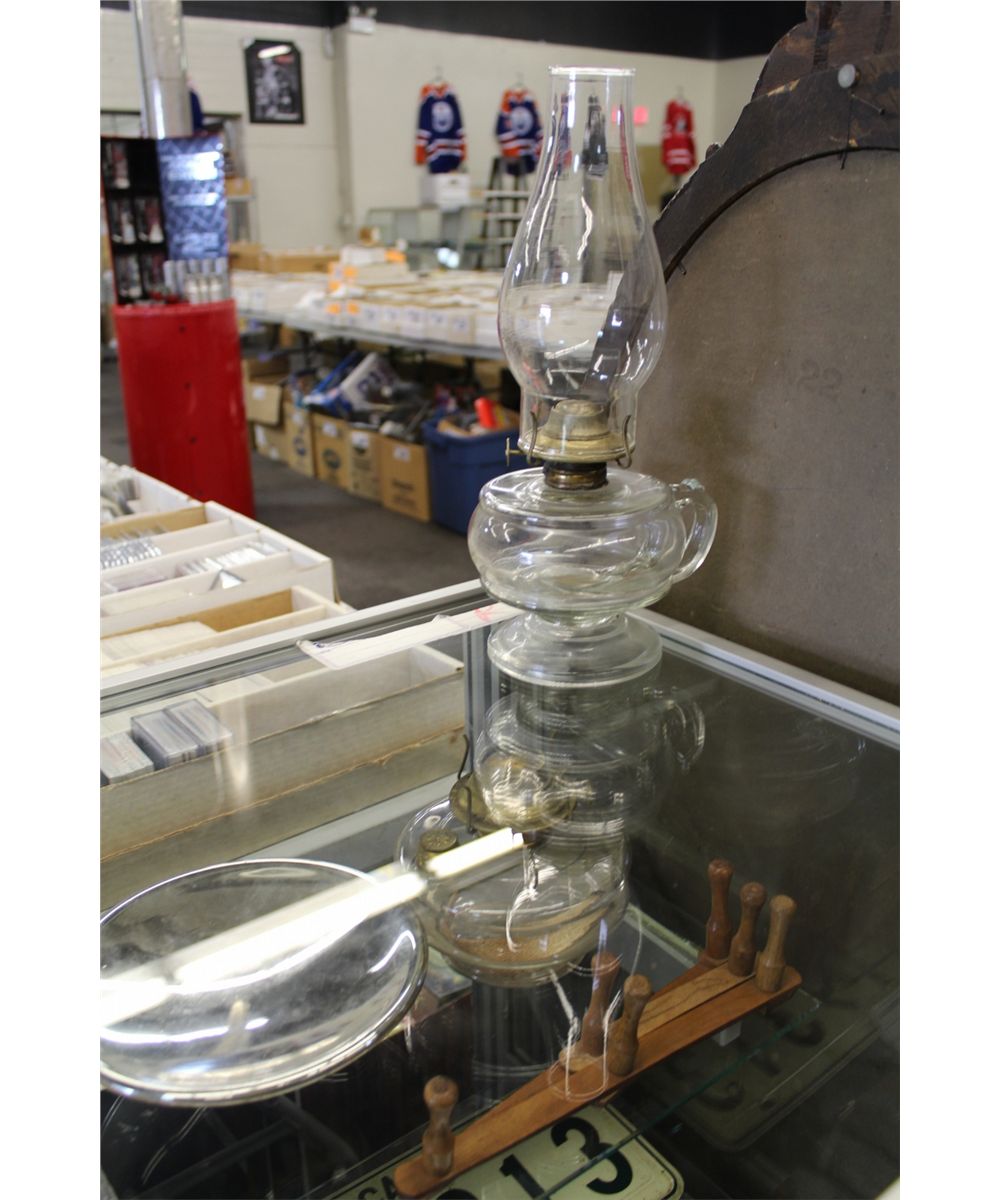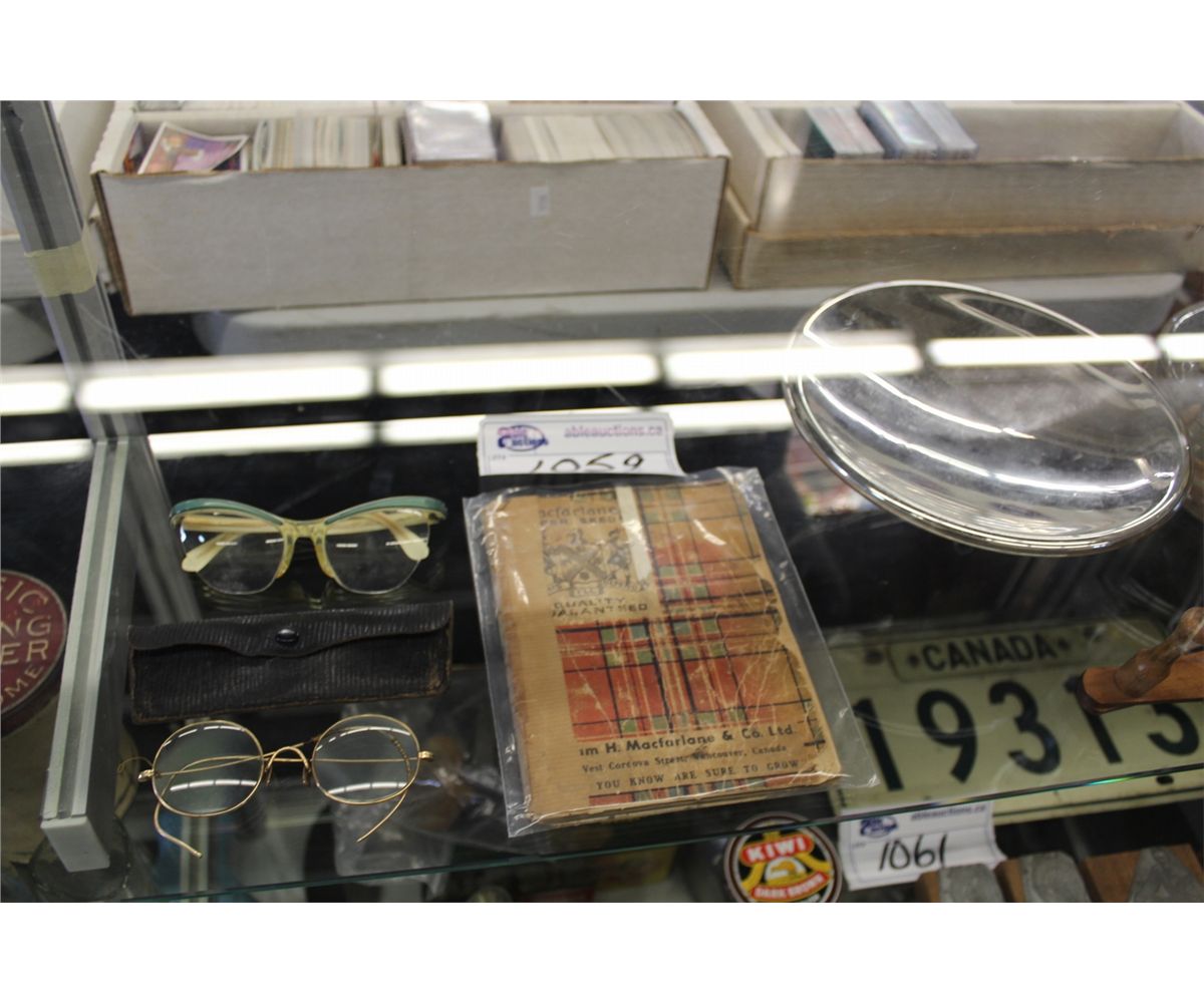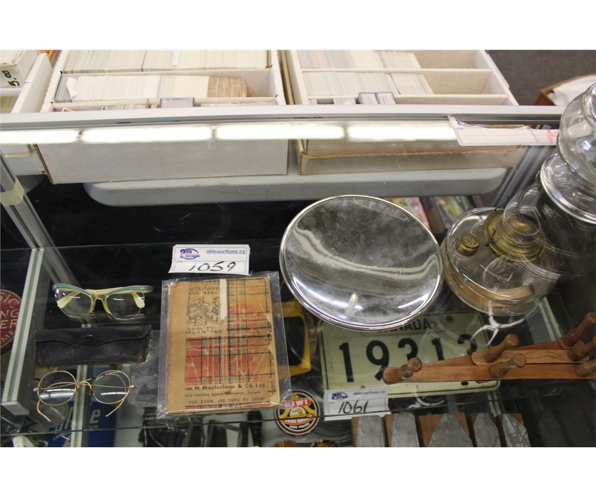 2 PAIRS VINTAGE GLASSES, 2 GLASS KEROSENE LANTERNS, MACFARLENE NOTEBOOK AND COAT RACK AND OTHER COLLECTIBLES