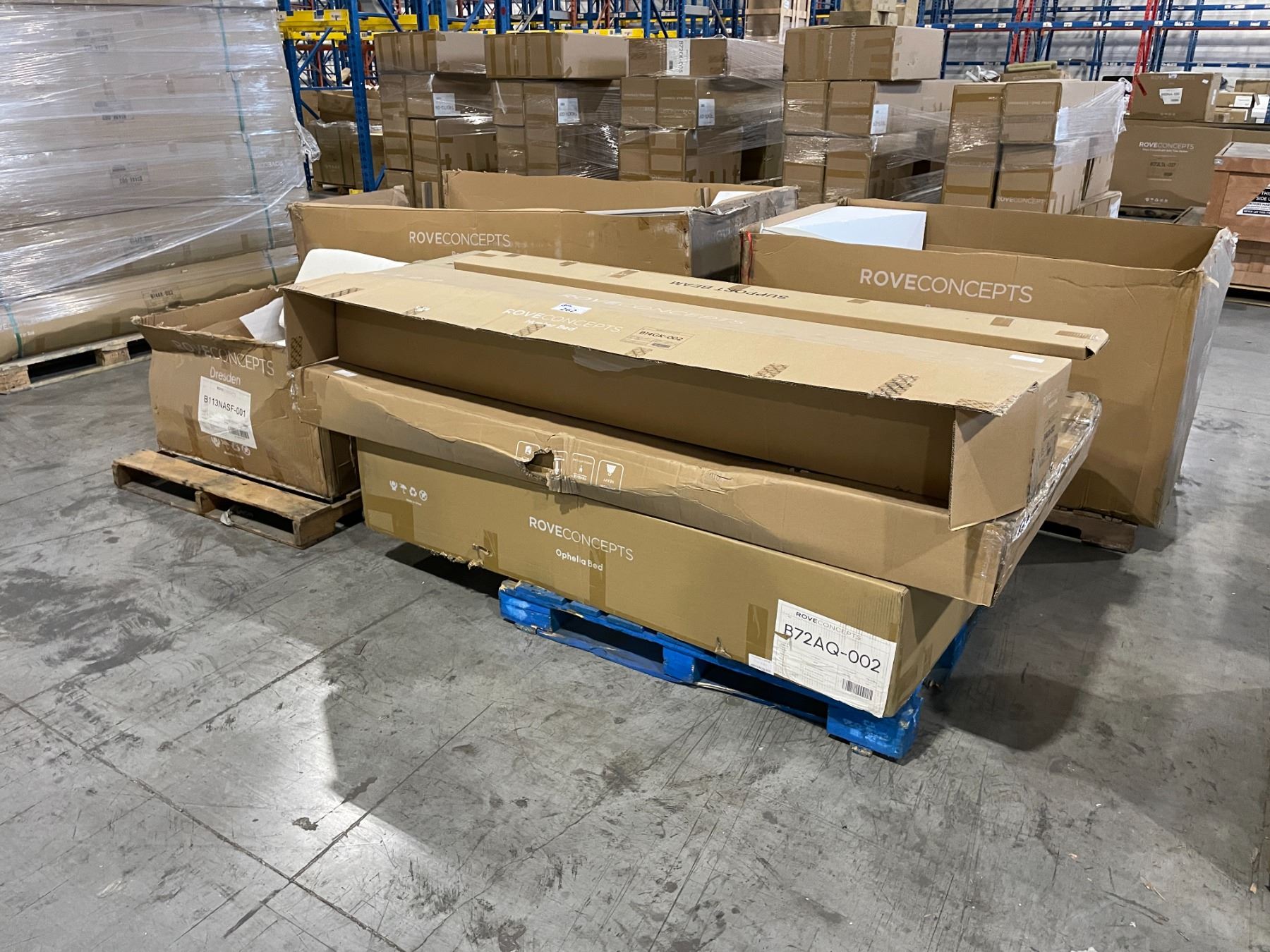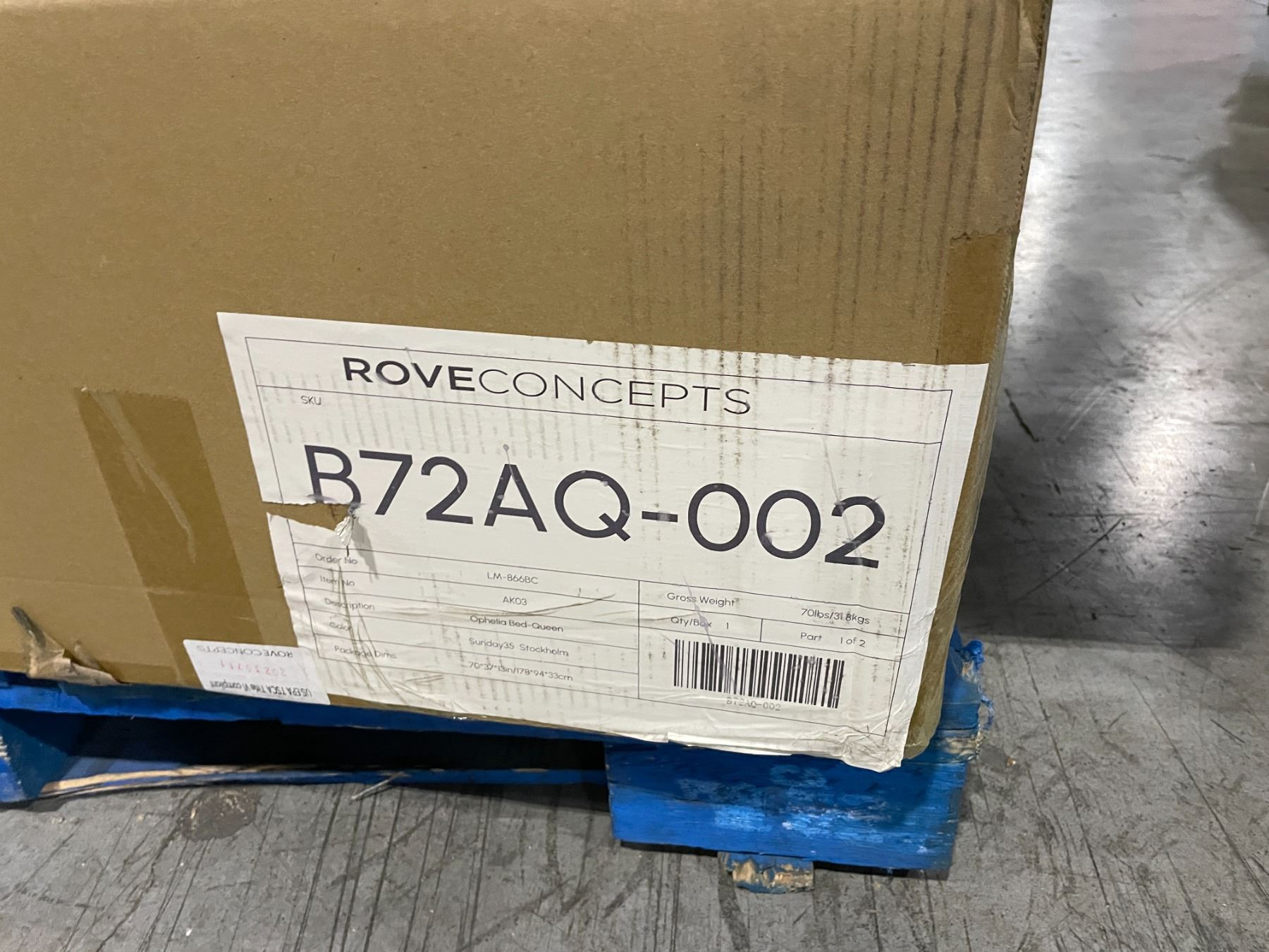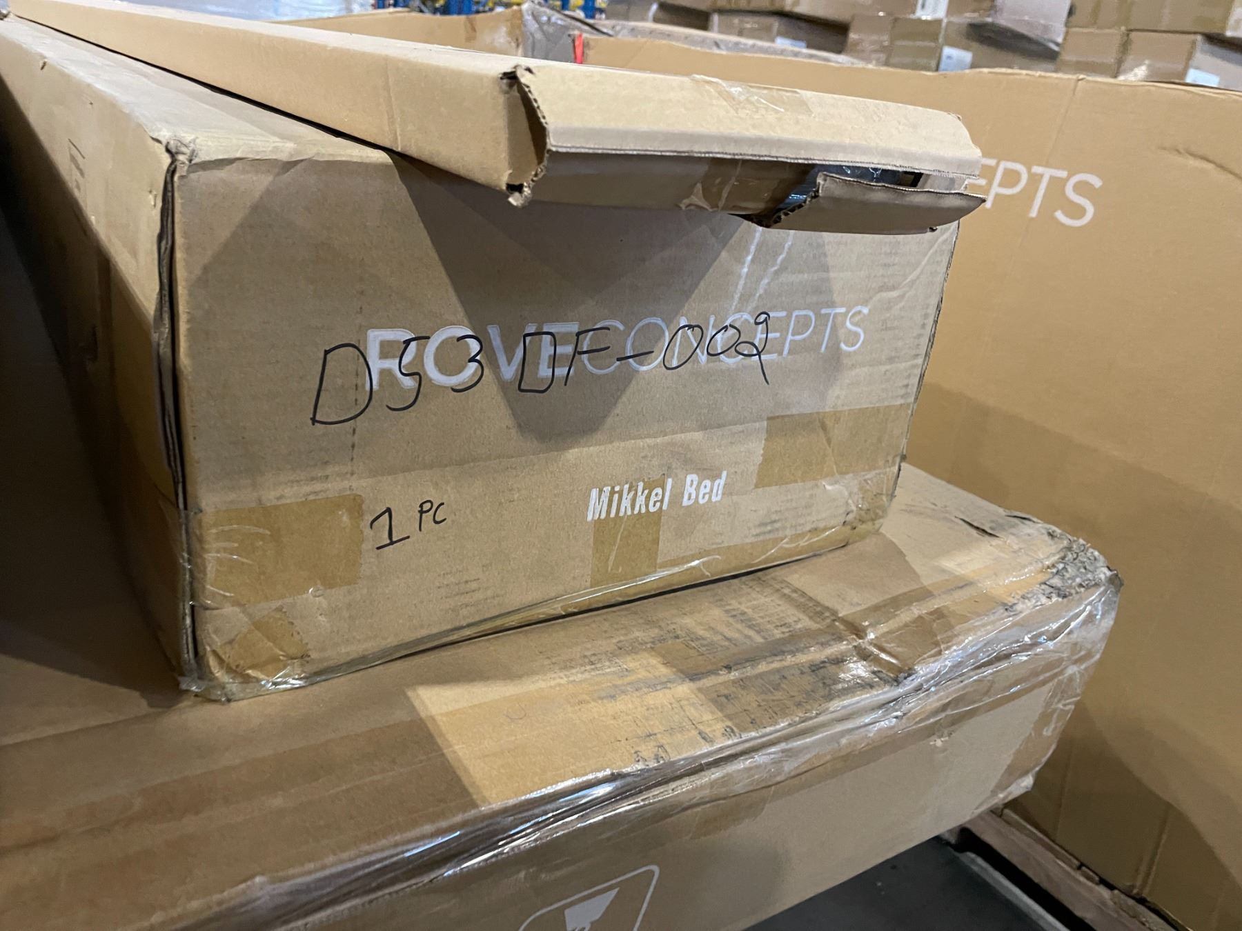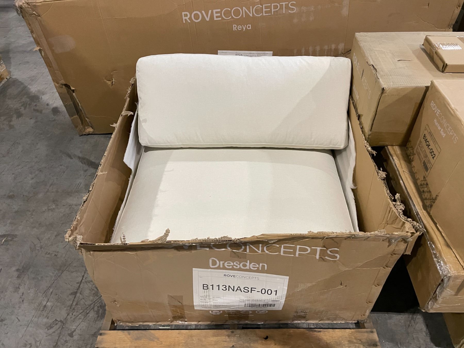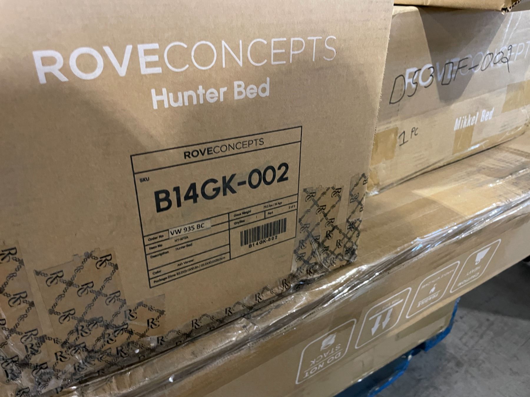 2 PALLET OF ROVE CONCEPTS DESIGNER DRESDEN LINEN ARMLESS SECTIONAL SECTION & ASSORTED BED PARTS IN BOX *MUST TAKE ALL ON BOTH PALLETS*