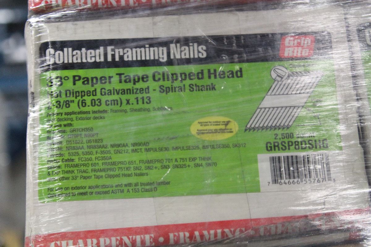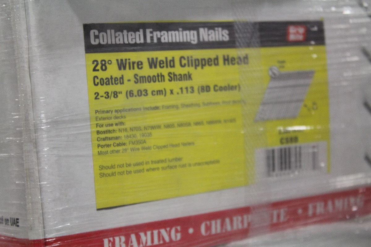 2 PALLETS OF 2-3/8 WIRE WELD CLIPPED HEAD FRAMING NAILS & 2 PALLETS OF 1-1/2 ADHESIVE COATED TRIM NAILS