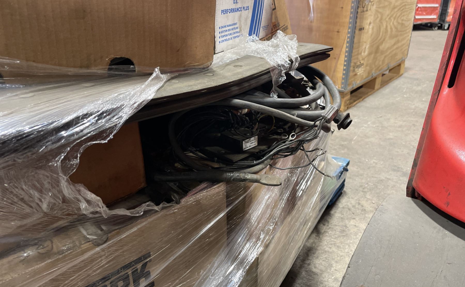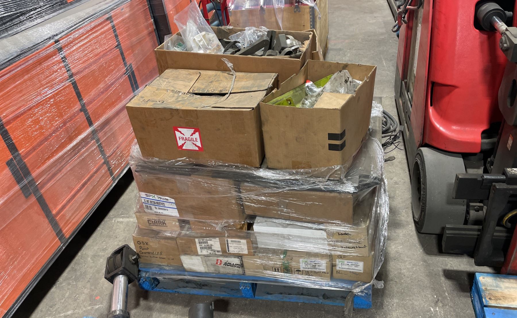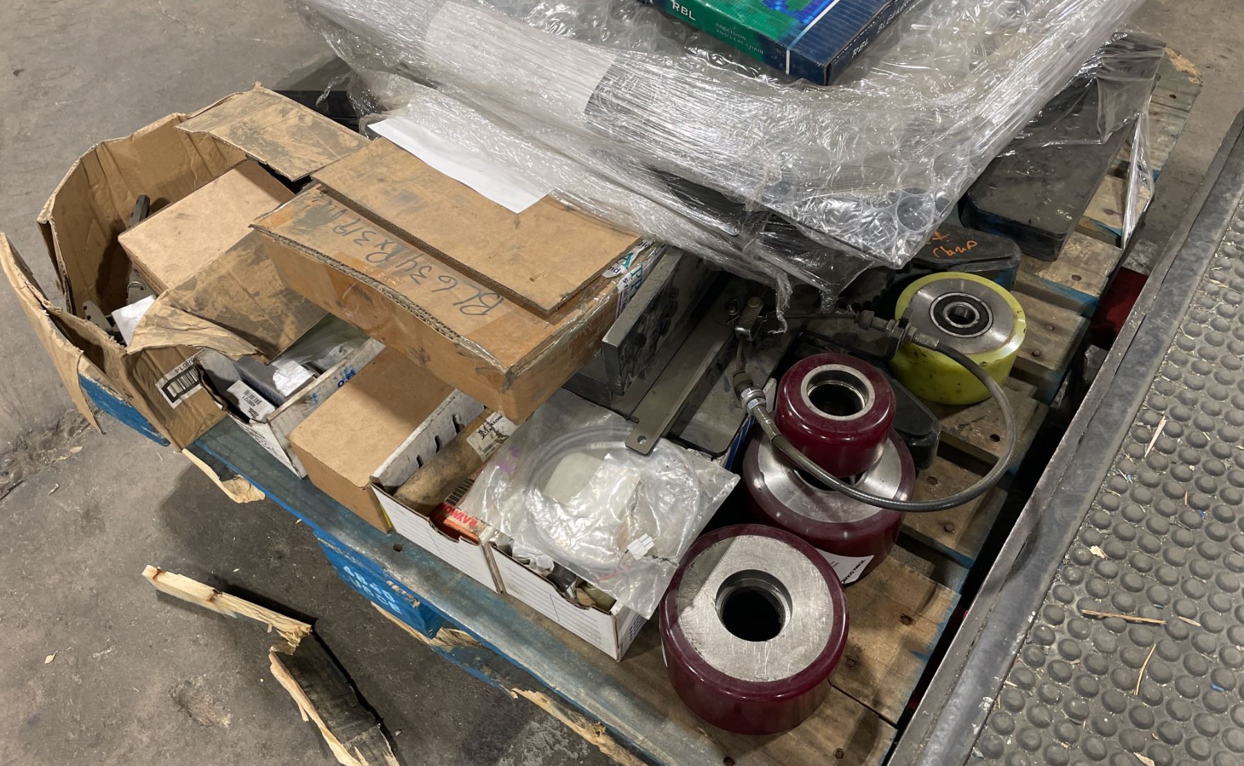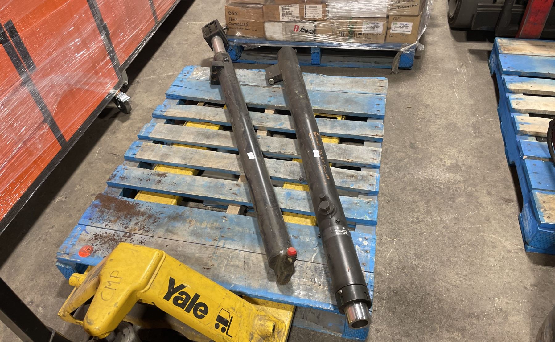 2 PALLETS OF ASSORTED INDUSTRIAL ORDER PICKER / REACH TRUCK PARTS & PALLET OF HEAVY DUTY MAST HYDRAULIC CYLINDERS