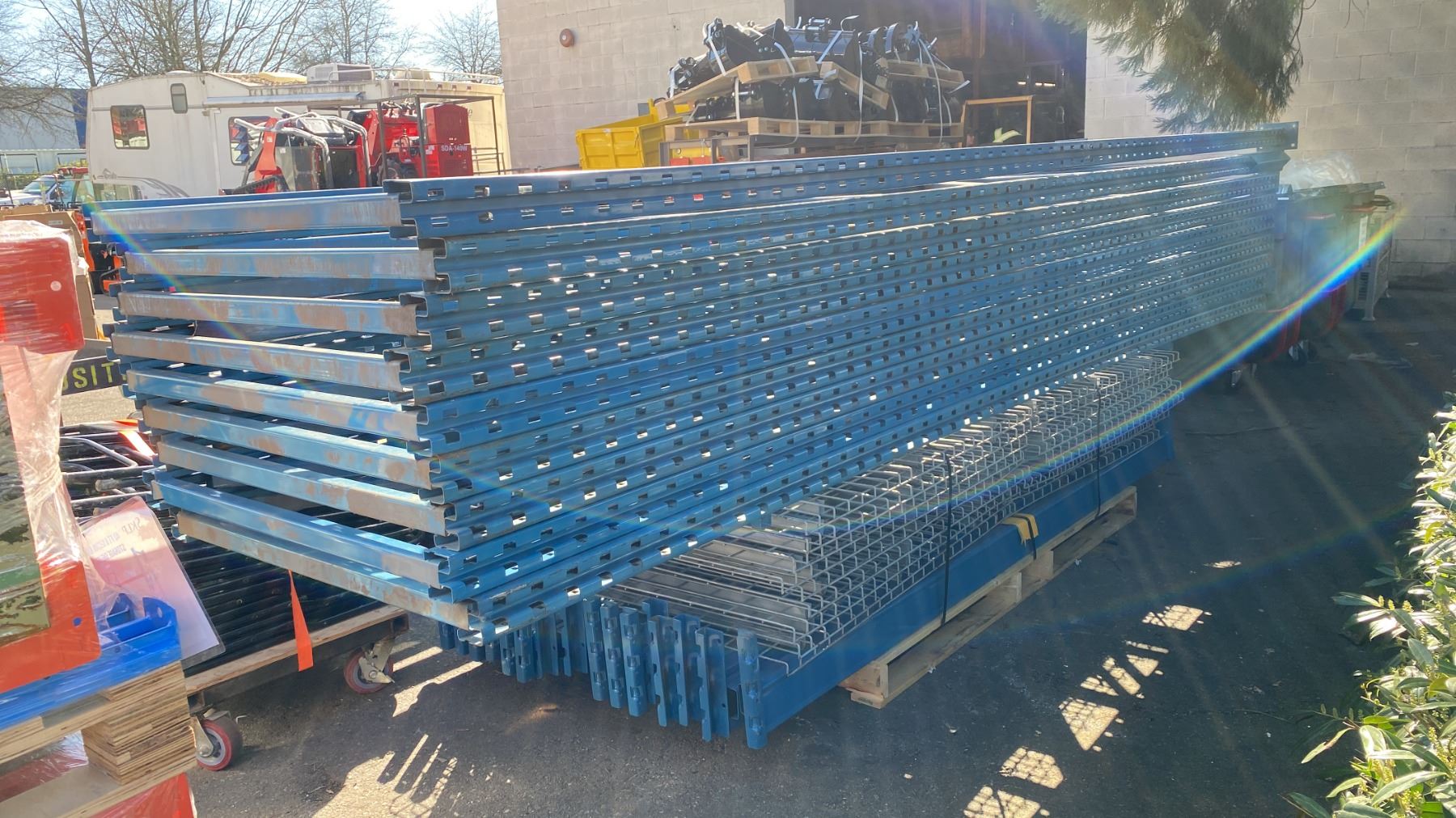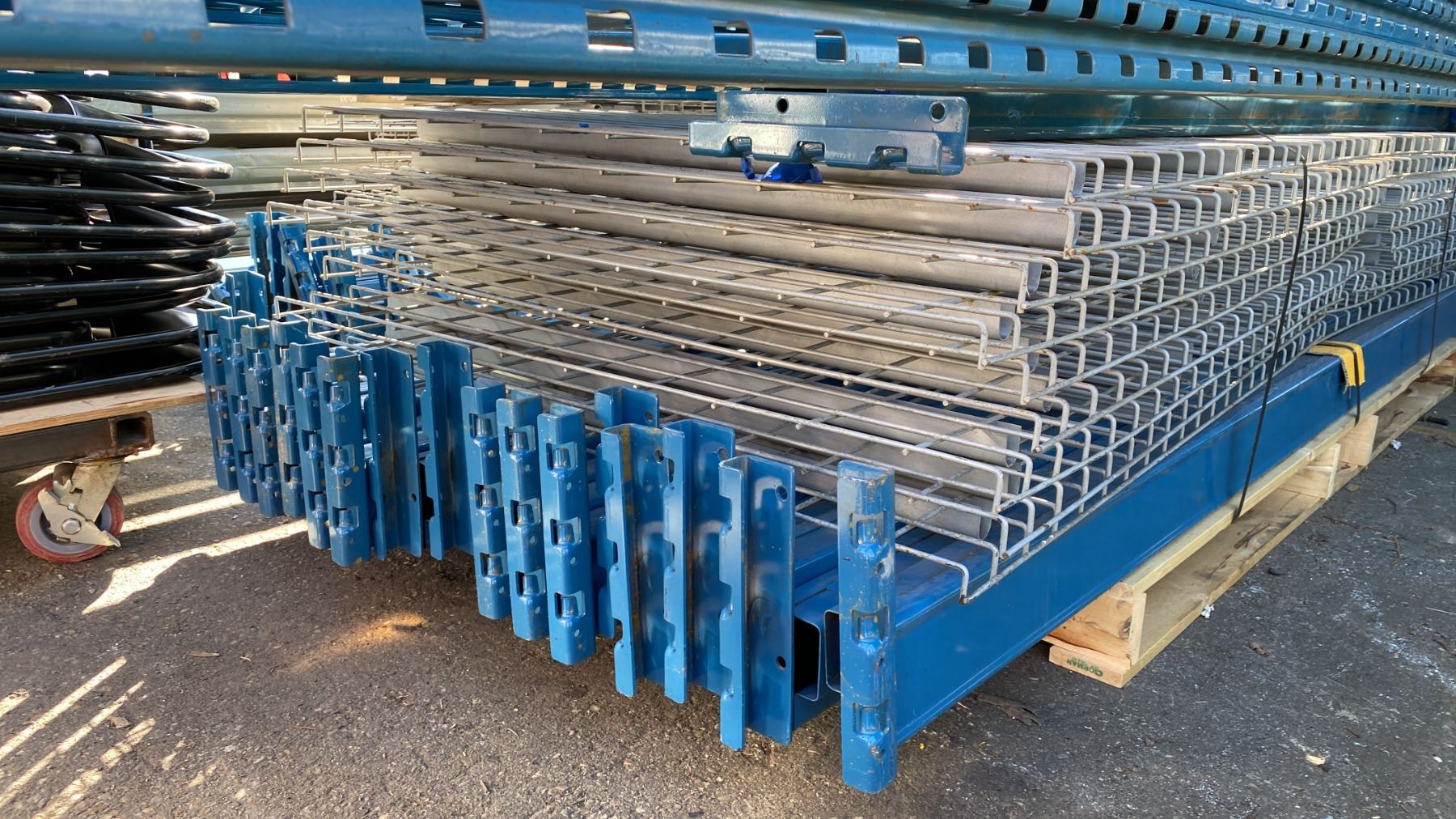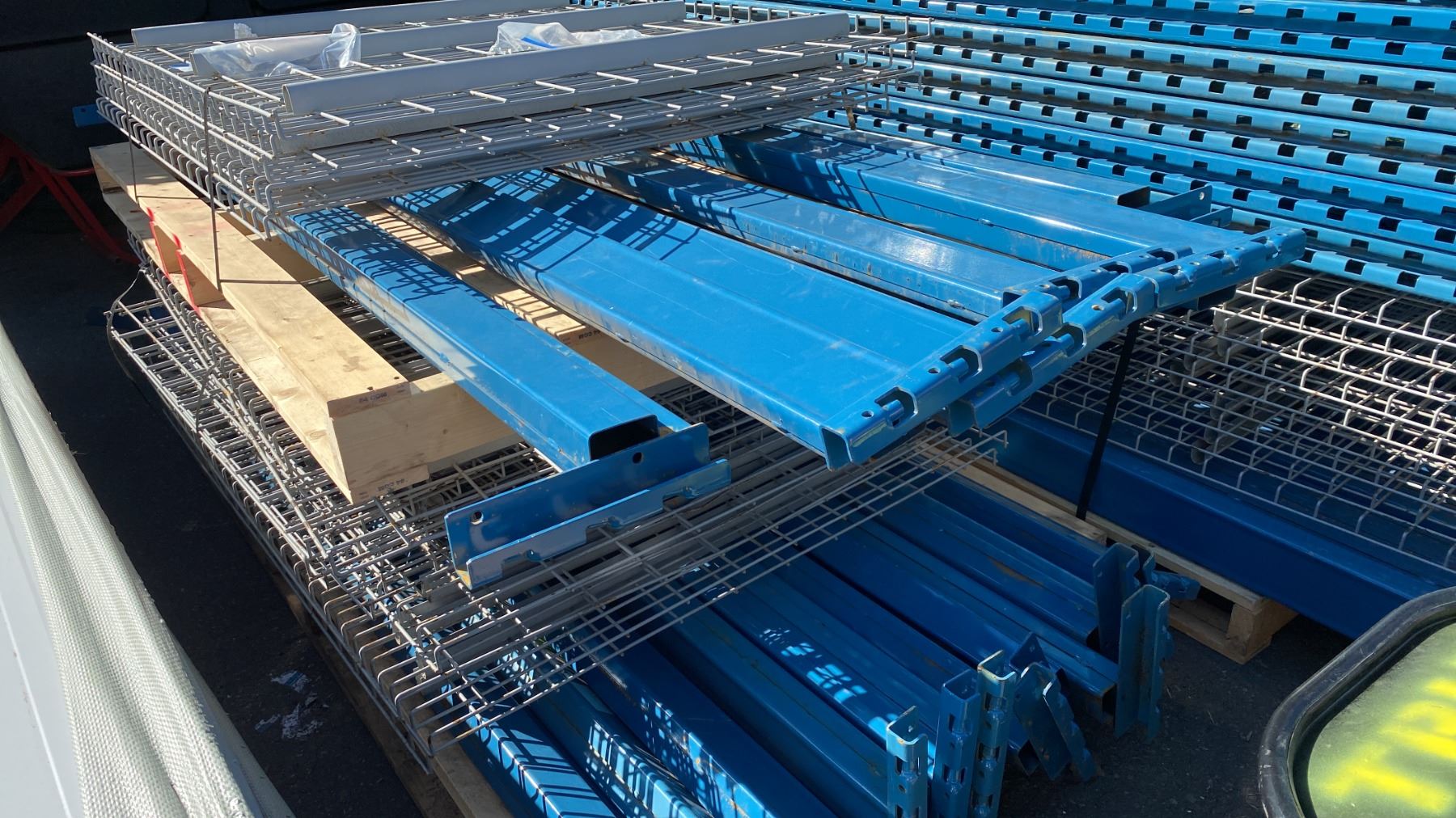 2 PALLETS OF BLUE 12' INDUSTRIAL PALLET RACKING INCLUDING 9- 12' UPRIGHTS, 36- 8' CROSSBARS & ASSORTED MESH DECKING
