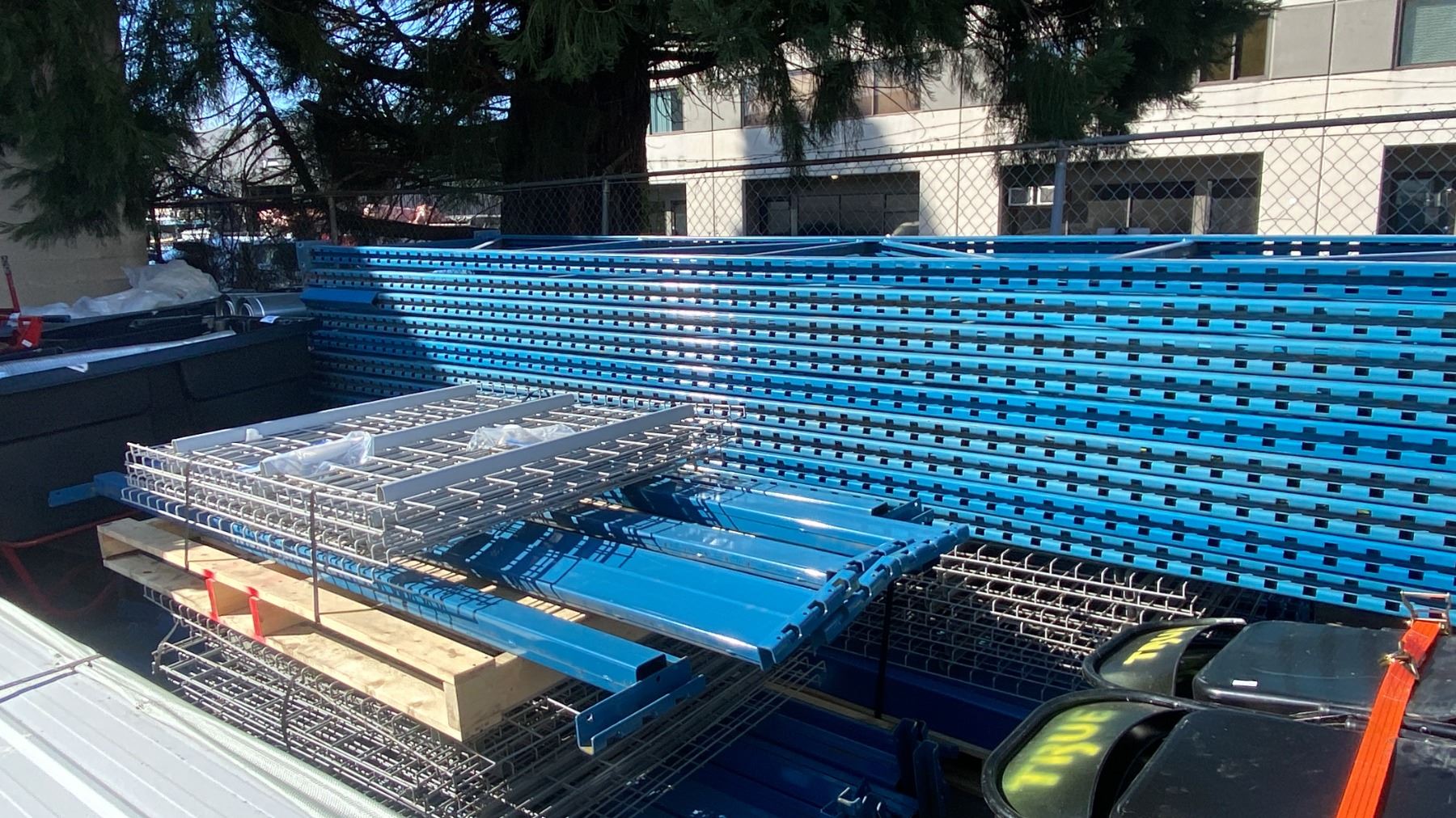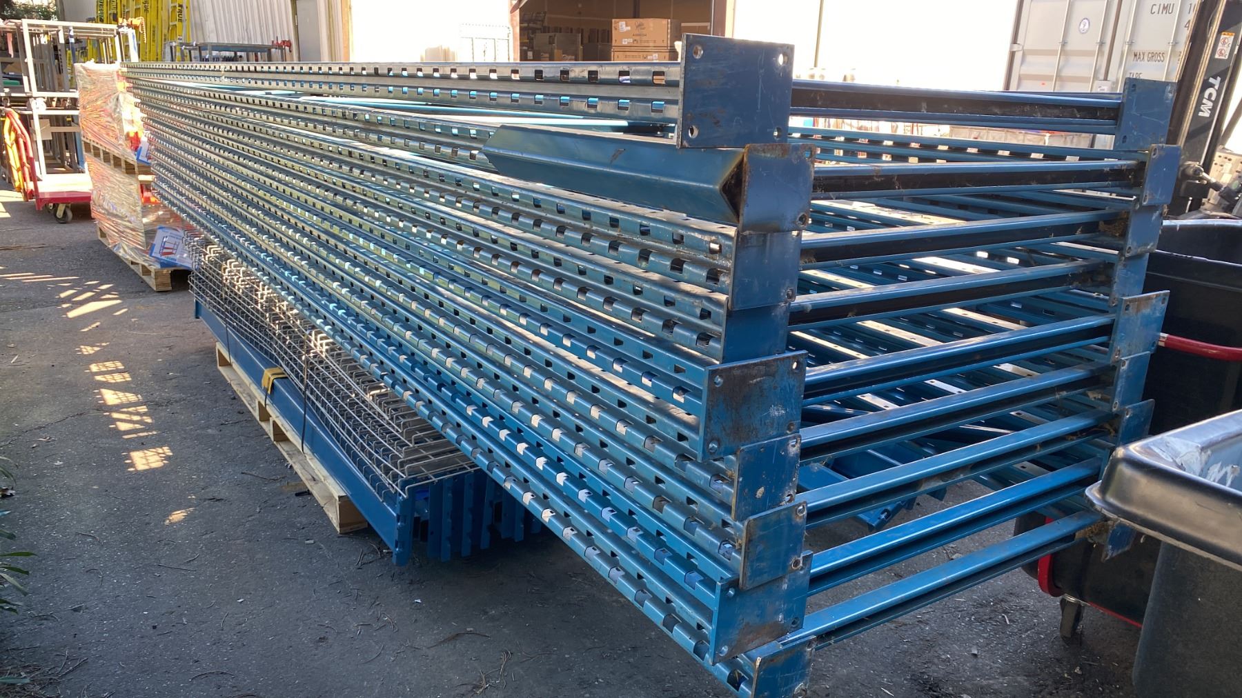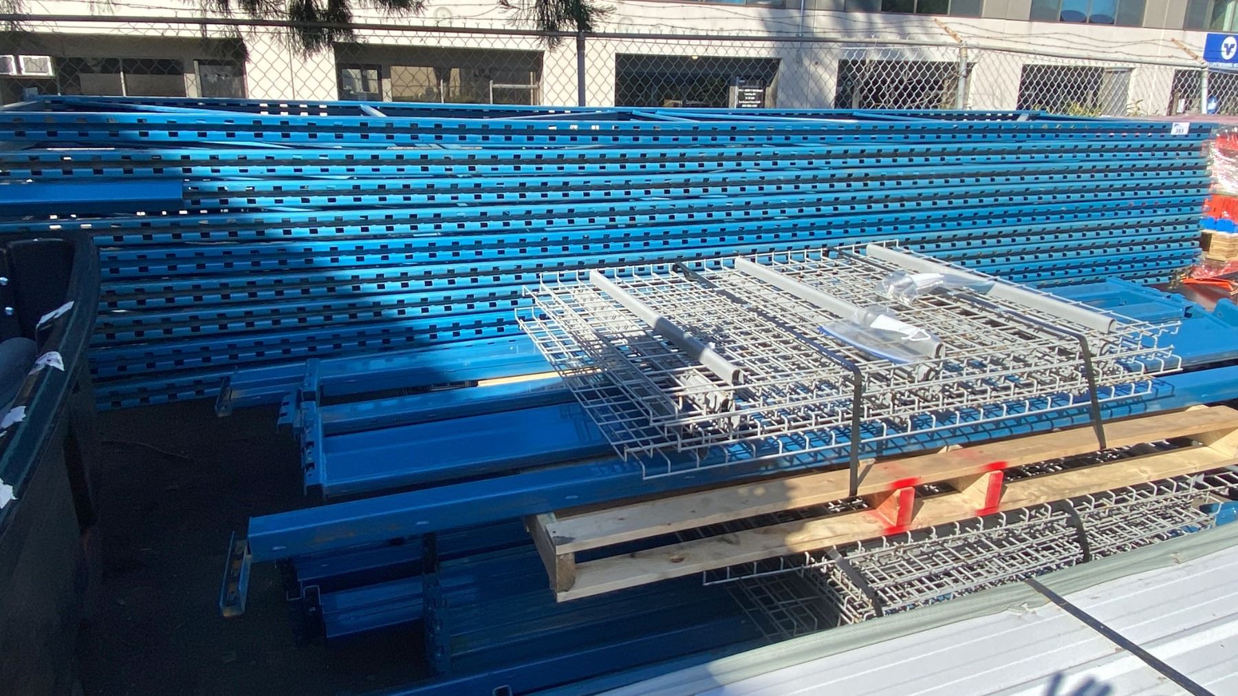 2 PALLETS OF BLUE 12' INDUSTRIAL PALLET RACKING INCLUDING 9- 12' UPRIGHTS, 36- 8' CROSSBARS & ASSORTED MESH DECKING